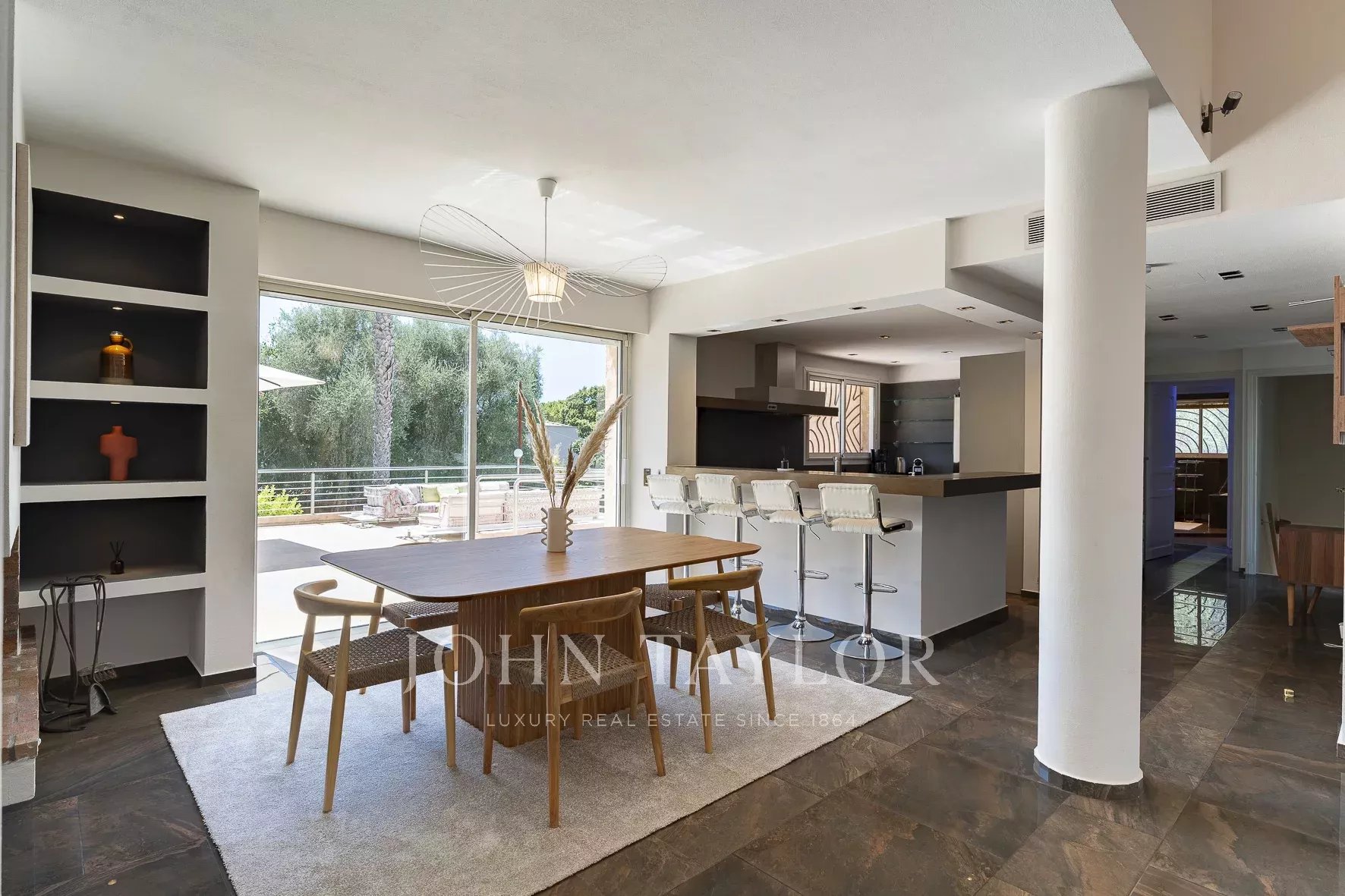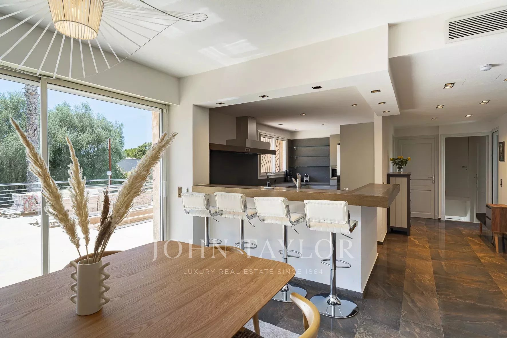 Полностью оборудованная современная кухня открытой планировки, выходящая в столовую
