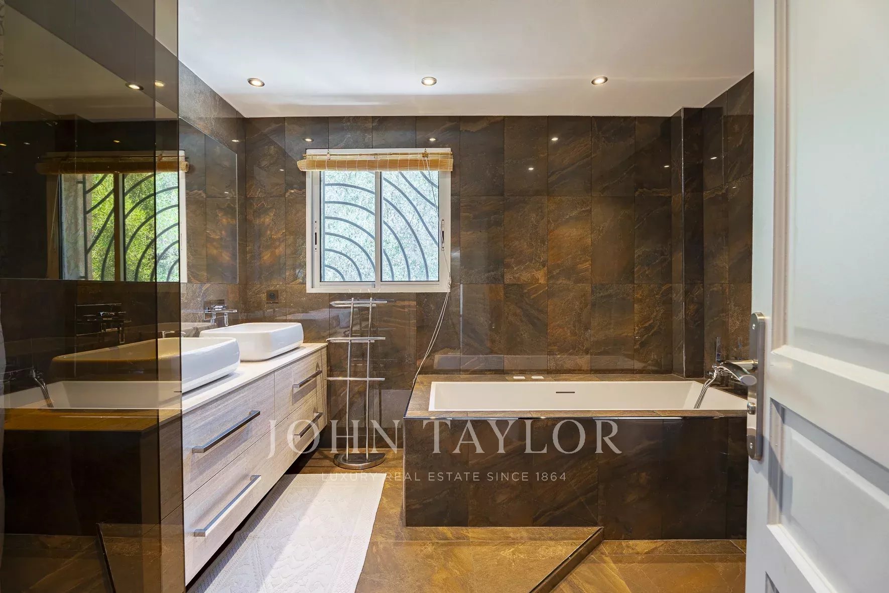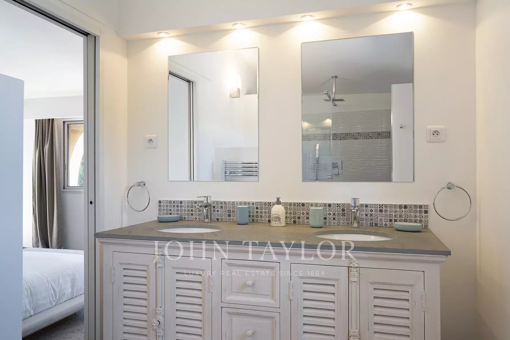 Главная спальня: двуспальная кровать (180 см), душевая комната (двойной умывальник, душ, туалет), 2 частные террасы, шкафы.