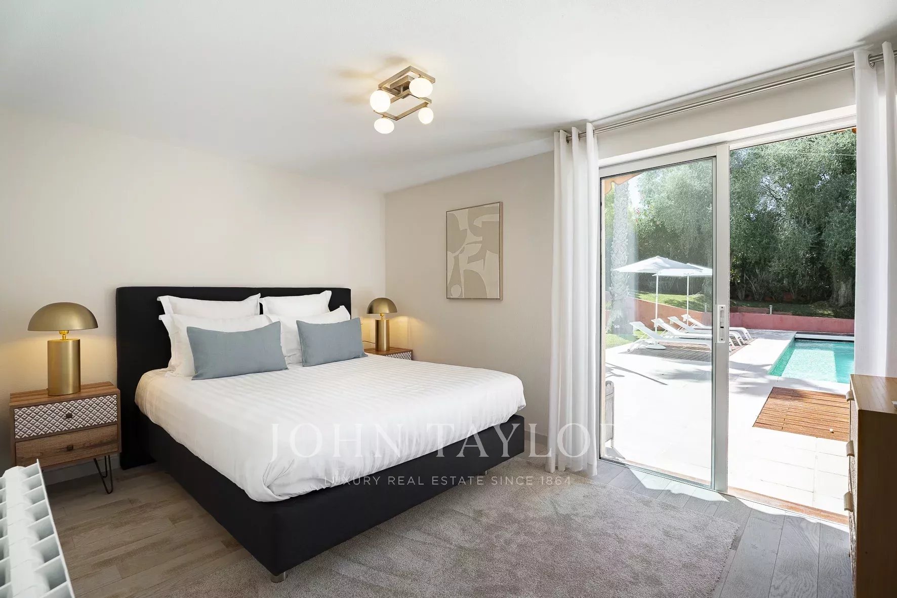 Спальня с двуспальной кроватью (160 см), душевая комната с туалетом, прямой выход к бассейну