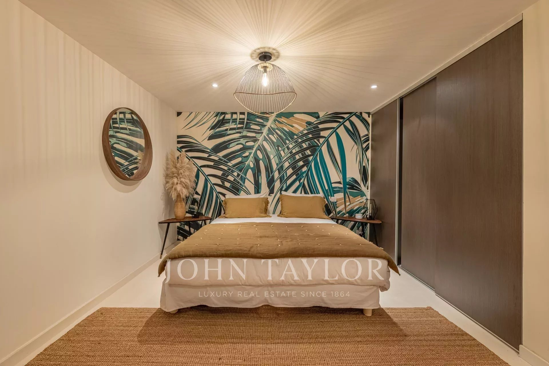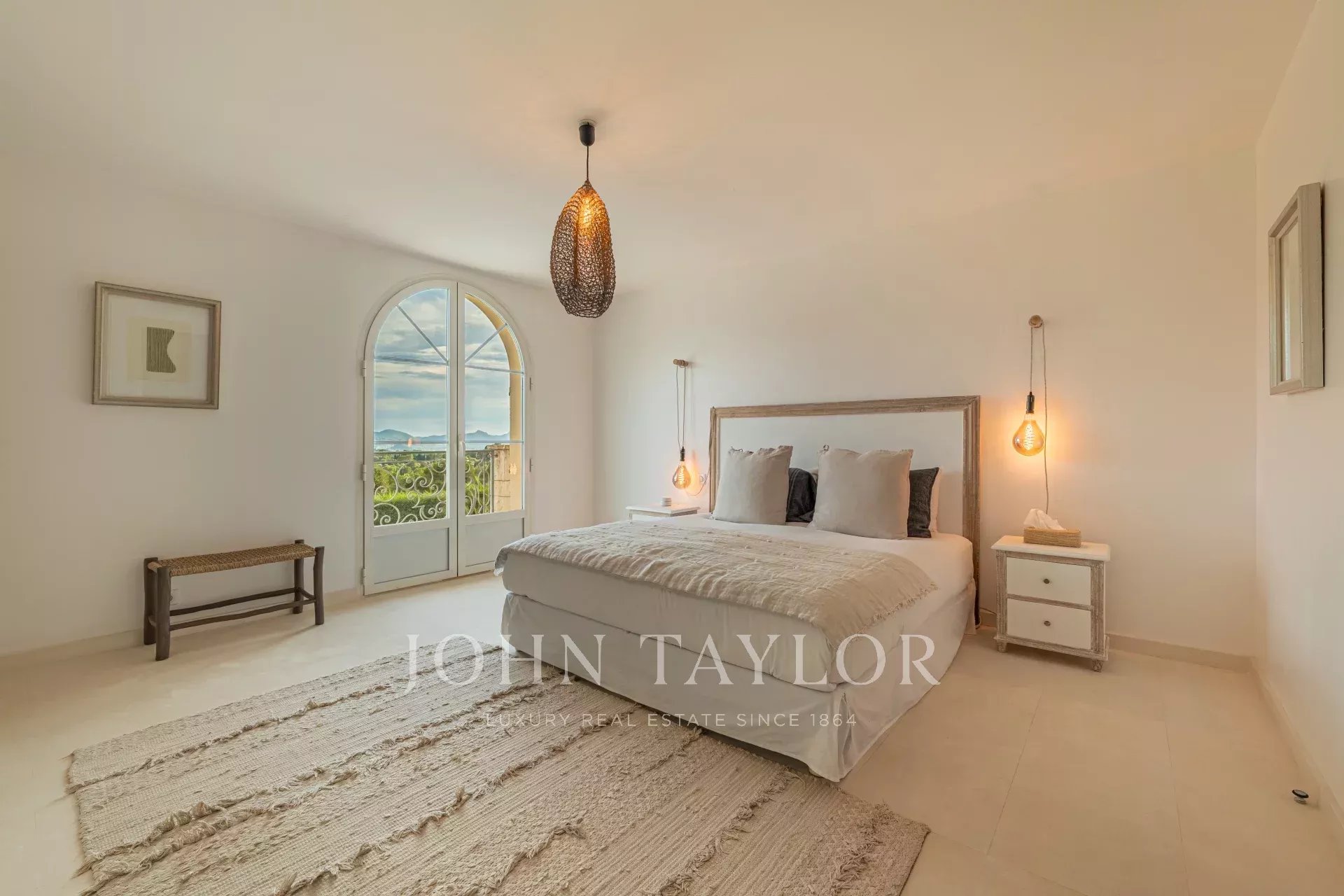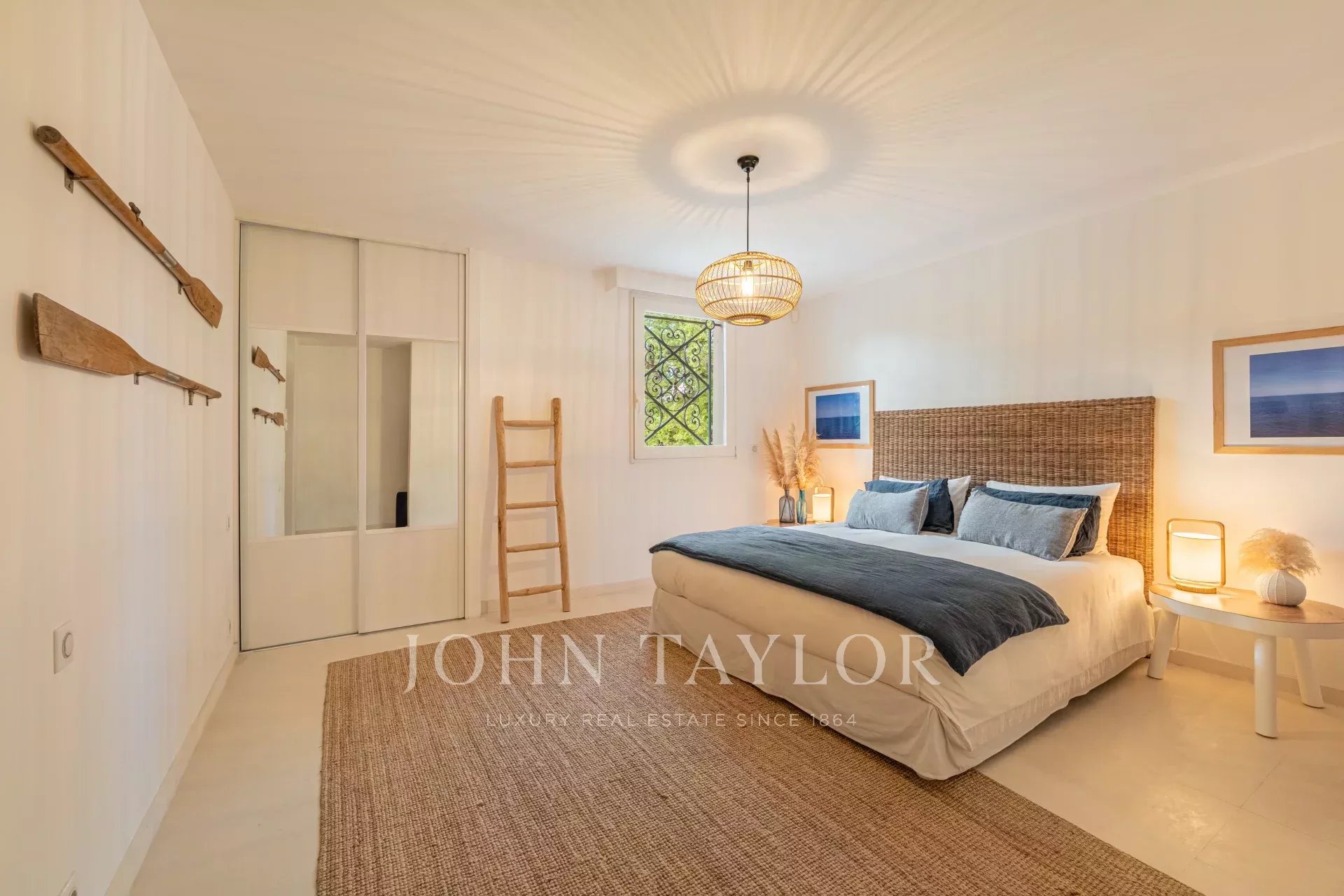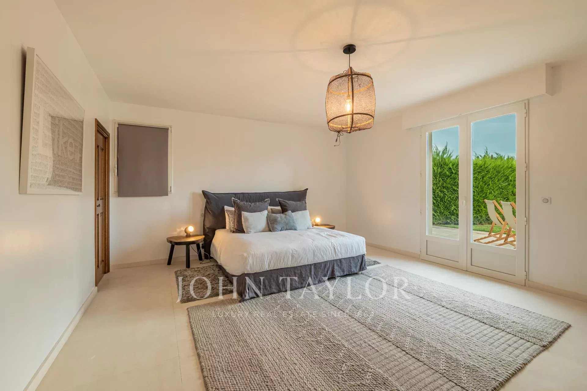 Главная спальня (спальня 1): двуспальная кровать (180 см), гардеробная, ванная комната с ванной, душем и туалетом, прямой выход в сад и к бассейну.