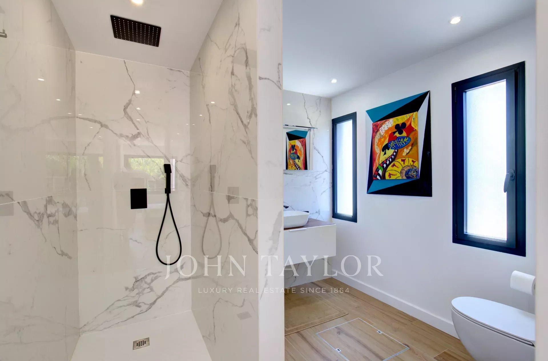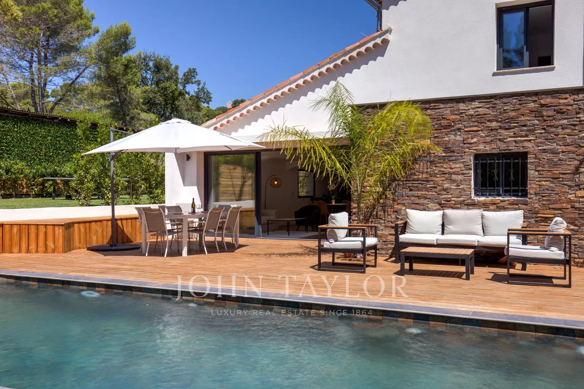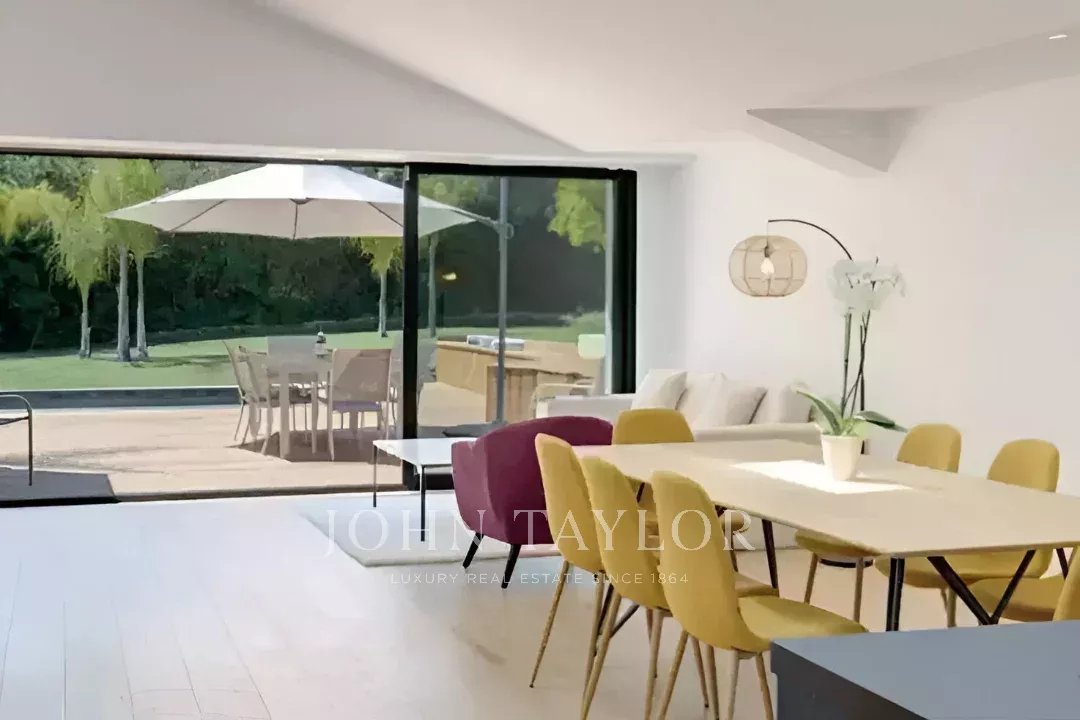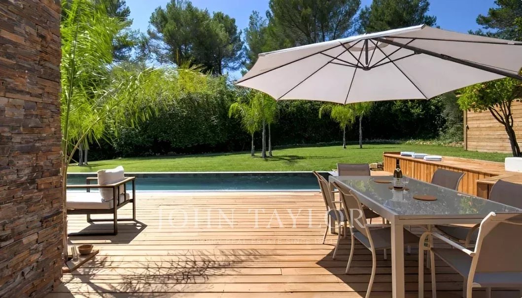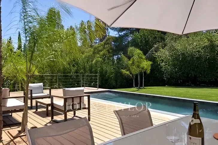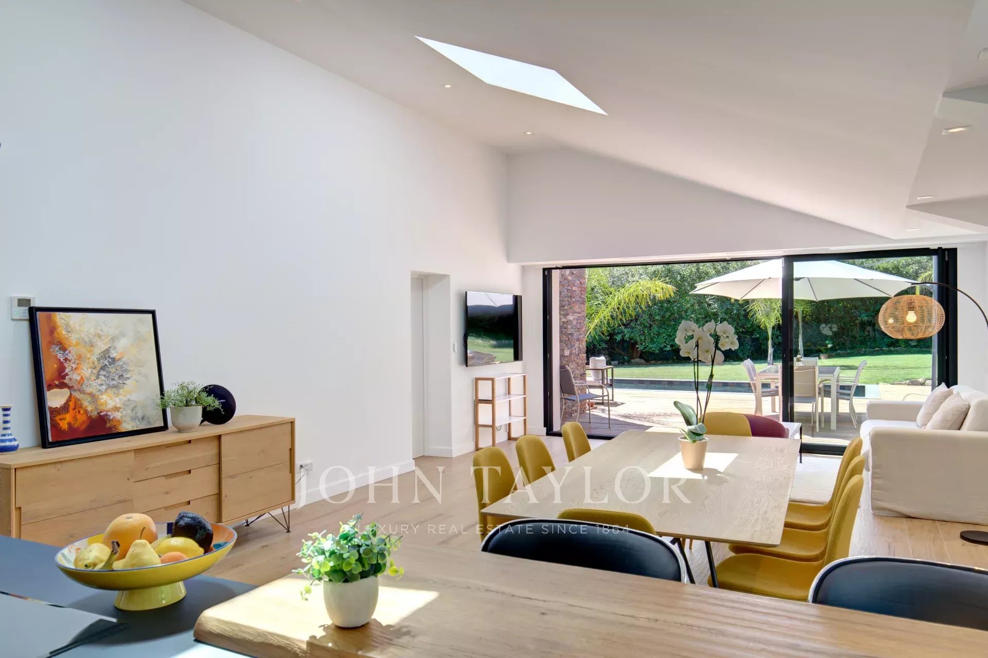 Снаружи есть охраняемый бассейн с подогревом, зонтики, площадка для игры в петанк, обеденная зона с барбекю и зона, оборудованная садовой мебелью. Парковка на 3 машины с электроприводом и гараж на 1 машину.
