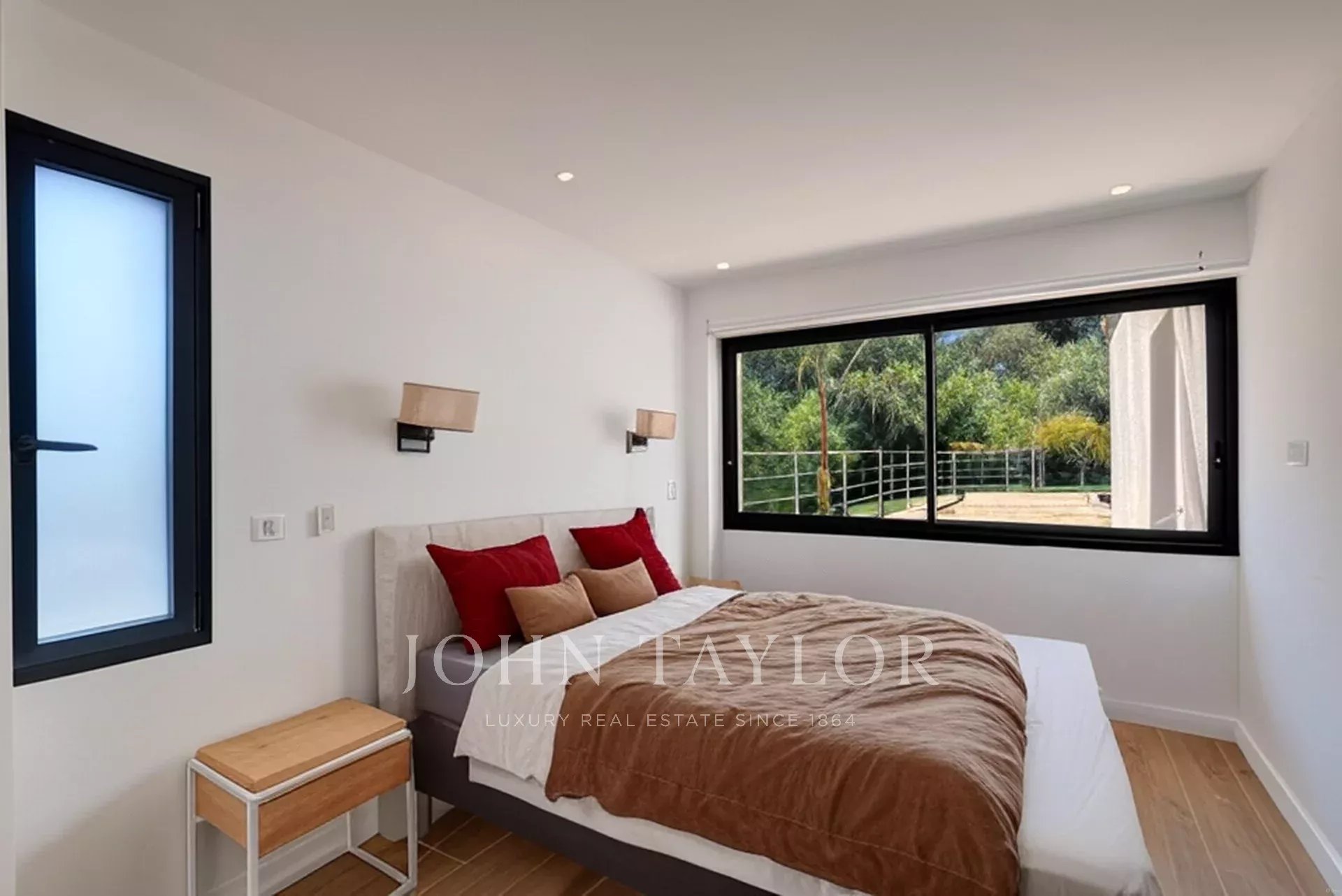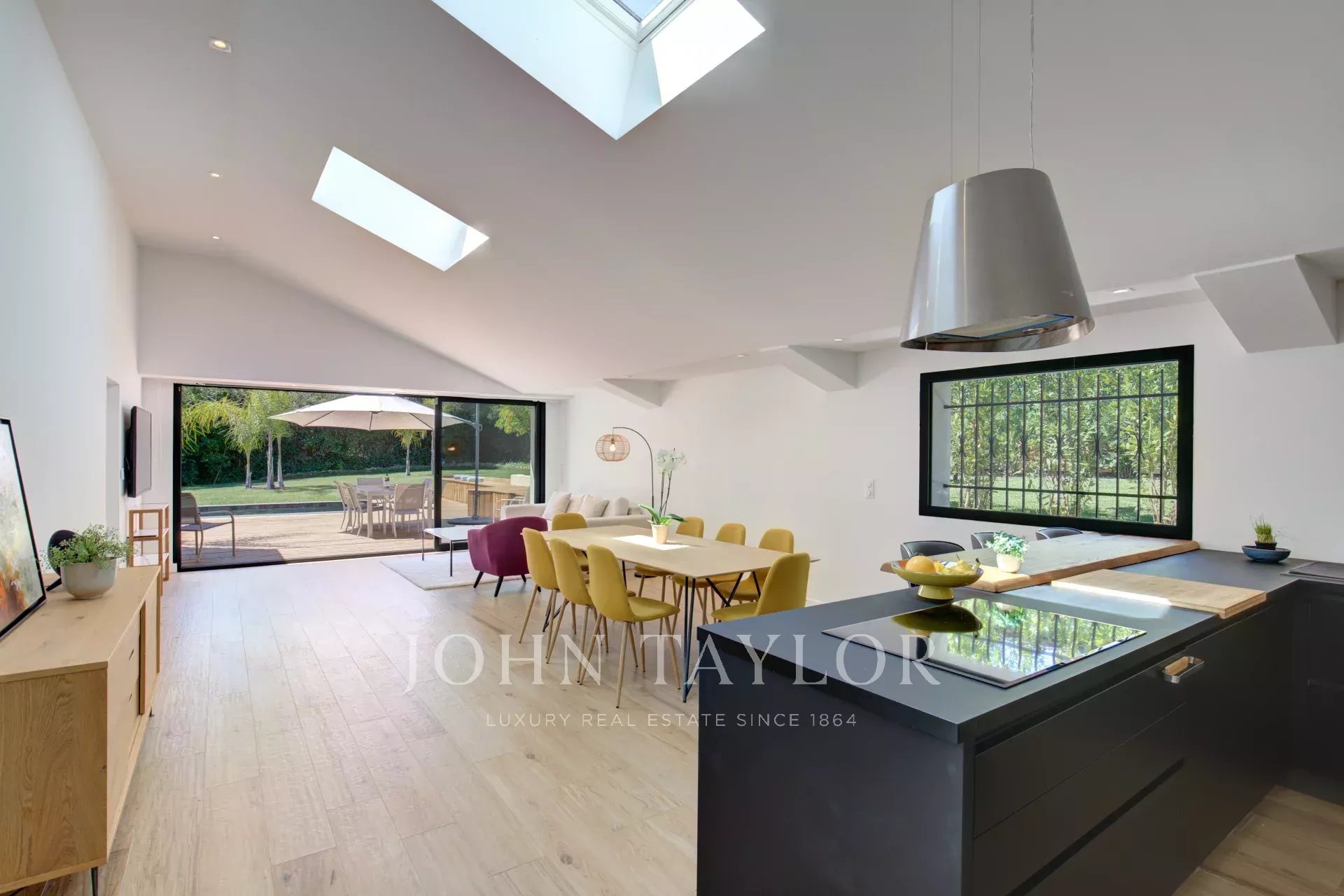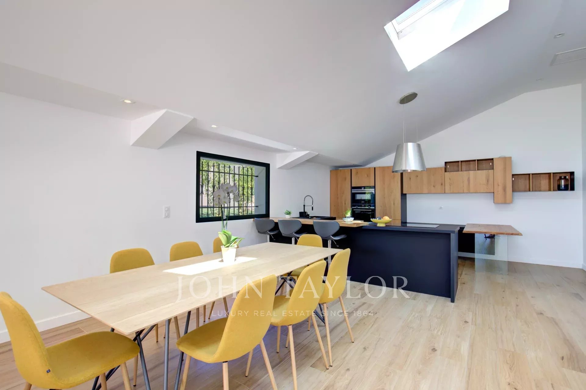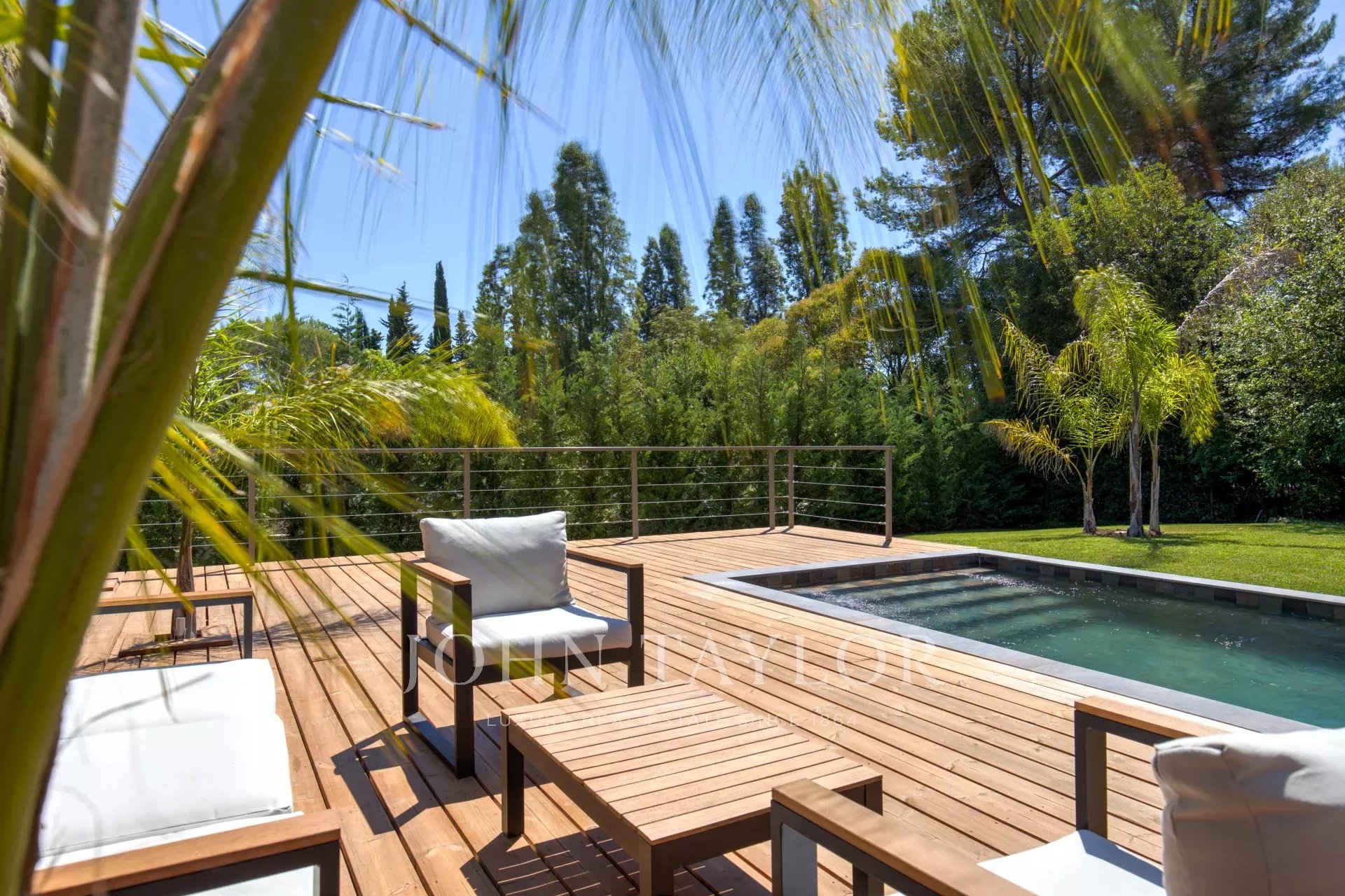 Снаружи есть охраняемый бассейн с подогревом, зонтики, площадка для игры в петанк, обеденная зона с барбекю и зона, оборудованная садовой мебелью. Парковка на 3 машины с электроприводом и гараж на 1 машину.