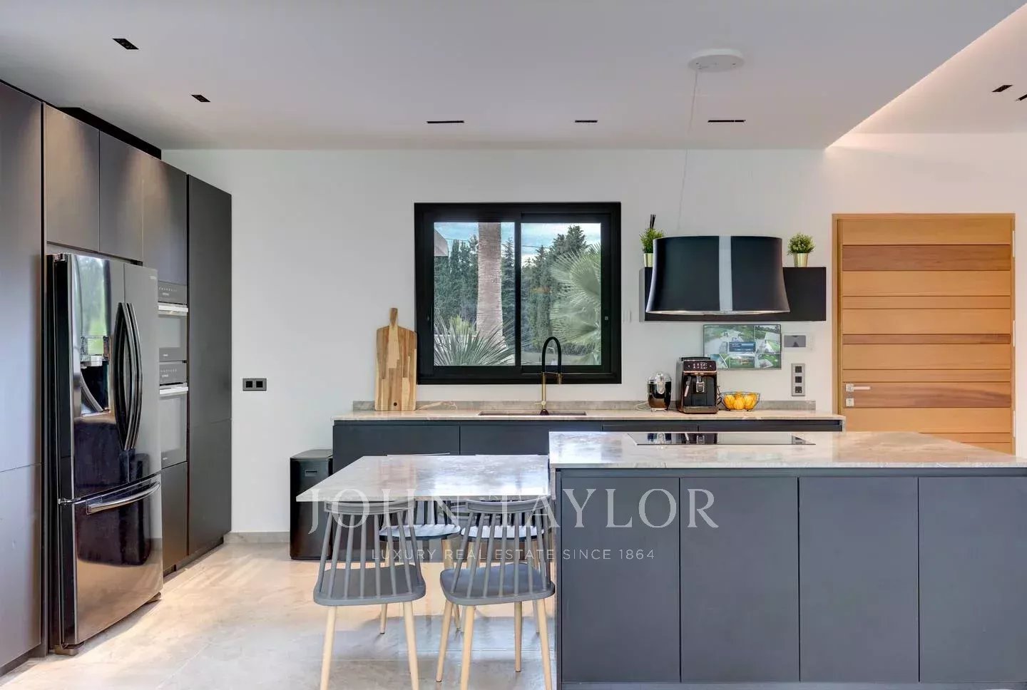 Оборудованная кухня, выходящая в столовую, и гостиная площадью 70 м2, исключительно светлая благодаря большим картинным окнам, выходящим на большую террасу и в сад.