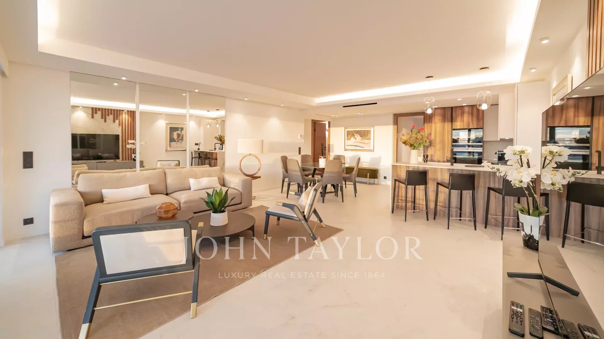 Квартира состоит из большой гостиной с кухней открытого плана, выходящей на террасу, обращенную на юго-запад, 3 спален с ванными комнатами.