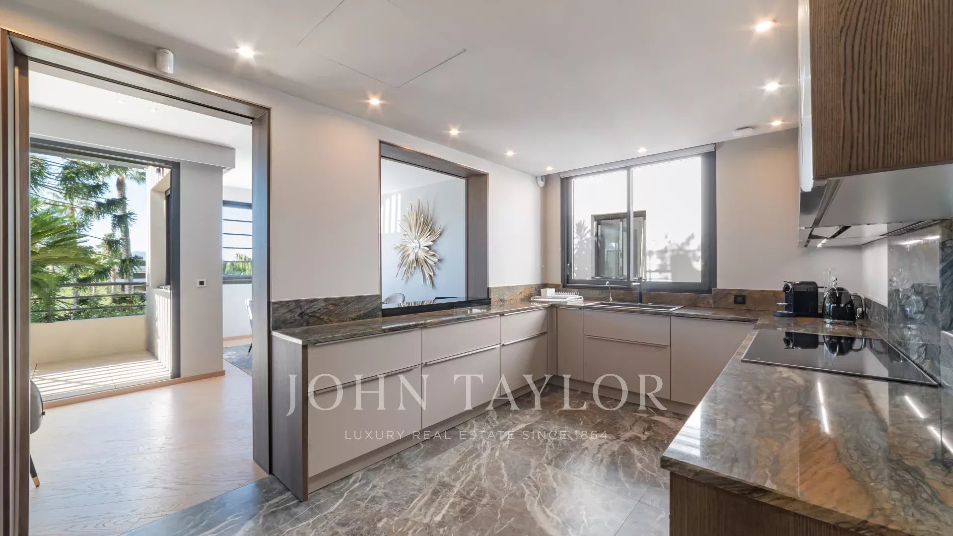 Квартира состоит из просторной прихожей, гостиной-столовой площадью 70 м², кухни с прилегающей кладовой, подсобного помещения, главной спальни, трех спален с ванными комнатами, гостевого туалета и большой террасы площадью 72 м².