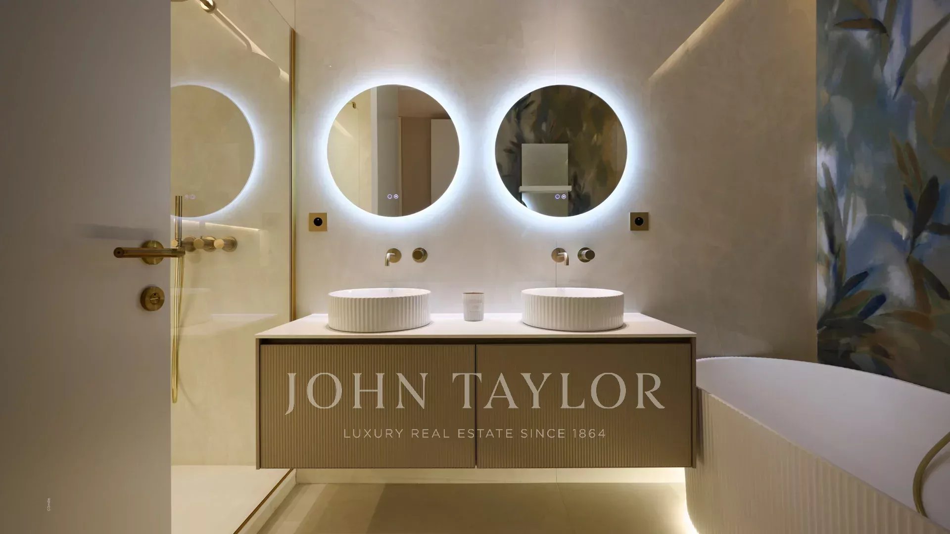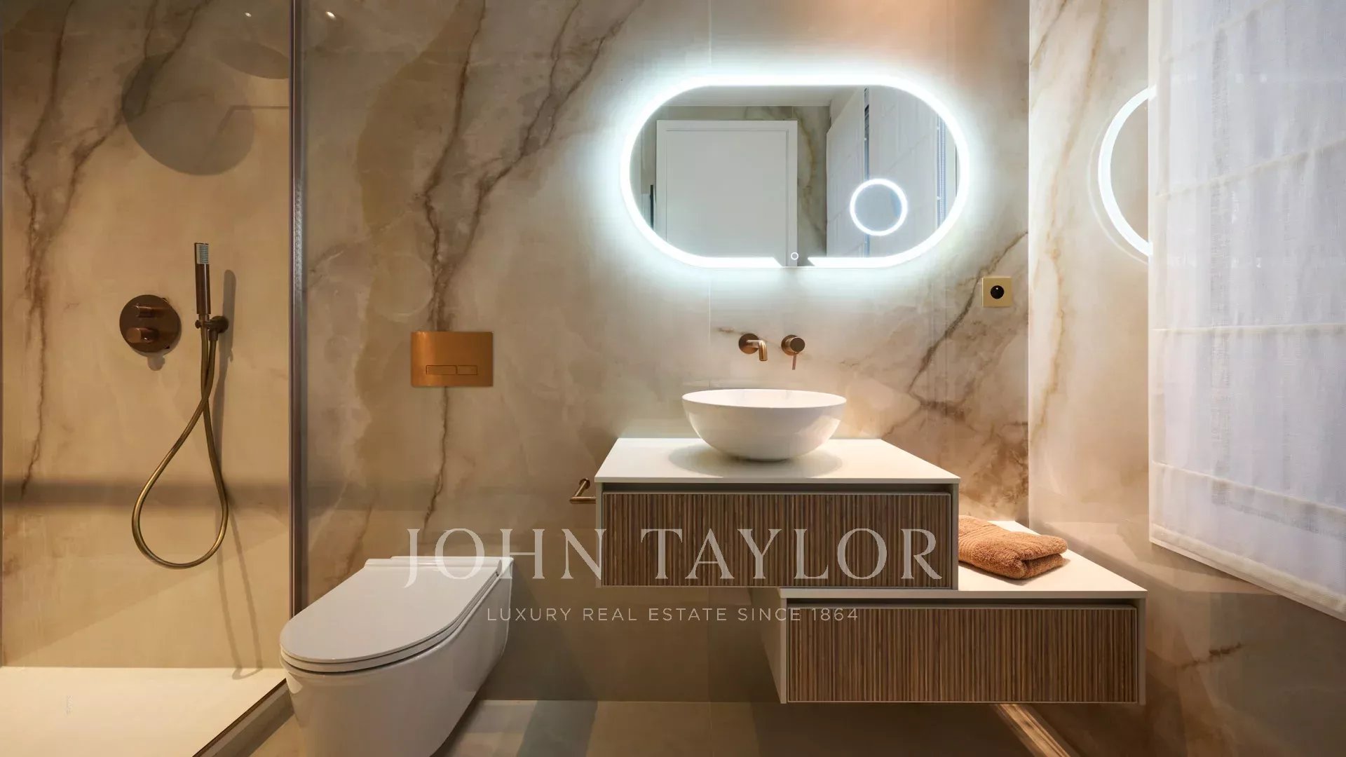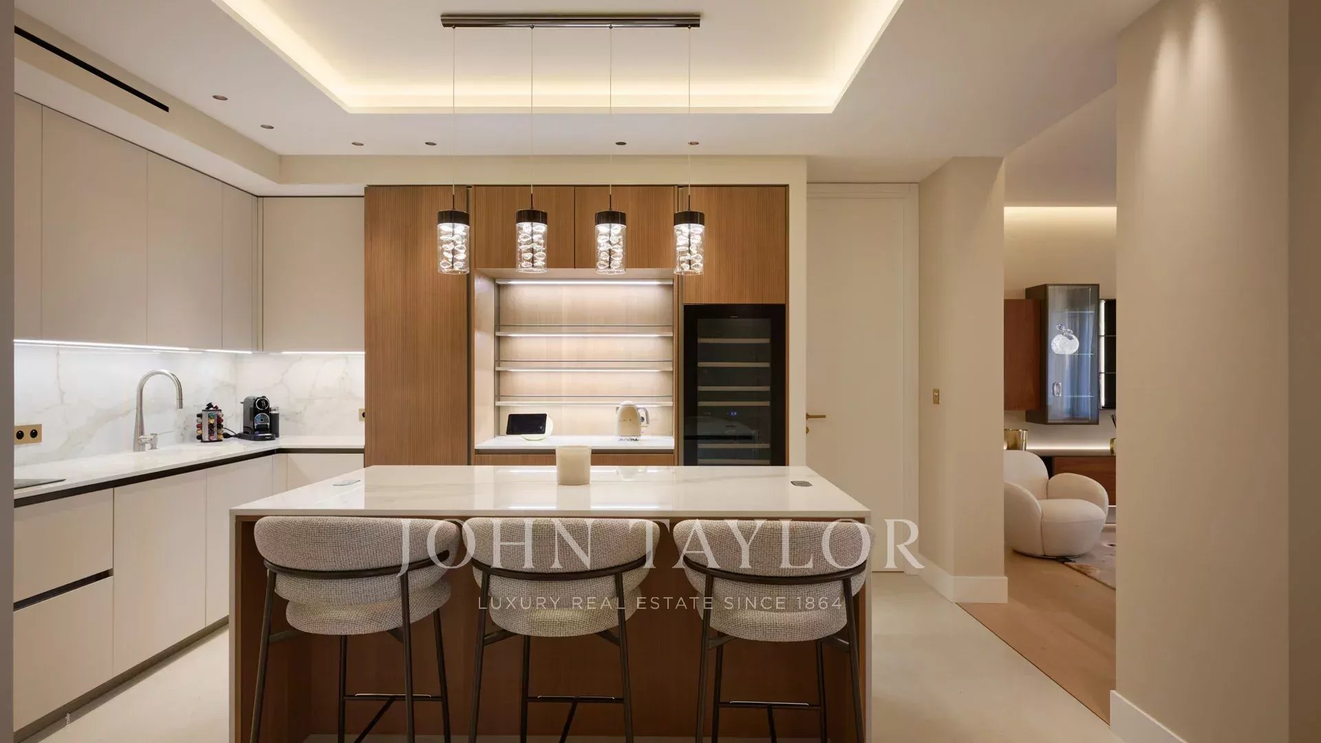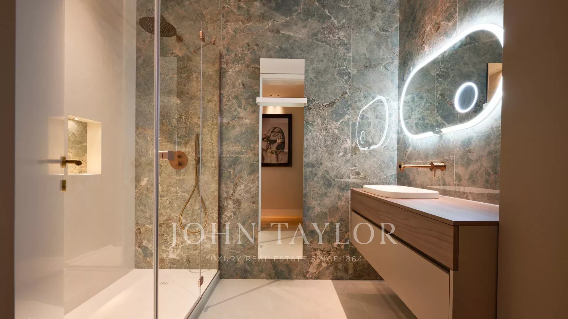 Квартира состоит из прихожей, кухни открытой планировки, выходящей в просторную гостиную и светлую столовую. В квартире есть три спальни с ванными комнатами, каждая со своей душевой, а также гостевой туалет и прачечная.
