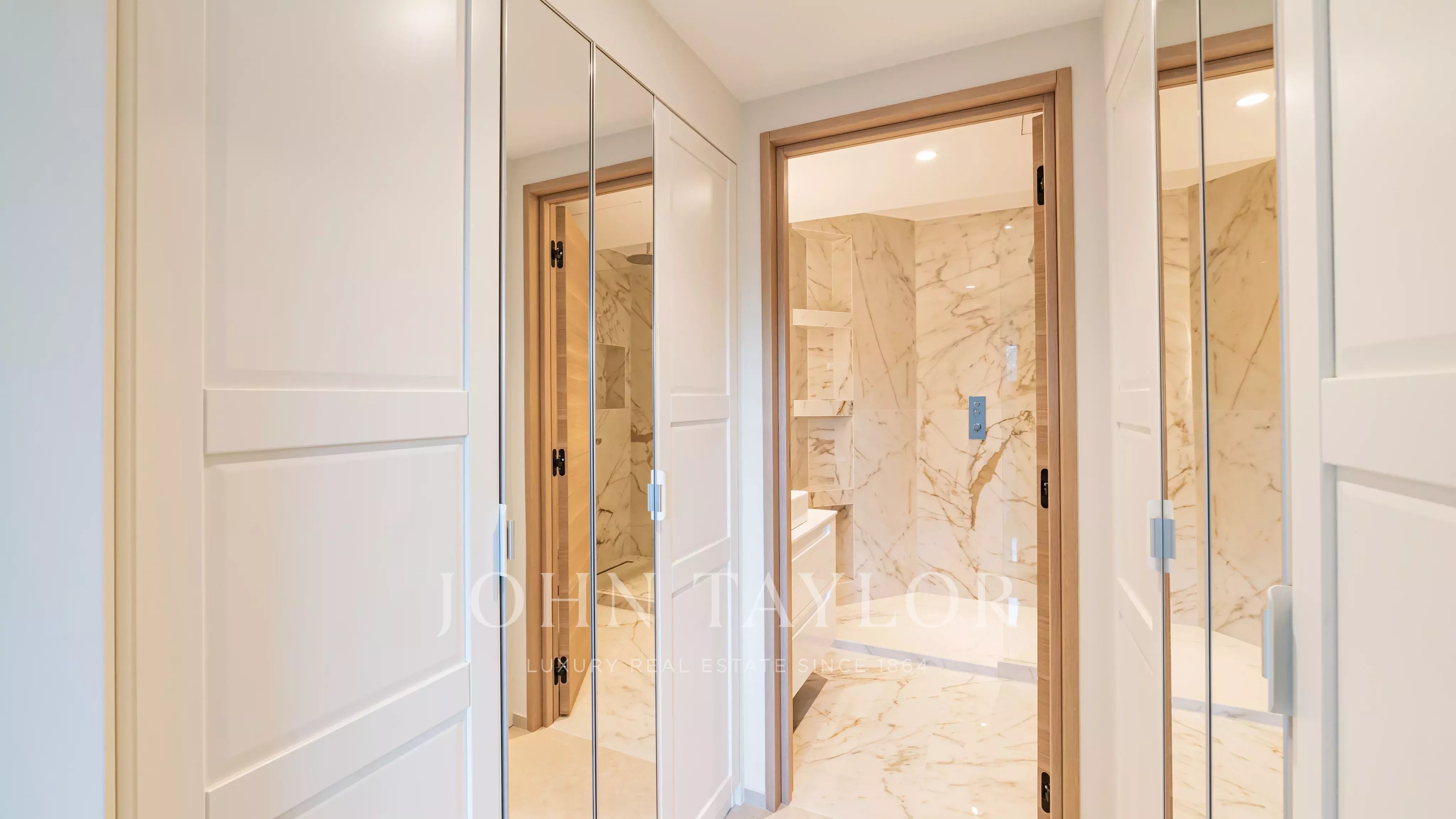 Она состоит из прихожей, гостиной с обеденной зоной, выходящей на террасу площадью 11,85 м², полностью оборудованной кухни и двух спален, каждая из которых имеет собственную душевую комнату и гардеробную.