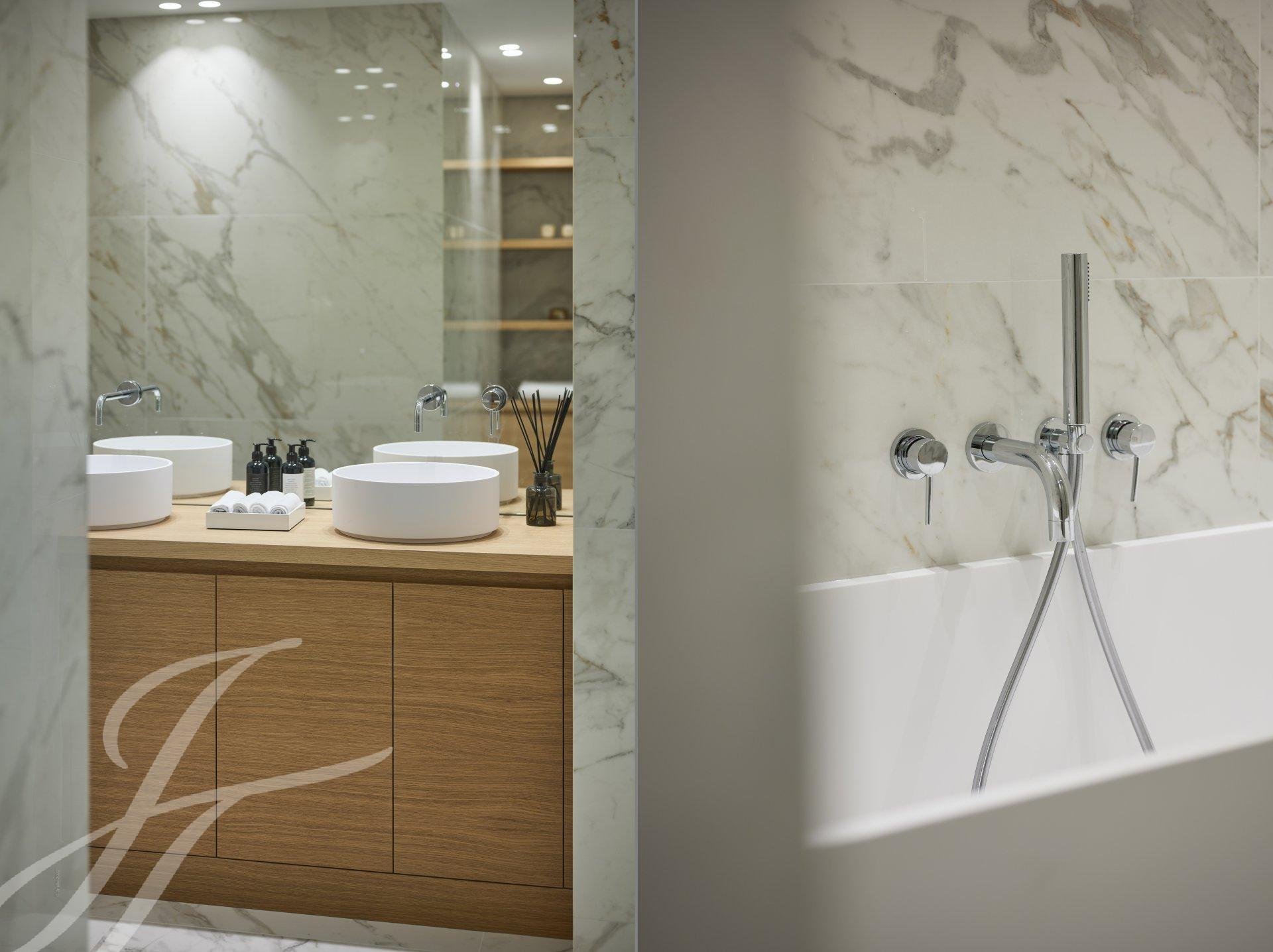 Она состоит из большой гостиной с кухней открытого плана, выходящей на террасу площадью 23 м², главной спальни с гардеробной и ванной комнатой, а также двух других спален с душевыми комнатами.