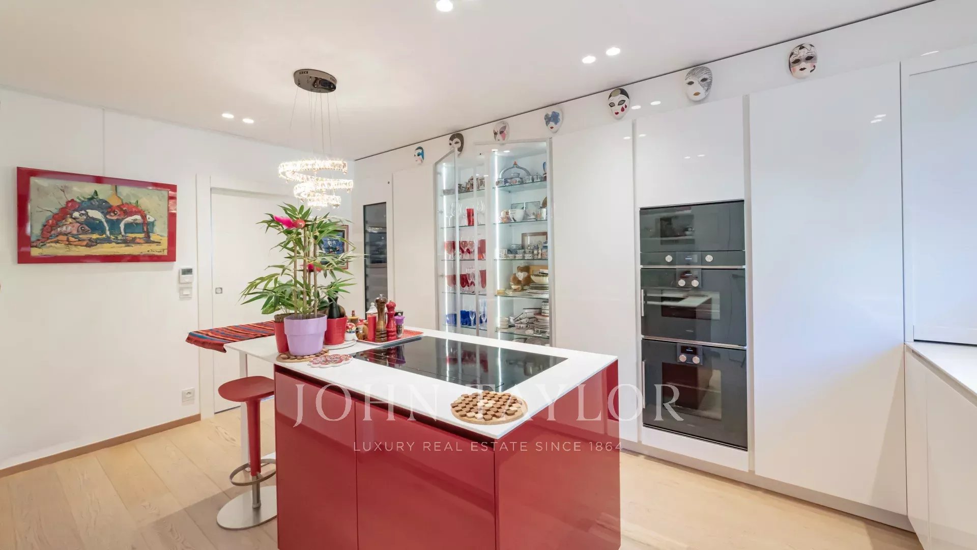 Площадь квартиры составляет около 170 м². Она включает в себя прихожую, гостевой туалет, кабинет, который можно переоборудовать в спальню, большую гостиную, полностью оборудованную отдельную кухню с подсобным помещением, а также две спальни с ванными комнатами, гардеробными и душевыми.