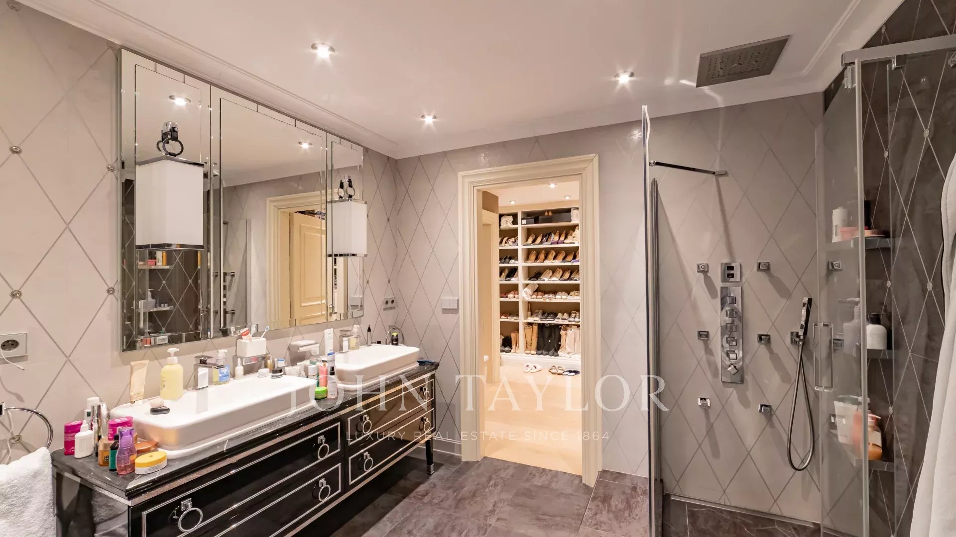- Первый этаж: прихожая, две спальни с ванными комнатами, гостиная, столовая, холл, оборудованная кухня, гостевой туалет, спальня 3 с душевой комнатой, спальня 4 с собственной душевой комнатой и гардеробной.