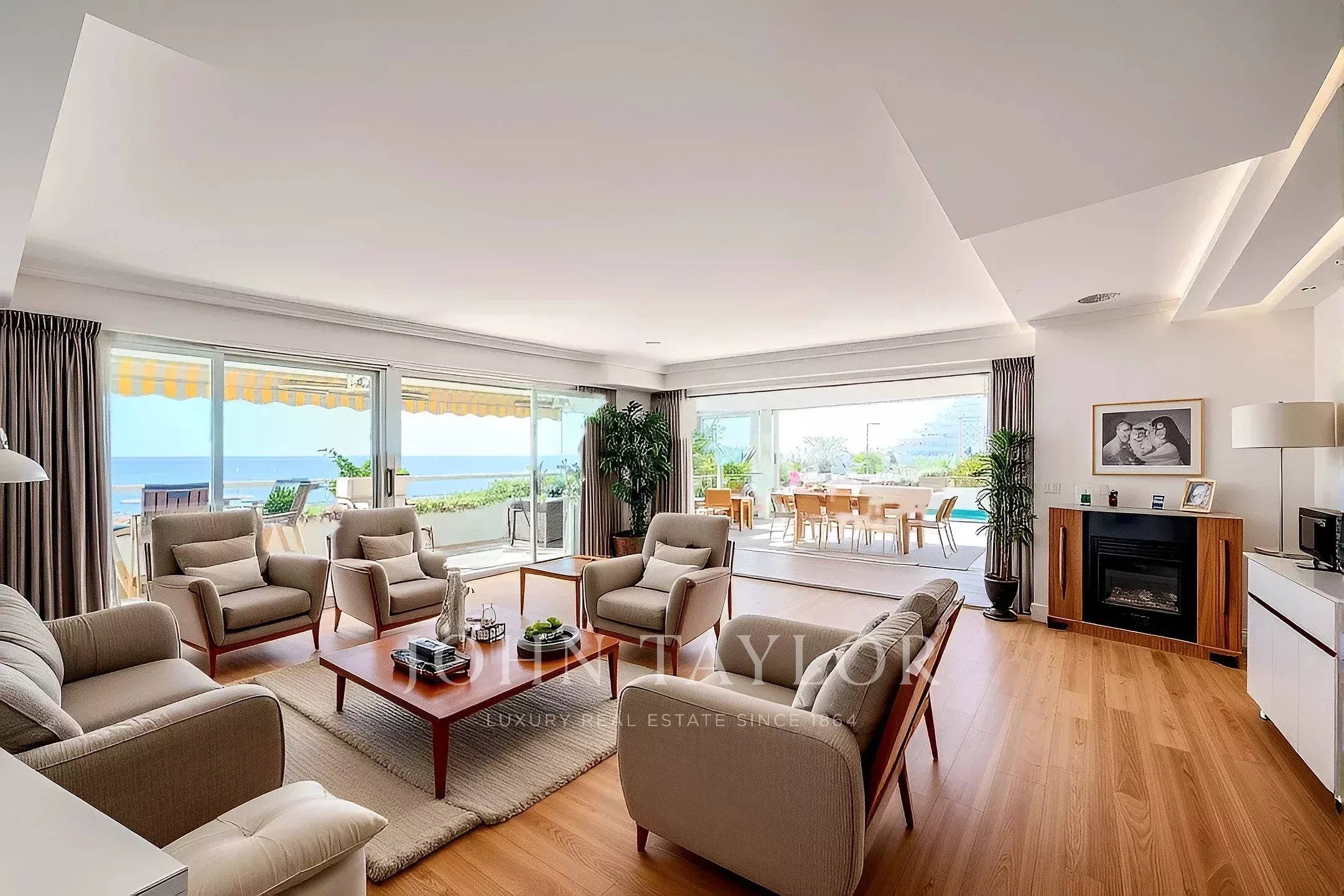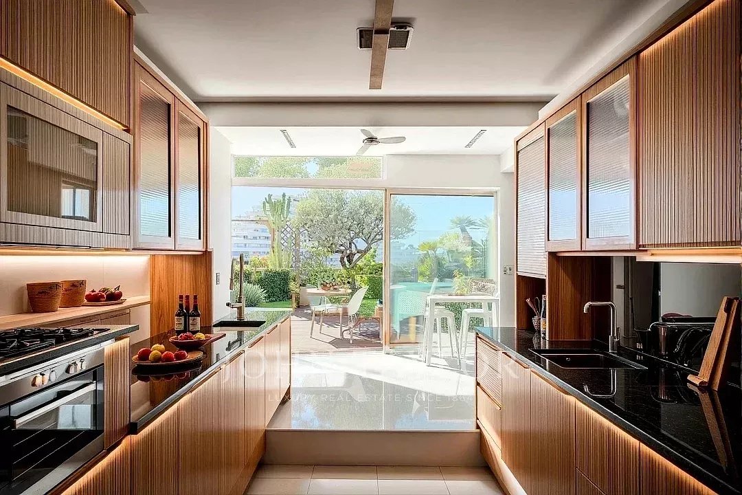 Светлая прихожая, гостиная и кухня выходят на огромную прямоугольную террасу с беспрерывным видом на Средиземное море, пристань для яхт и Кап д'Антиб!