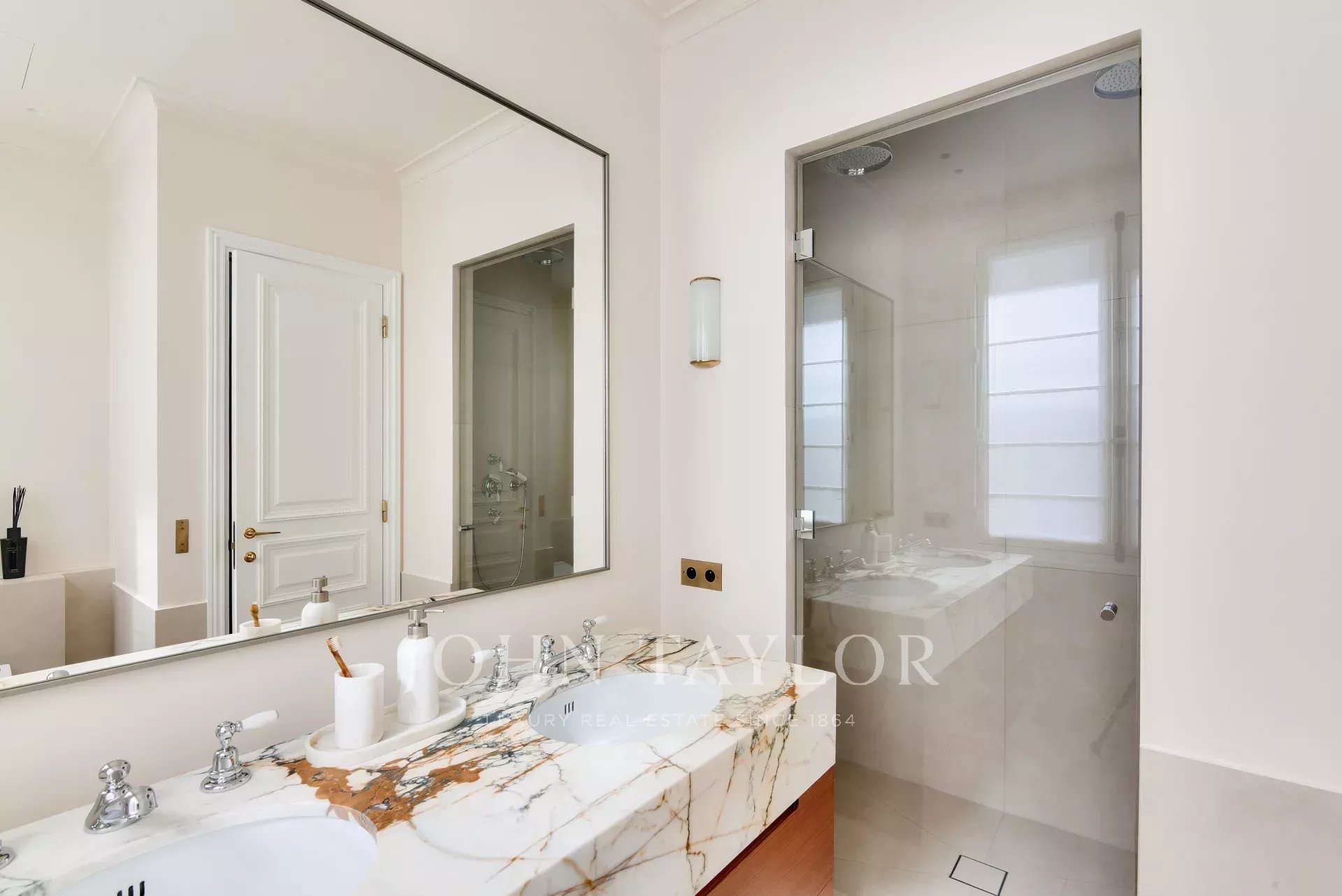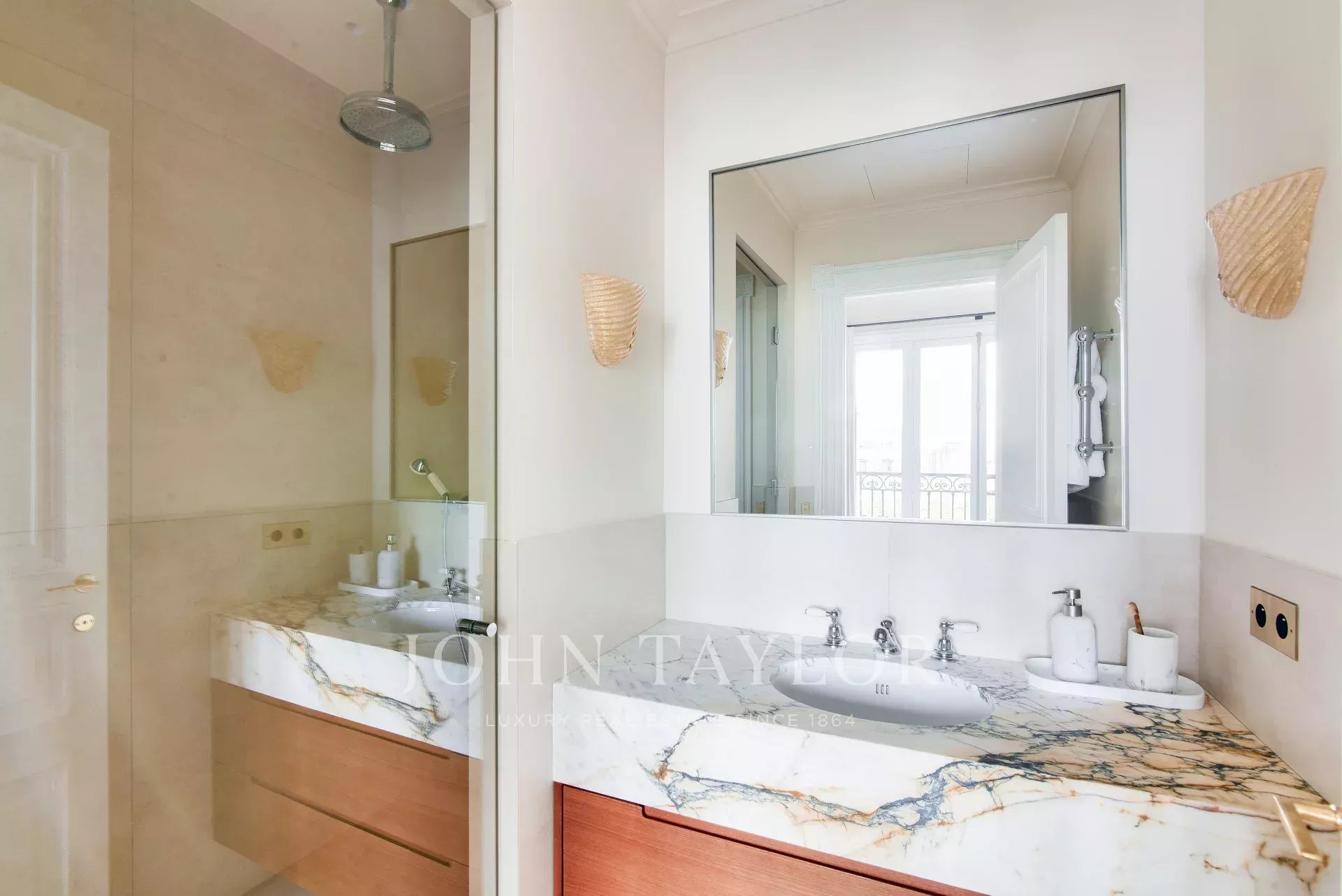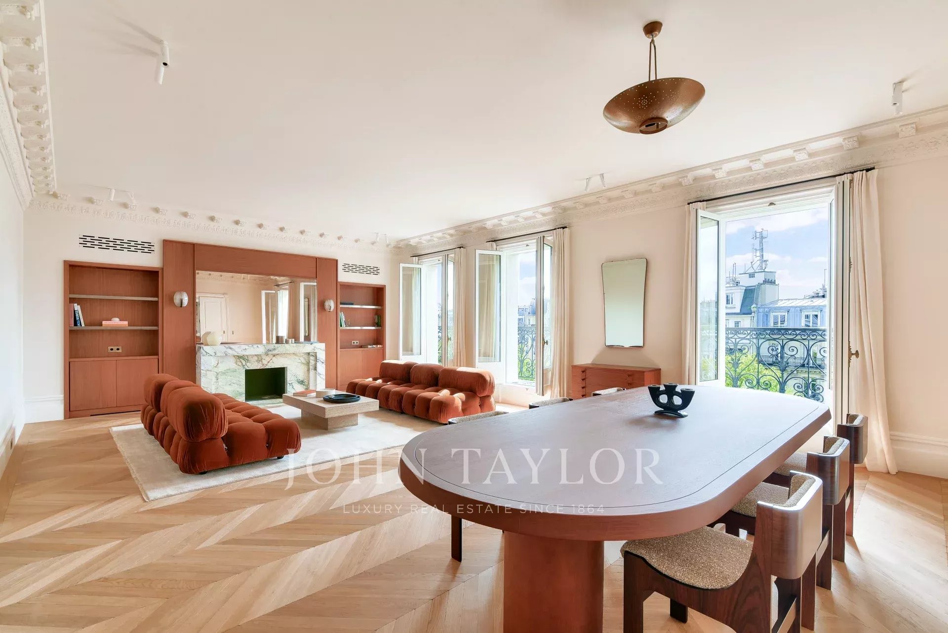 В роскошном каменном здании с лифтом, обслуживающим персоналом и изысканными коммунальными зонами мы предлагаем вам, только на пятом этаже, ориентированном на юг, очень элегантную проходную квартиру, отремонтированную архитектором Пьером Лакруа, площадью 180 м² (по закону Carrez) и балконом 10 м² с беспрепятственным видом на парижские памятники из гостиных и кухни.