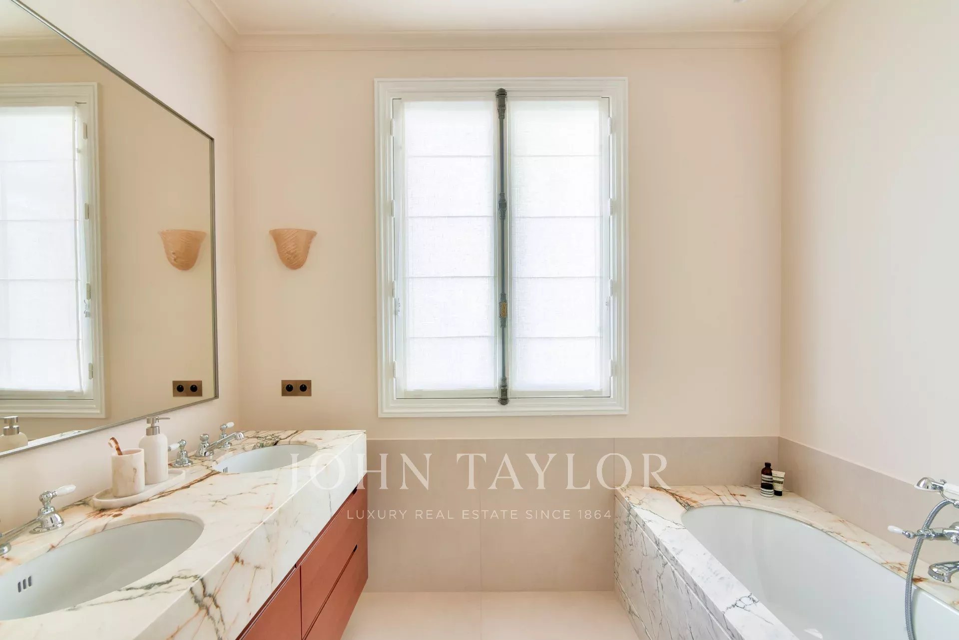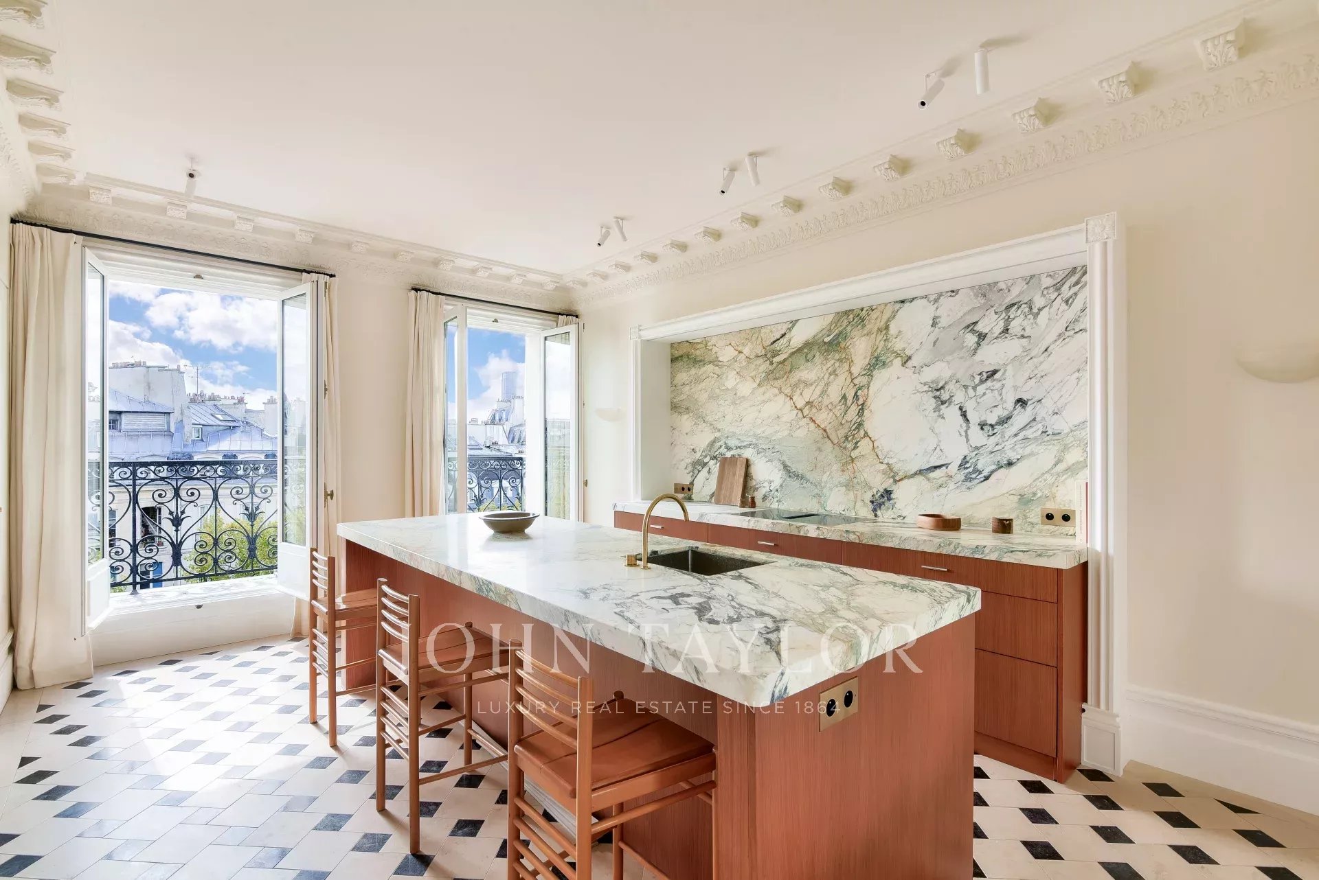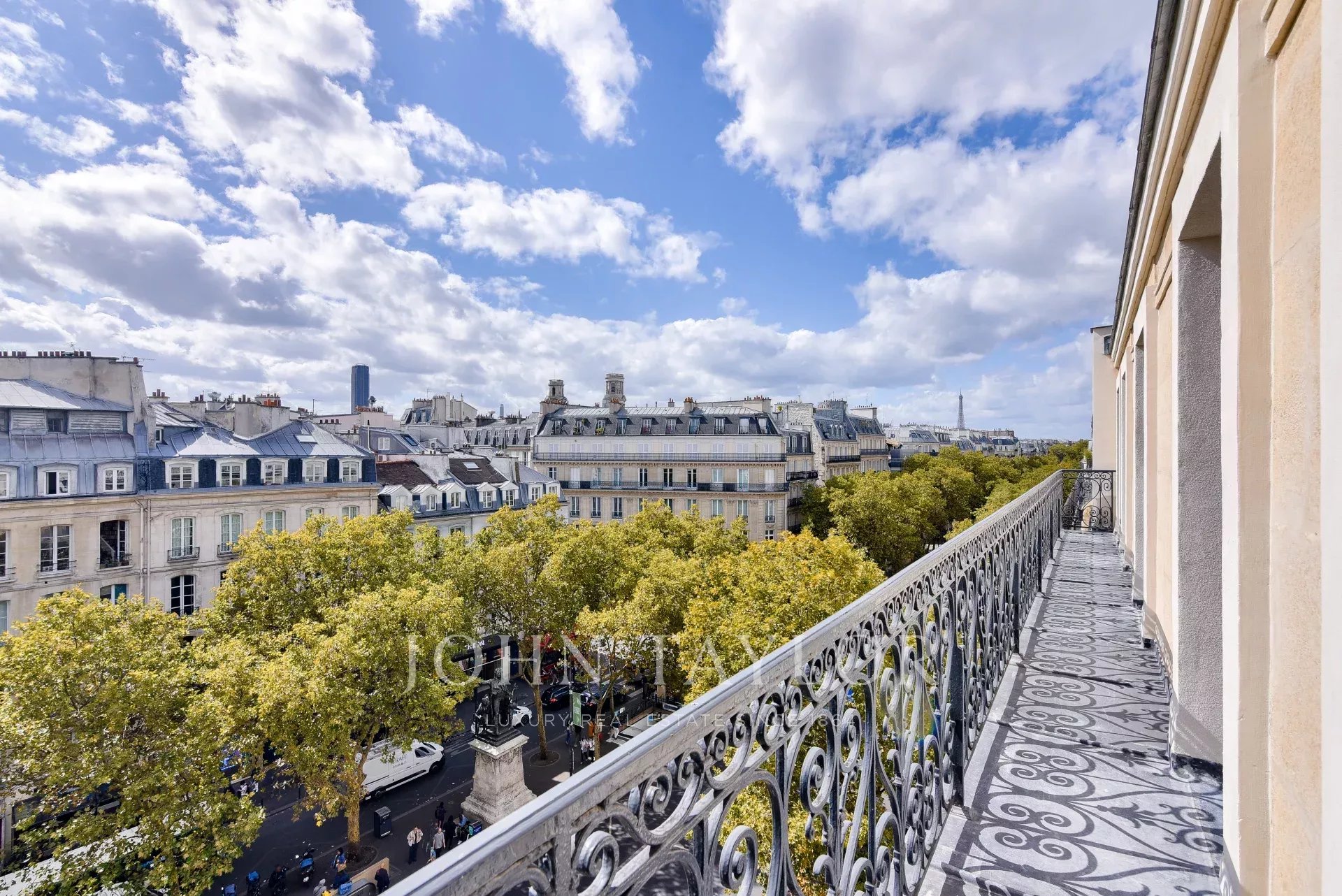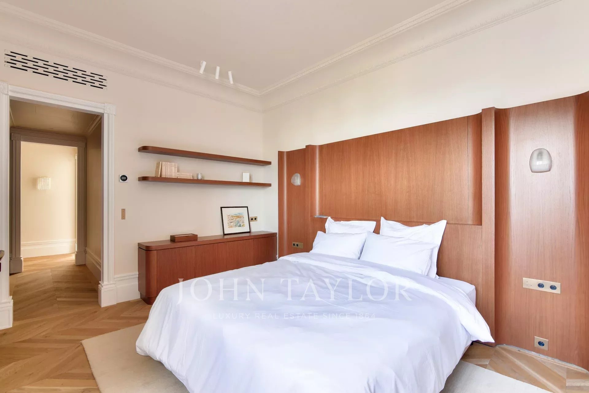 В роскошном каменном здании с лифтом, обслуживающим персоналом и изысканными коммунальными зонами мы предлагаем вам, только на пятом этаже, ориентированном на юг, очень элегантную проходную квартиру, отремонтированную архитектором Пьером Лакруа, площадью 180 м² (по закону Carrez) и балконом 10 м² с беспрепятственным видом на парижские памятники из гостиных и кухни.