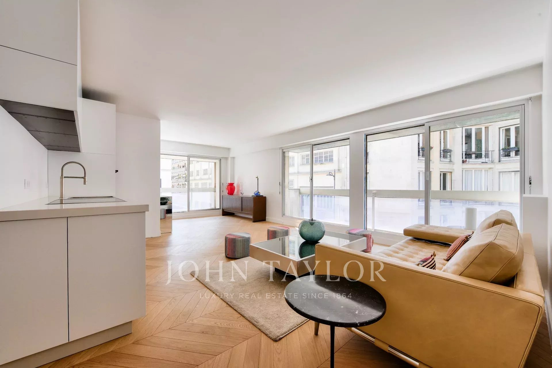 - Светлая двойная гостиная с оборудованной кухней открытого плана, выходящая на два балкона,