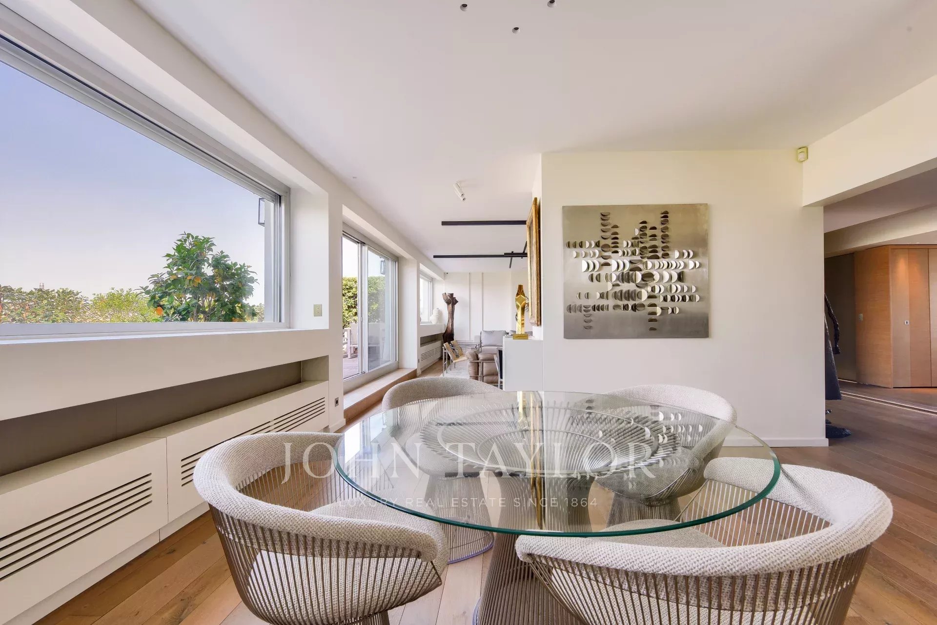 - Гостиная и столовая площадью 52 м², выходящая на большую террасу площадью 40 м², засаженную деревьями.