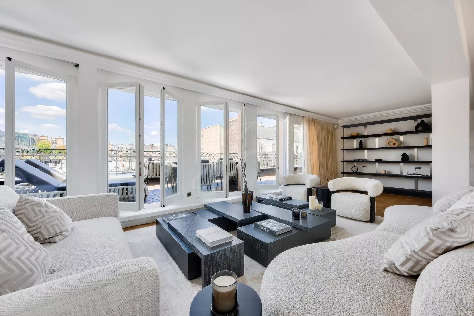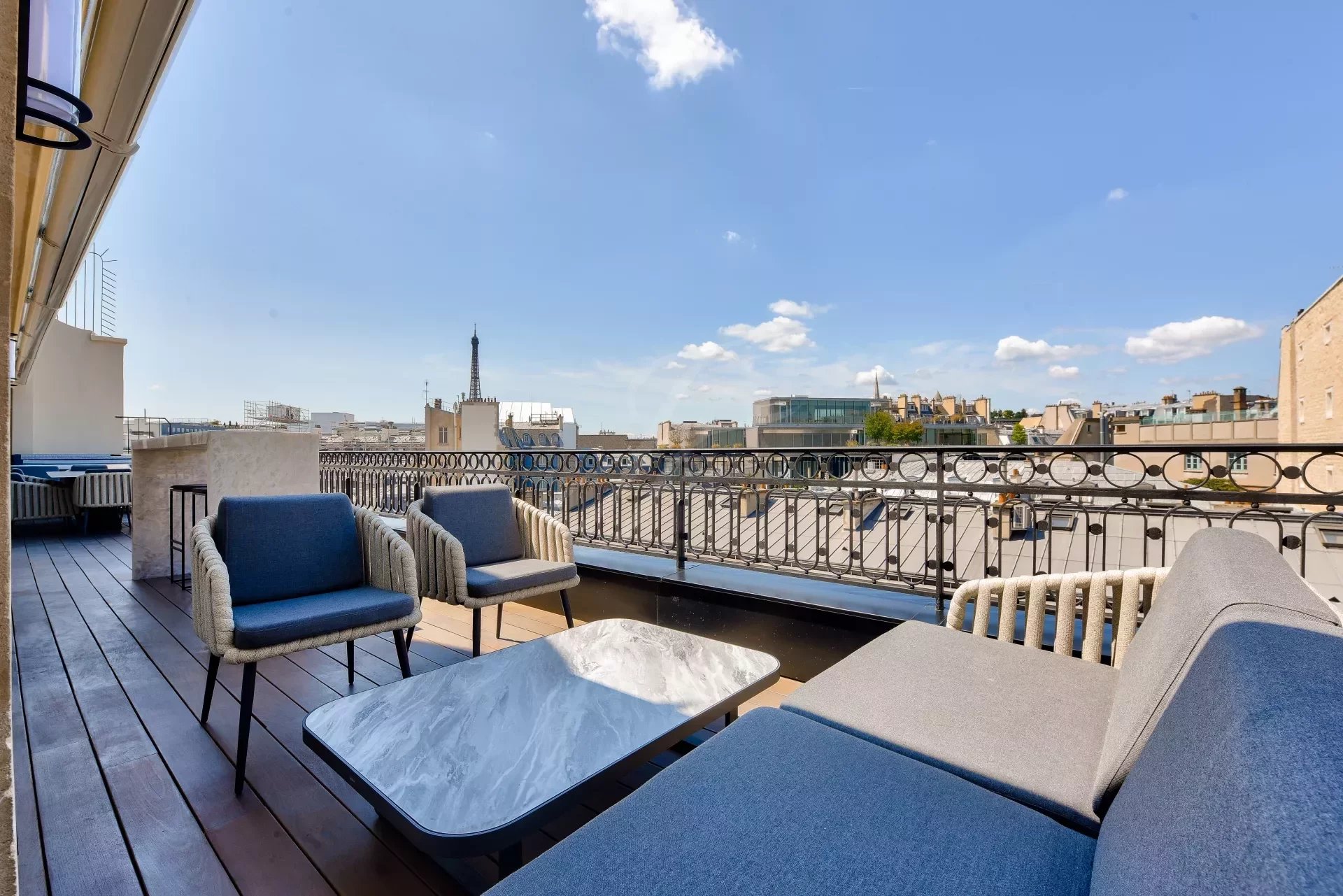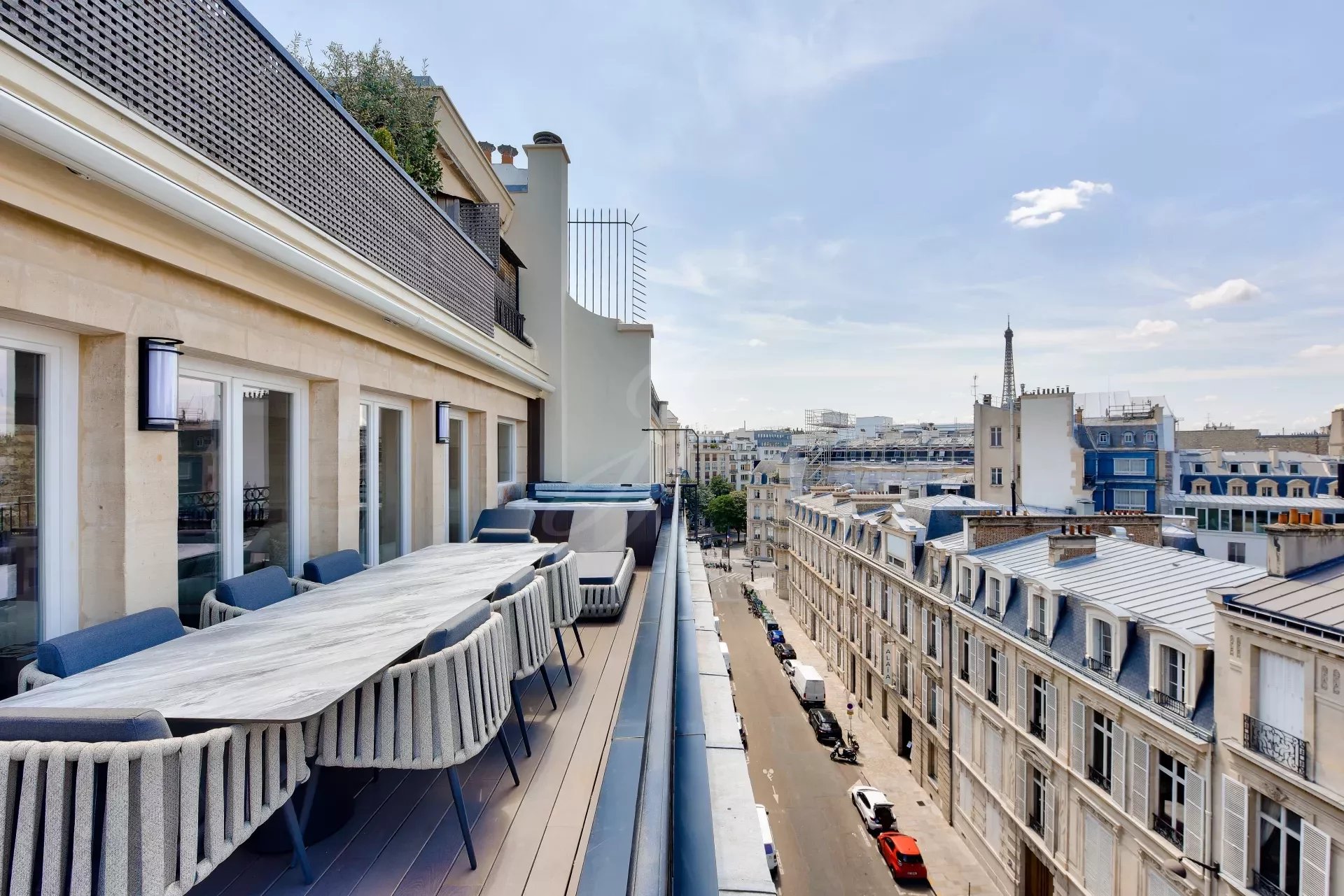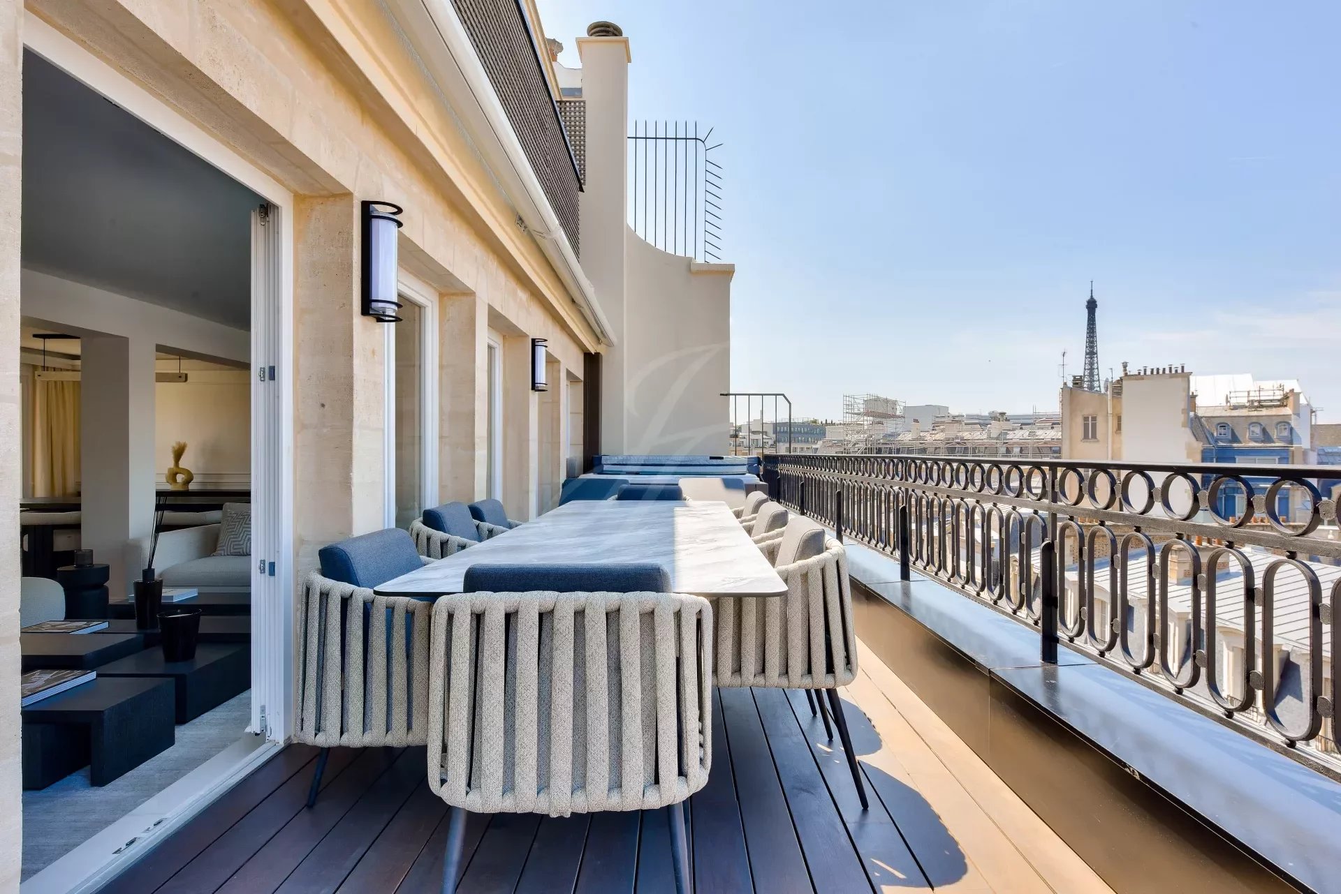 Из гостиной и главной спальни есть прямой выход на террасу на первом этаже с видом на Эйфелеву башню. На этой террасе есть открытая гостиная, мраморная летняя кухня с баром, обеденная зона на восемь персон, зона отдыха и джакузи. По всей длине террасы можно установить электрические жалюзи.
