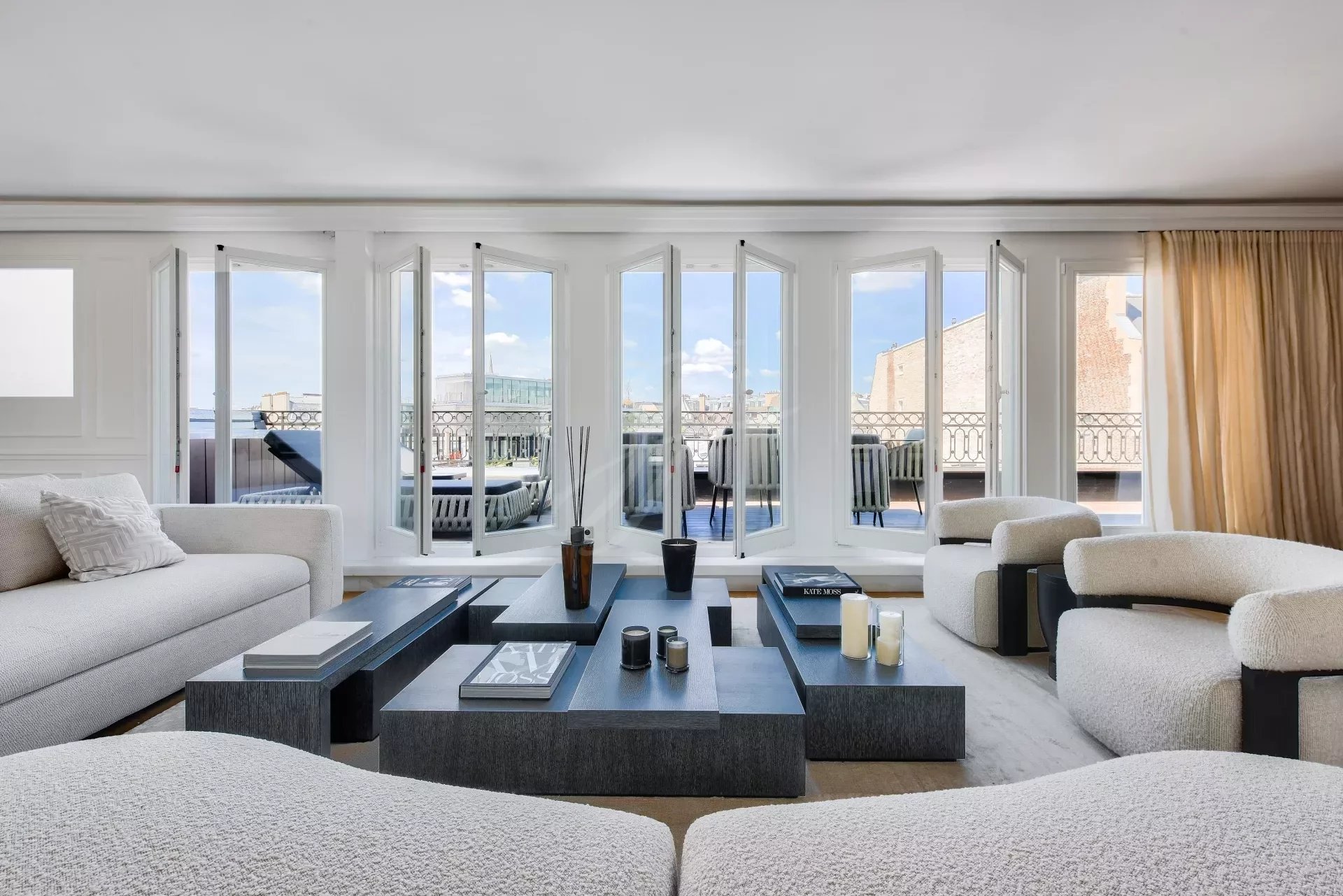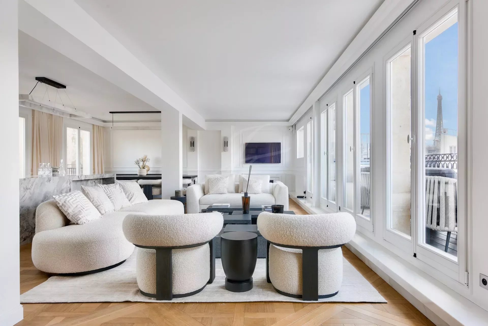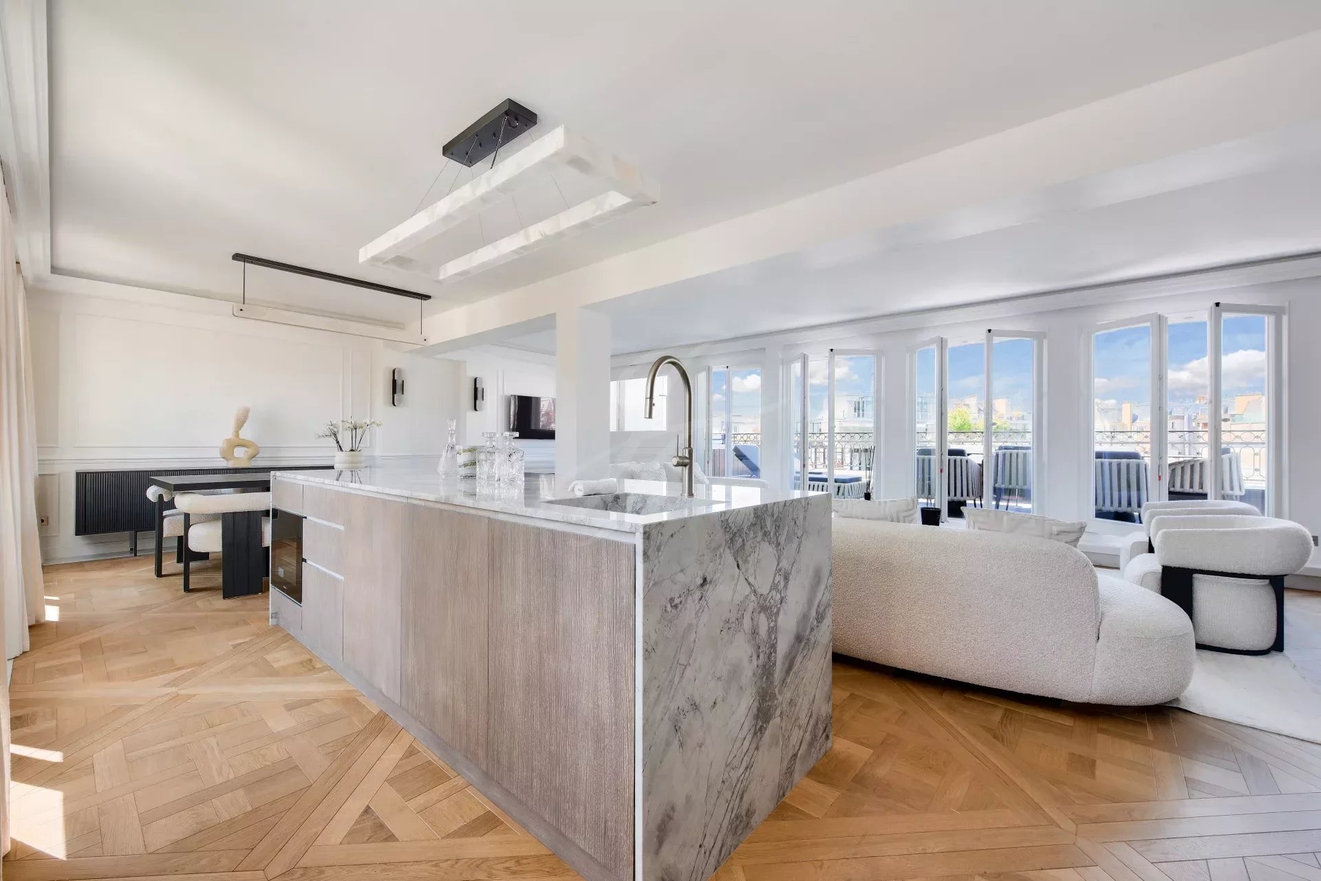 Из гостиной и главной спальни есть прямой выход на террасу на первом этаже с видом на Эйфелеву башню. На этой террасе есть открытая гостиная, мраморная летняя кухня с баром, обеденная зона на восемь персон, зона отдыха и джакузи. По всей длине террасы можно установить электрические жалюзи.