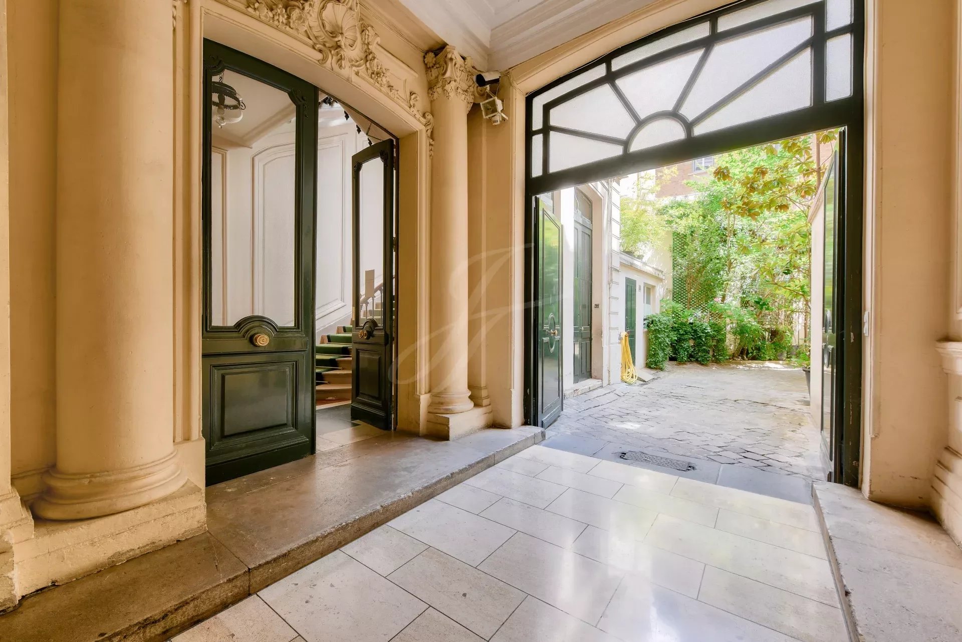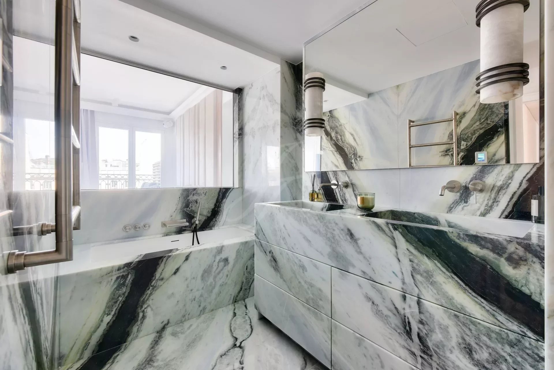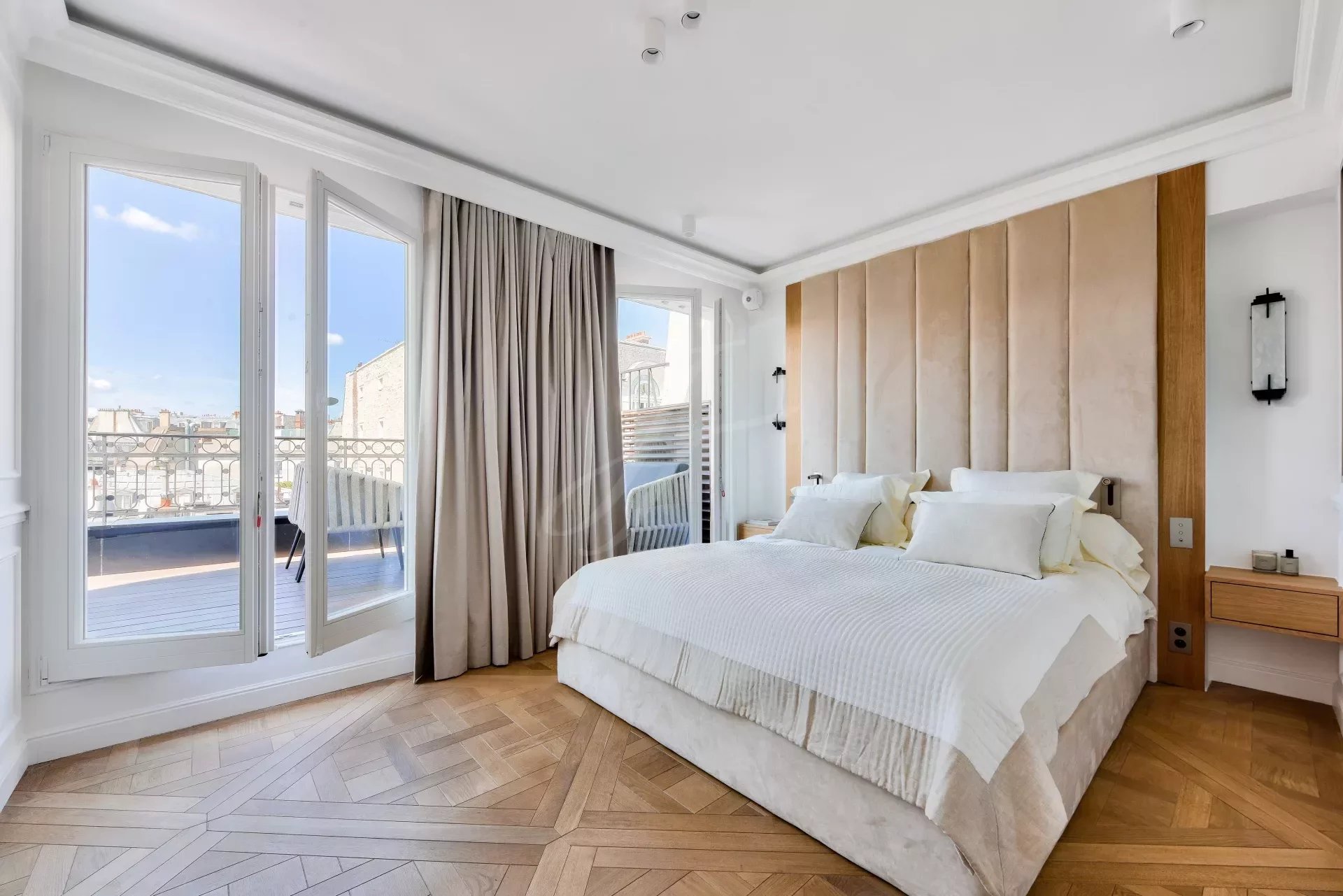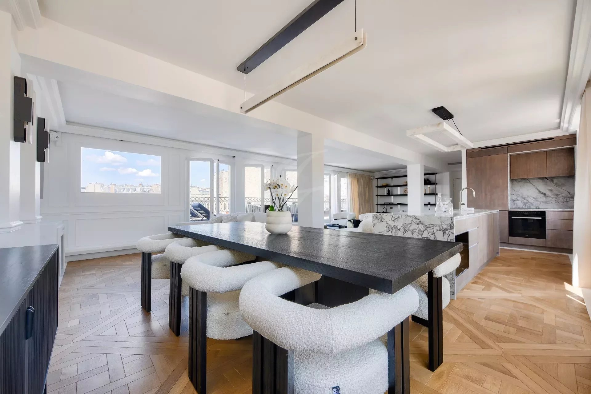 Из гостиной и главной спальни есть прямой выход на террасу на первом этаже с видом на Эйфелеву башню. На этой террасе есть открытая гостиная, мраморная летняя кухня с баром, обеденная зона на восемь персон, зона отдыха и джакузи. По всей длине террасы можно установить электрические жалюзи.