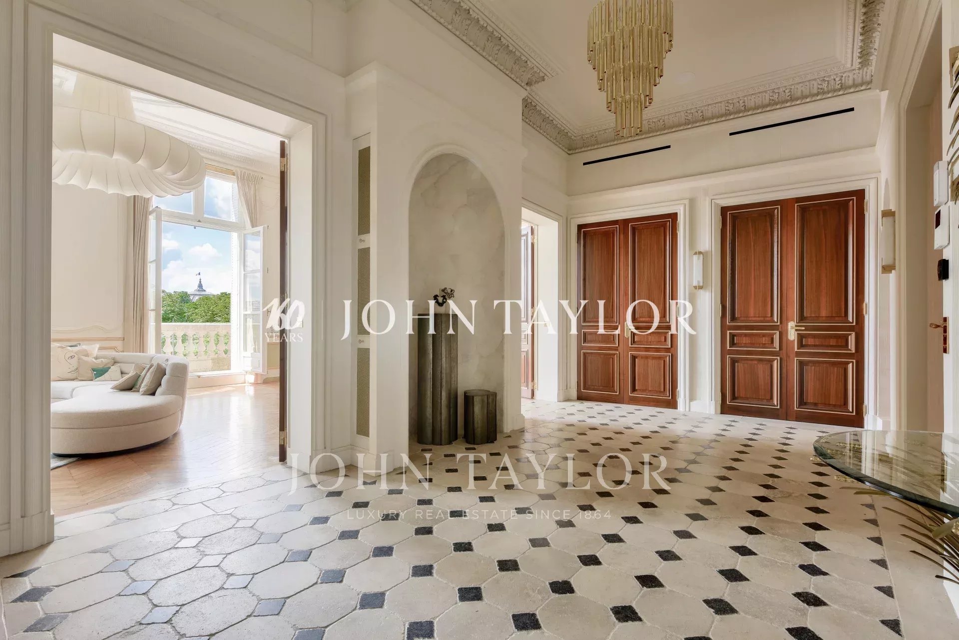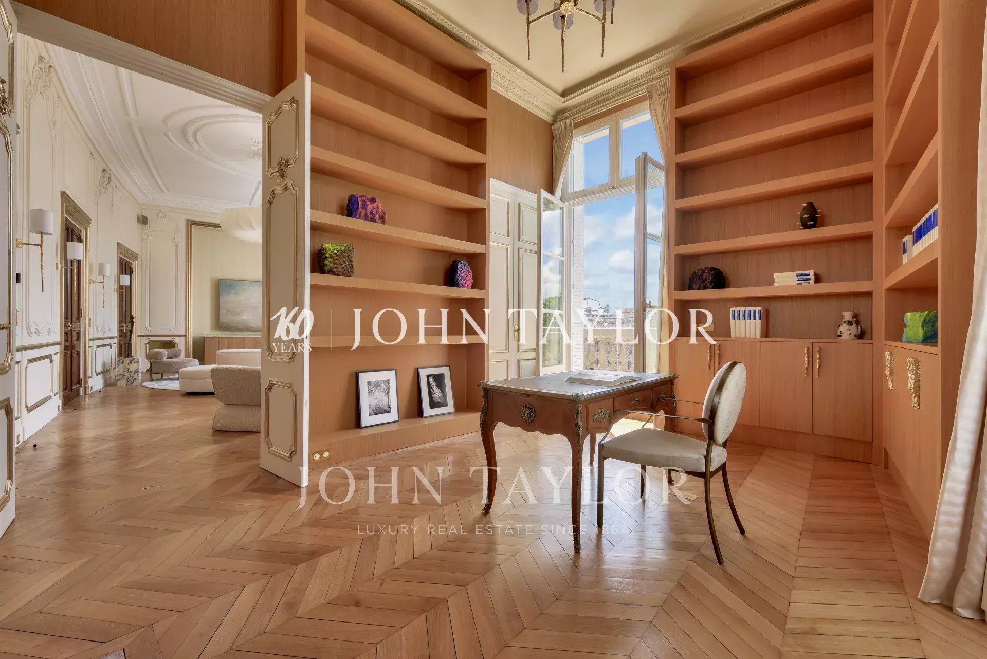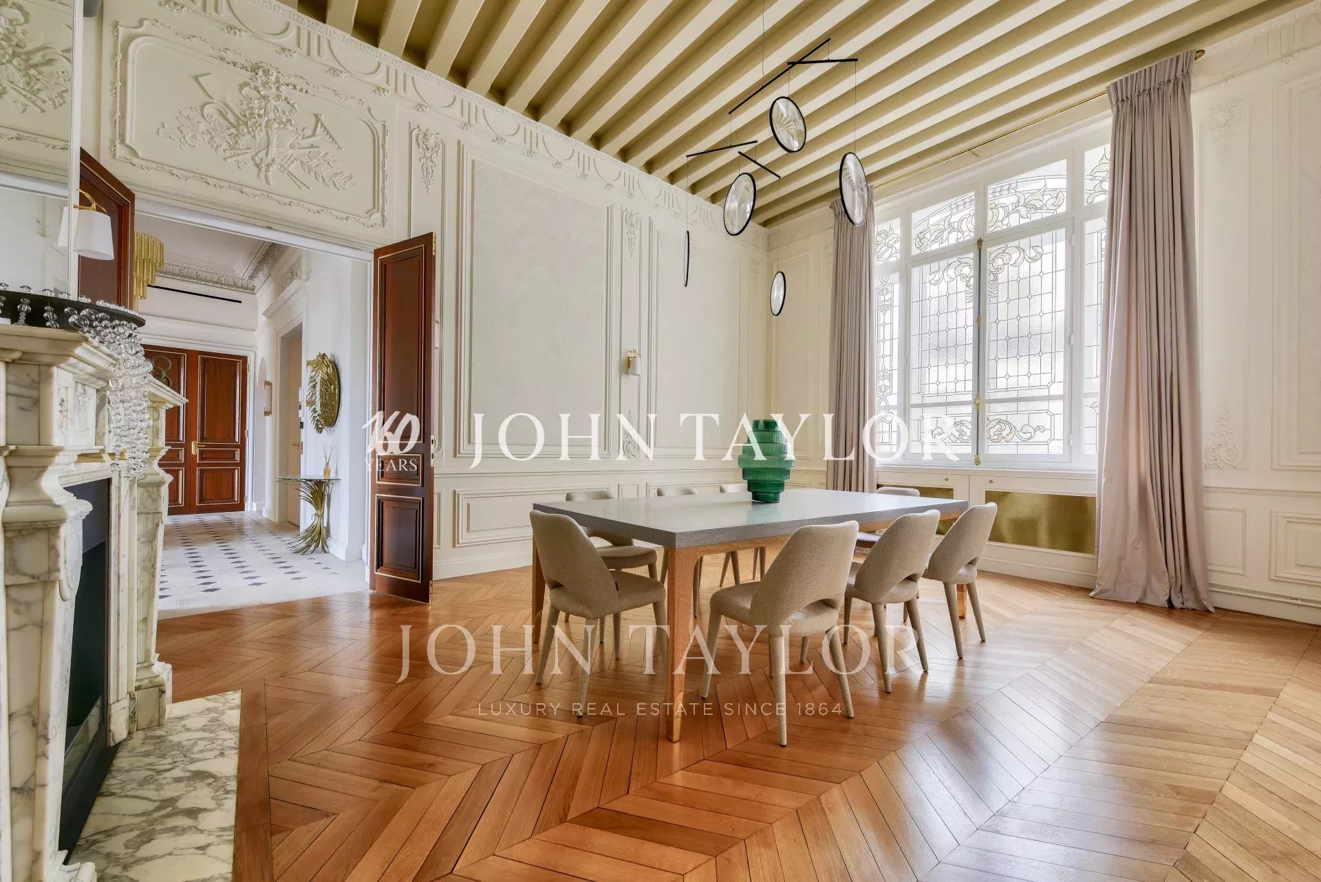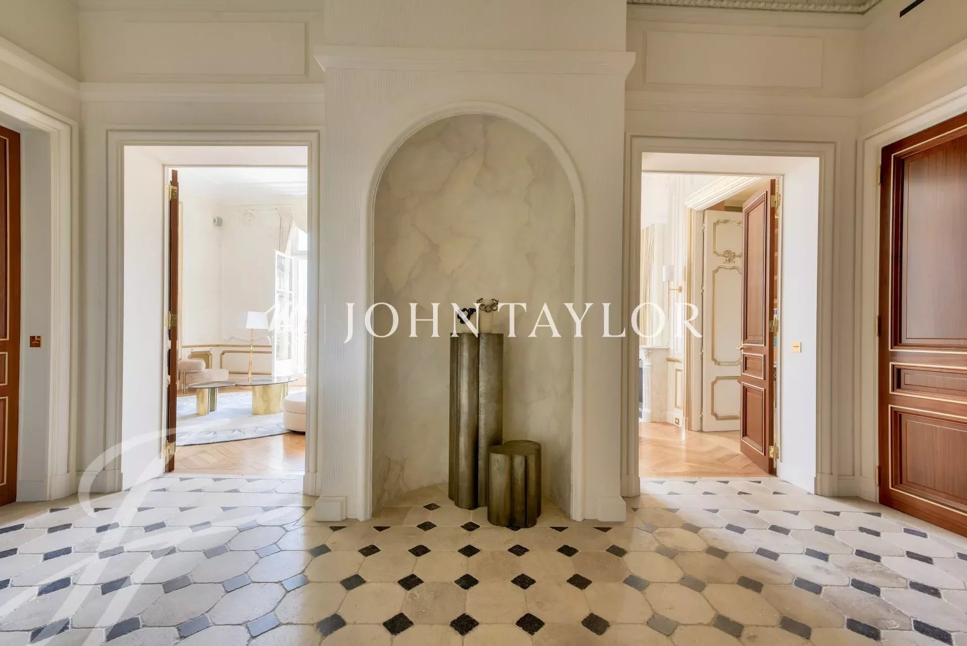 В роскошном здании, на втором этаже с лифтом, сказочная квартира для приема гостей площадью 350 м2 (319 м2 по закону Carrez) после исключительного ремонта, проведенного одним из самых известных архитектурных бюро.
