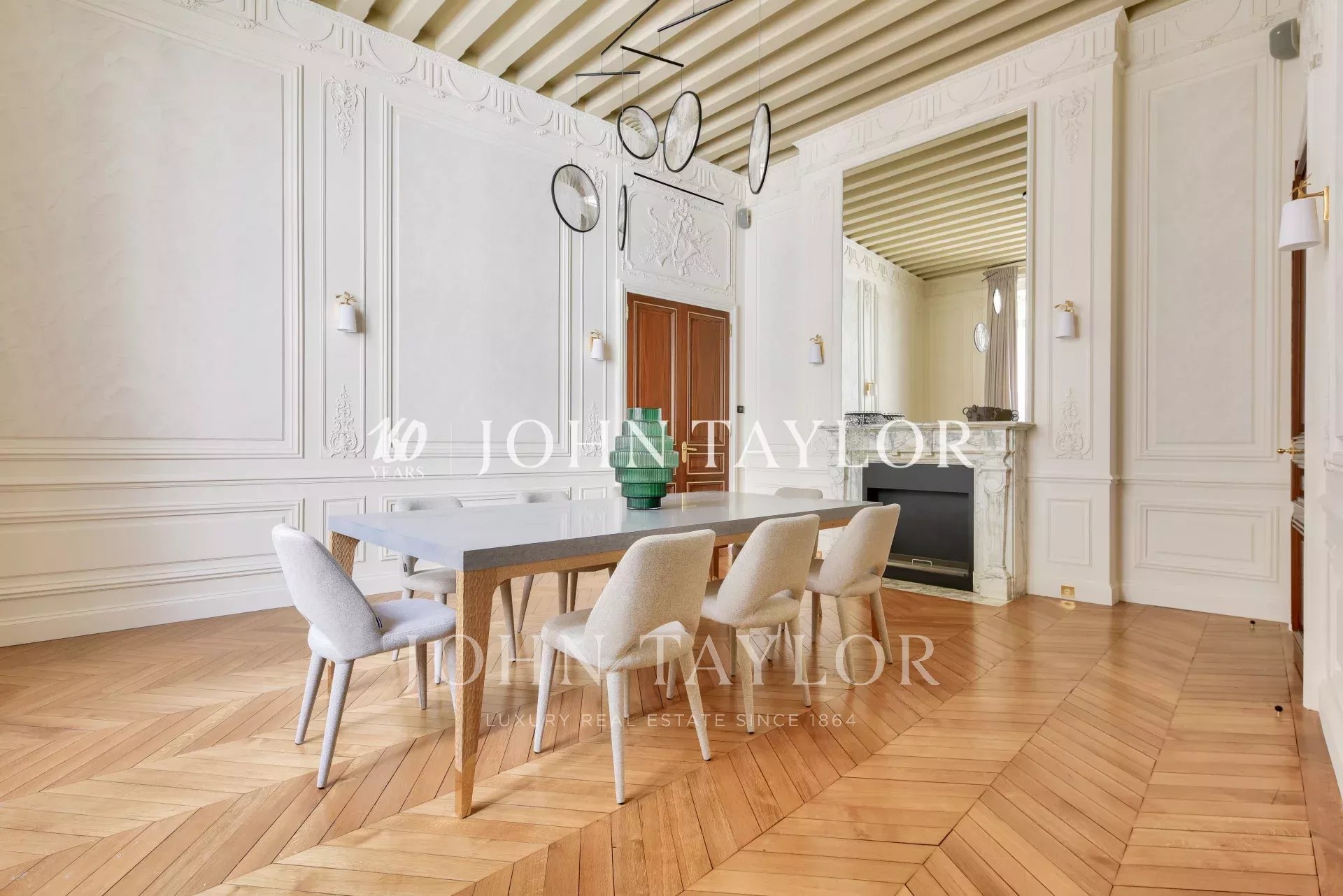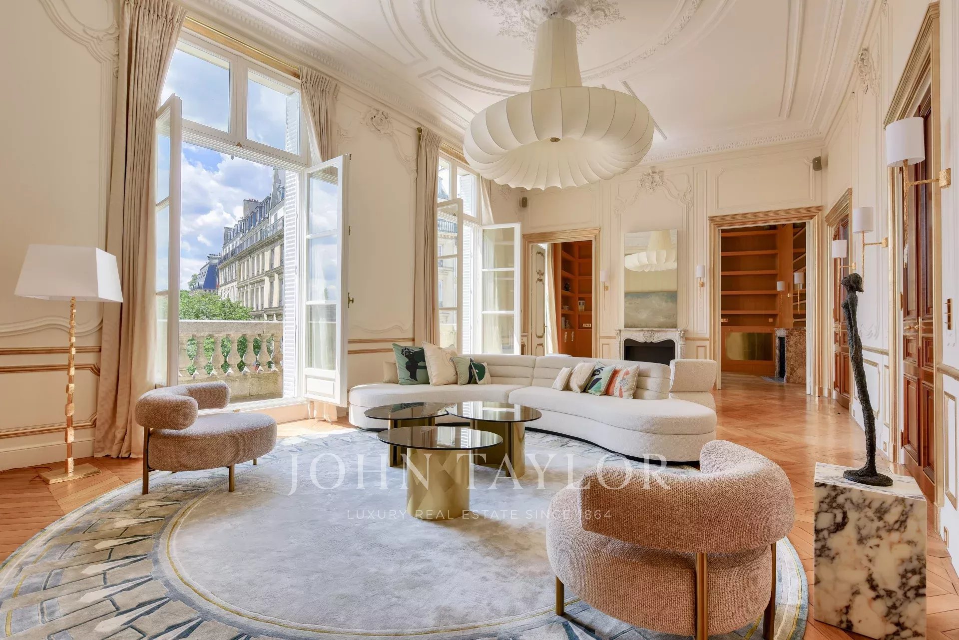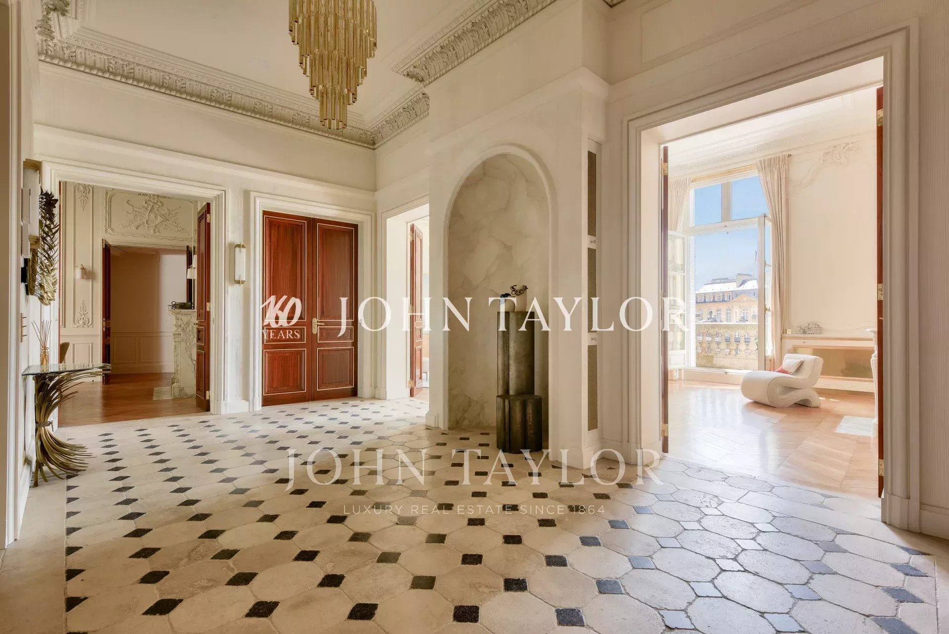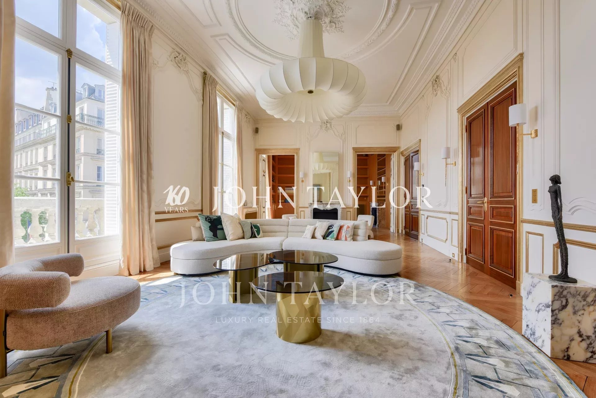 В роскошном здании, на втором этаже с лифтом, сказочная квартира для приема гостей площадью 350 м2 (319 м2 по закону Carrez) после исключительного ремонта, проведенного одним из самых известных архитектурных бюро.