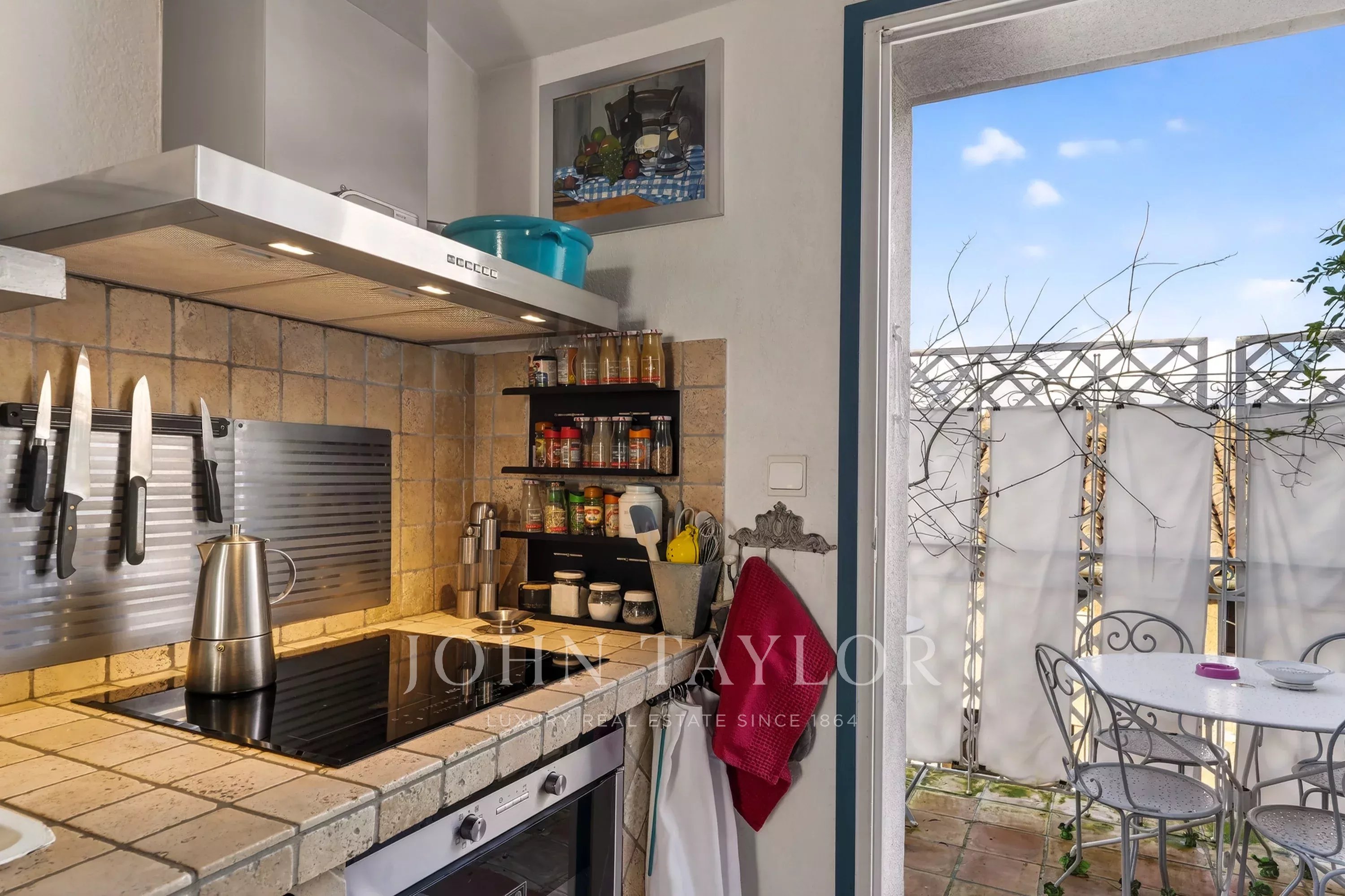На верхнем этаже расположены исключительно светлые зоны для приема гостей: гостиная-столовая, выходящая на южную сторону и открывающая балкон с беспрерывным видом на крыши Экса, оборудованная кухня, выходящая на внутреннюю террасу, а также кабинет и функциональное пространство для хранения.