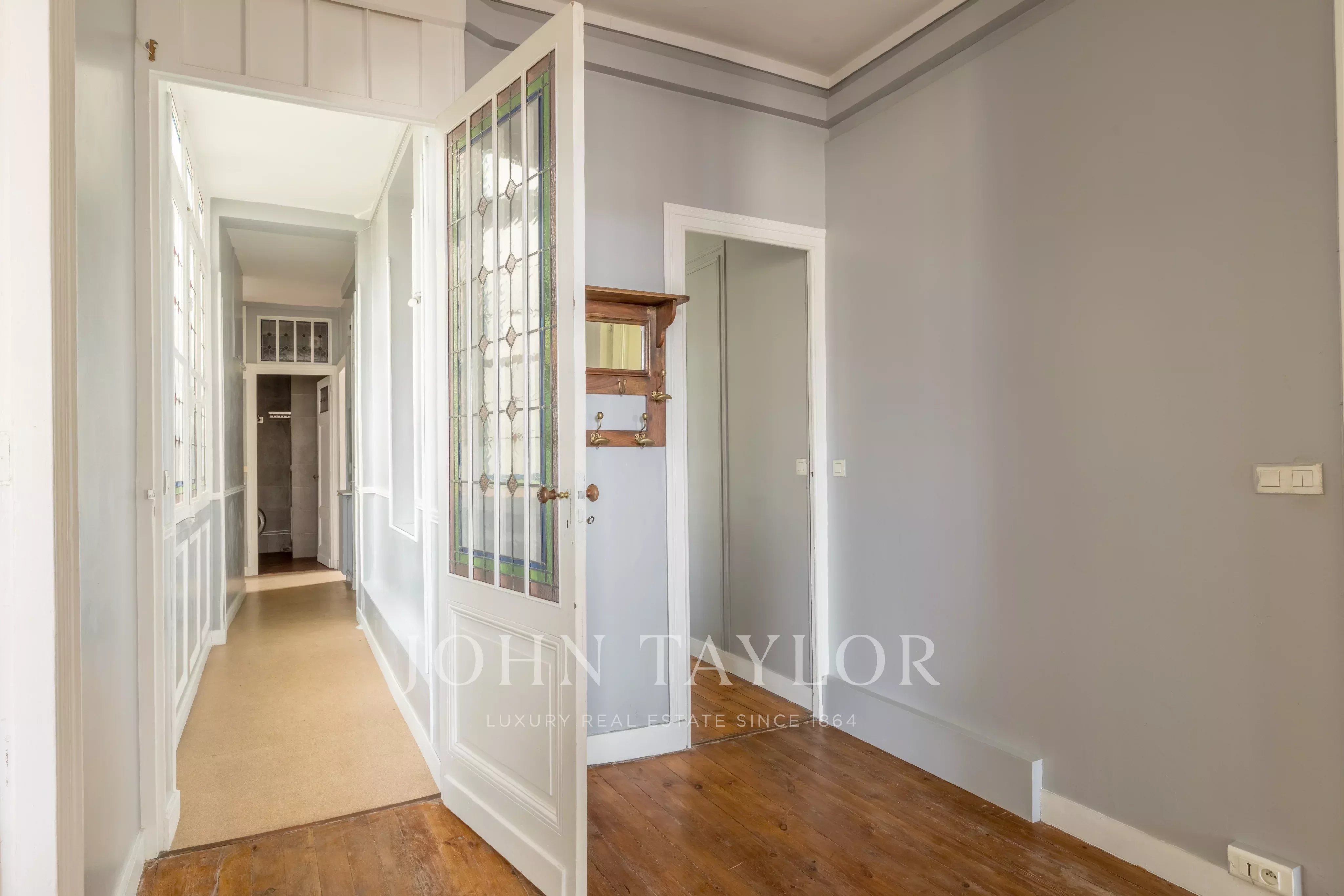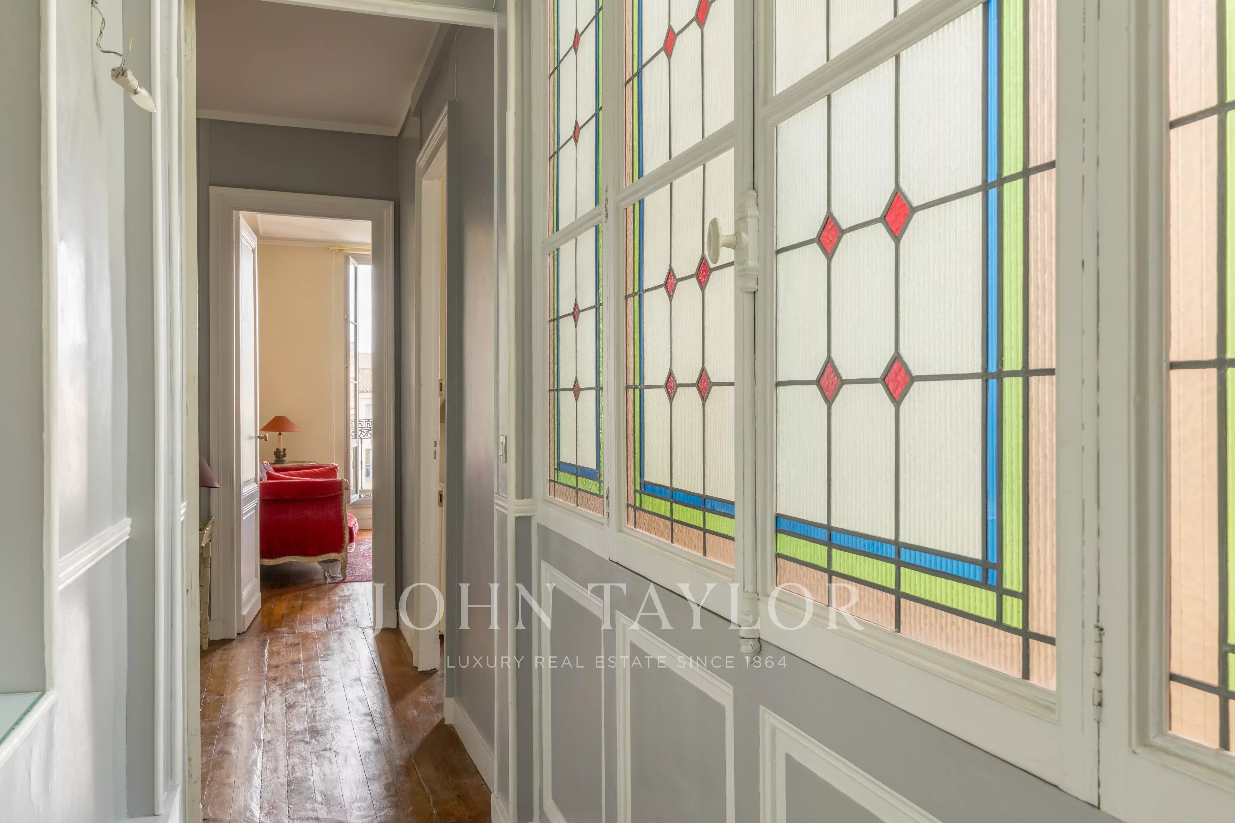 Сохраняются оригинальные особенности: паркет, камины, витражи, придающие квартире всю элегантность и обаяние старинных времен. Большие окна новые и пропускают естественный свет во все комнаты.