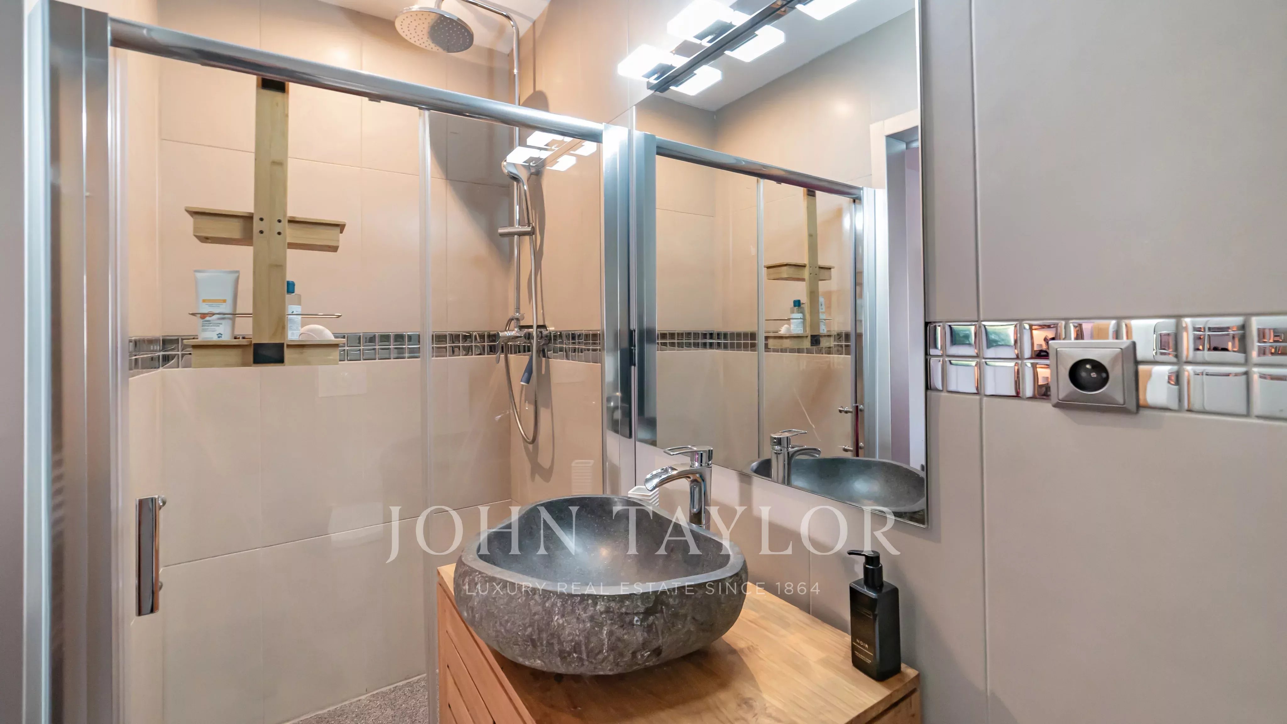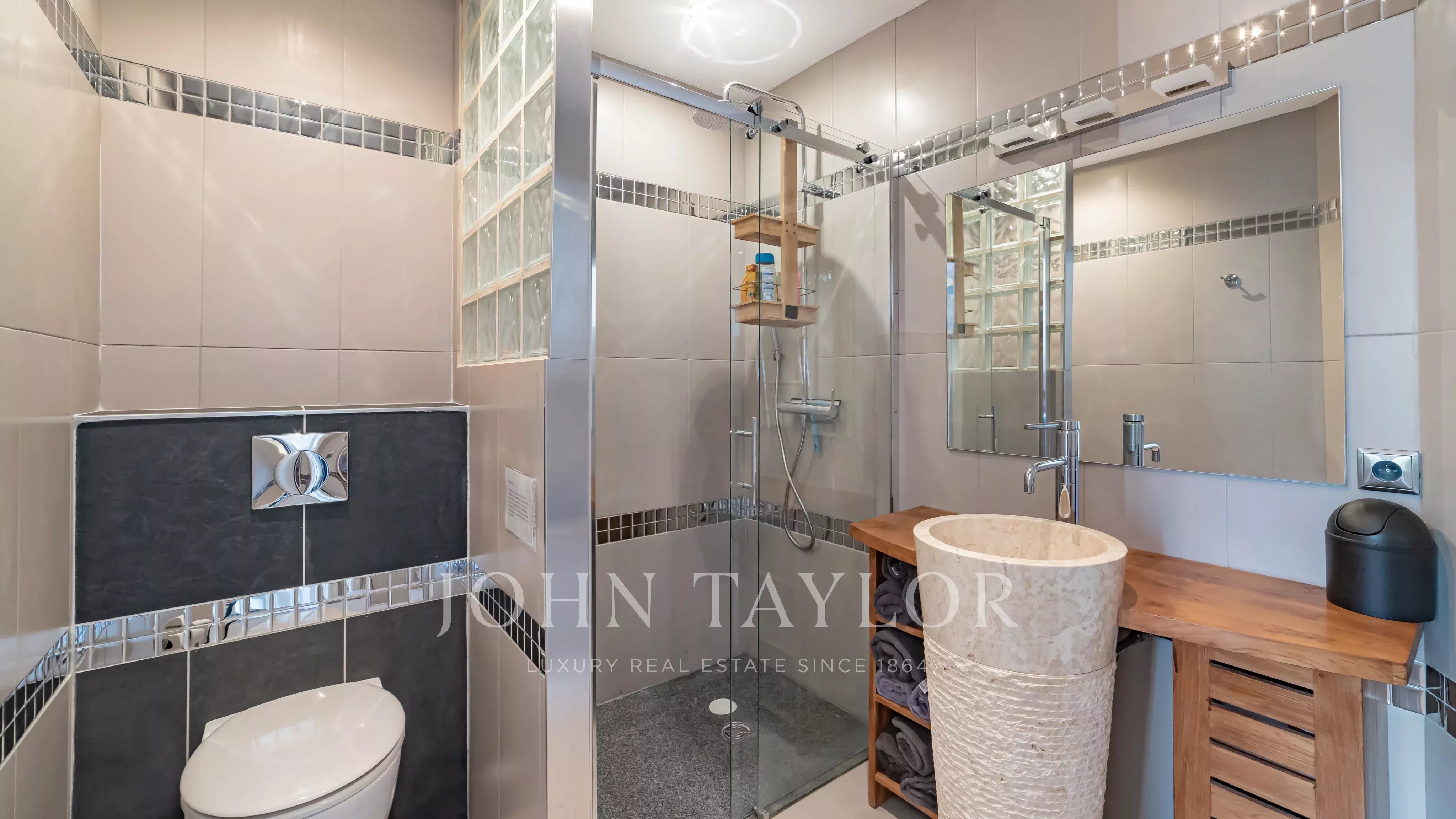 На первом этаже находится прихожая, ведущая в большую светлую гостиную, состоящую из зала и столовой, дополненную полностью оборудованной кухней открытого плана. Все это выходит на просторную террасу, идеально подходящую для того, чтобы в полной мере насладиться видом и окружающей природой.