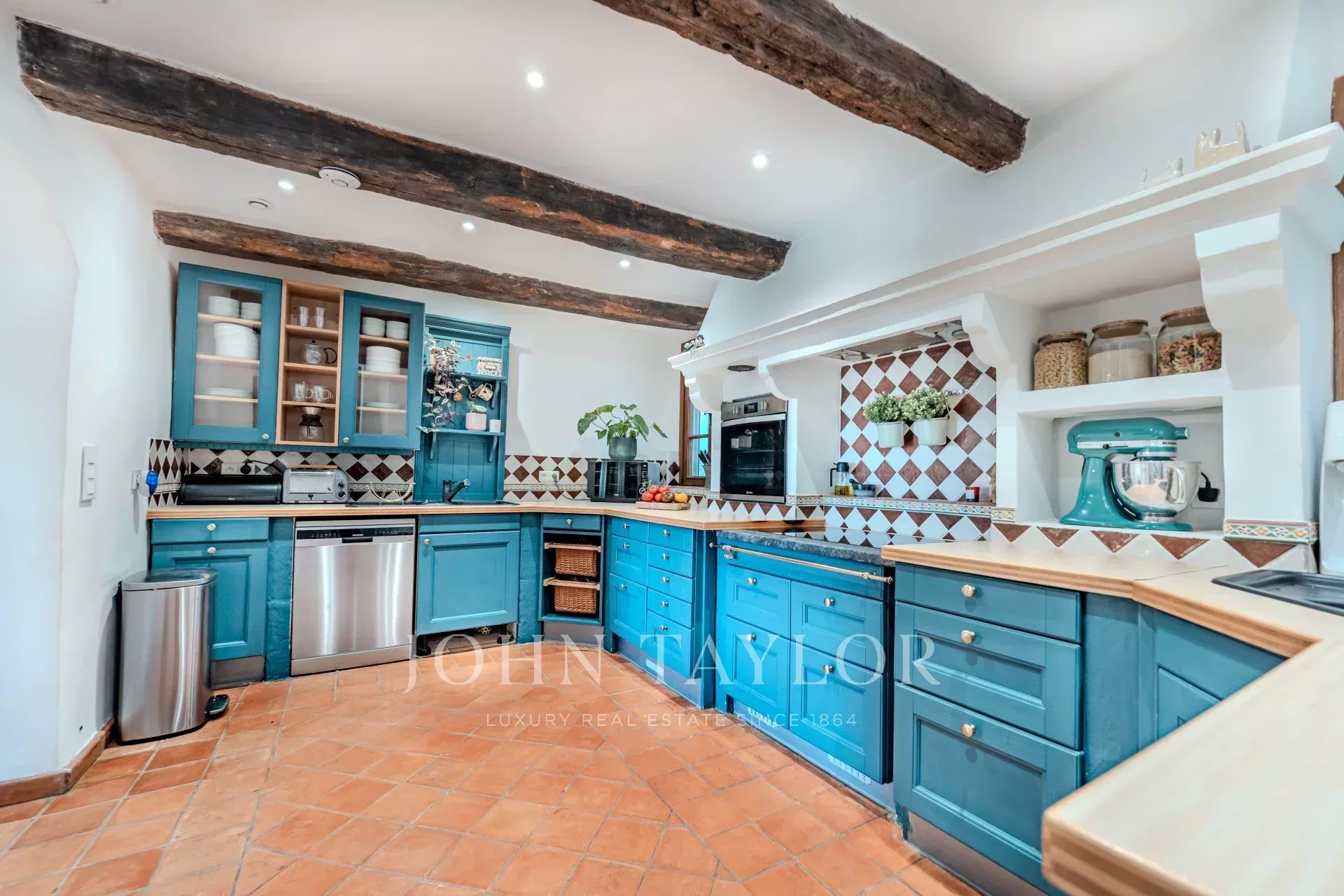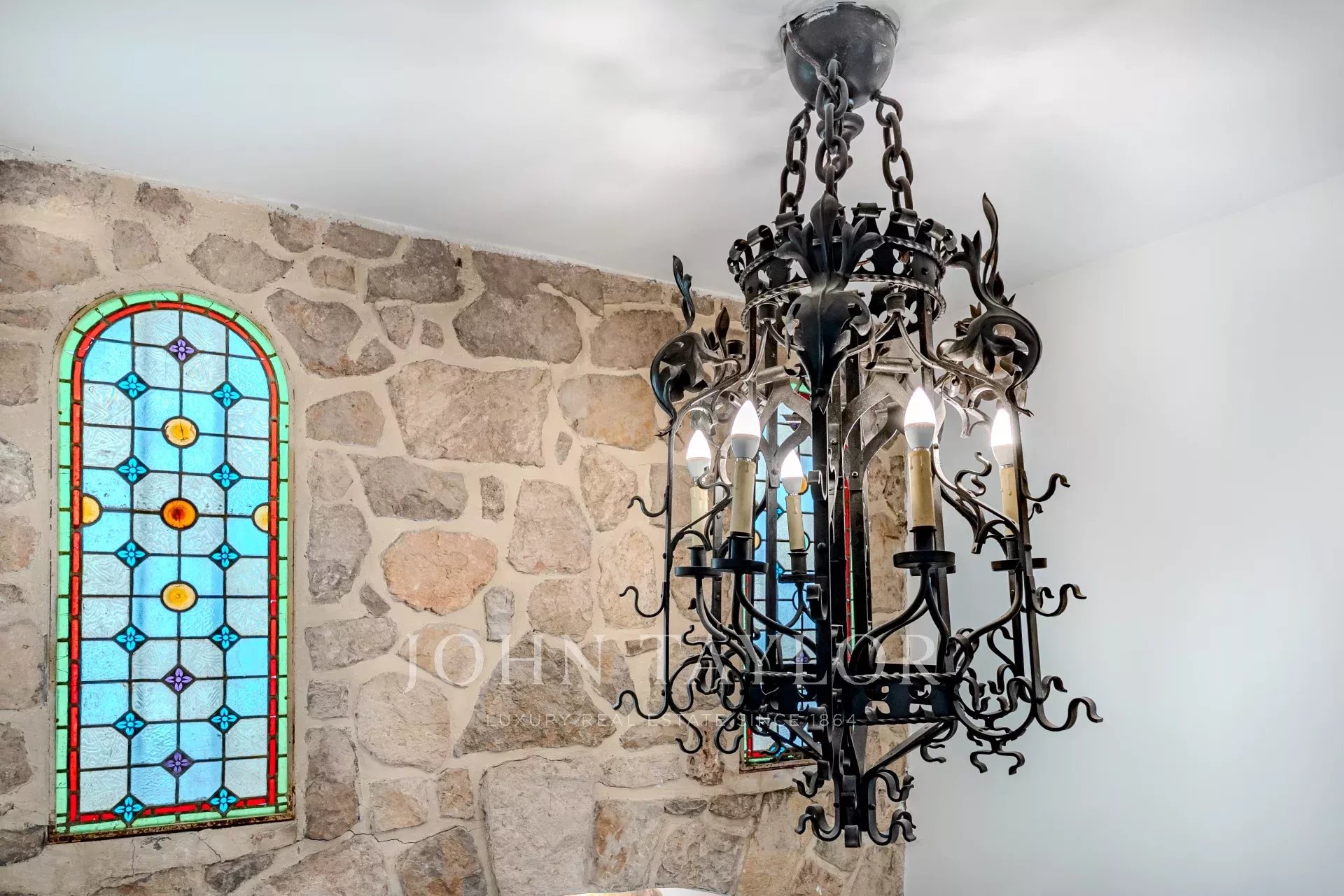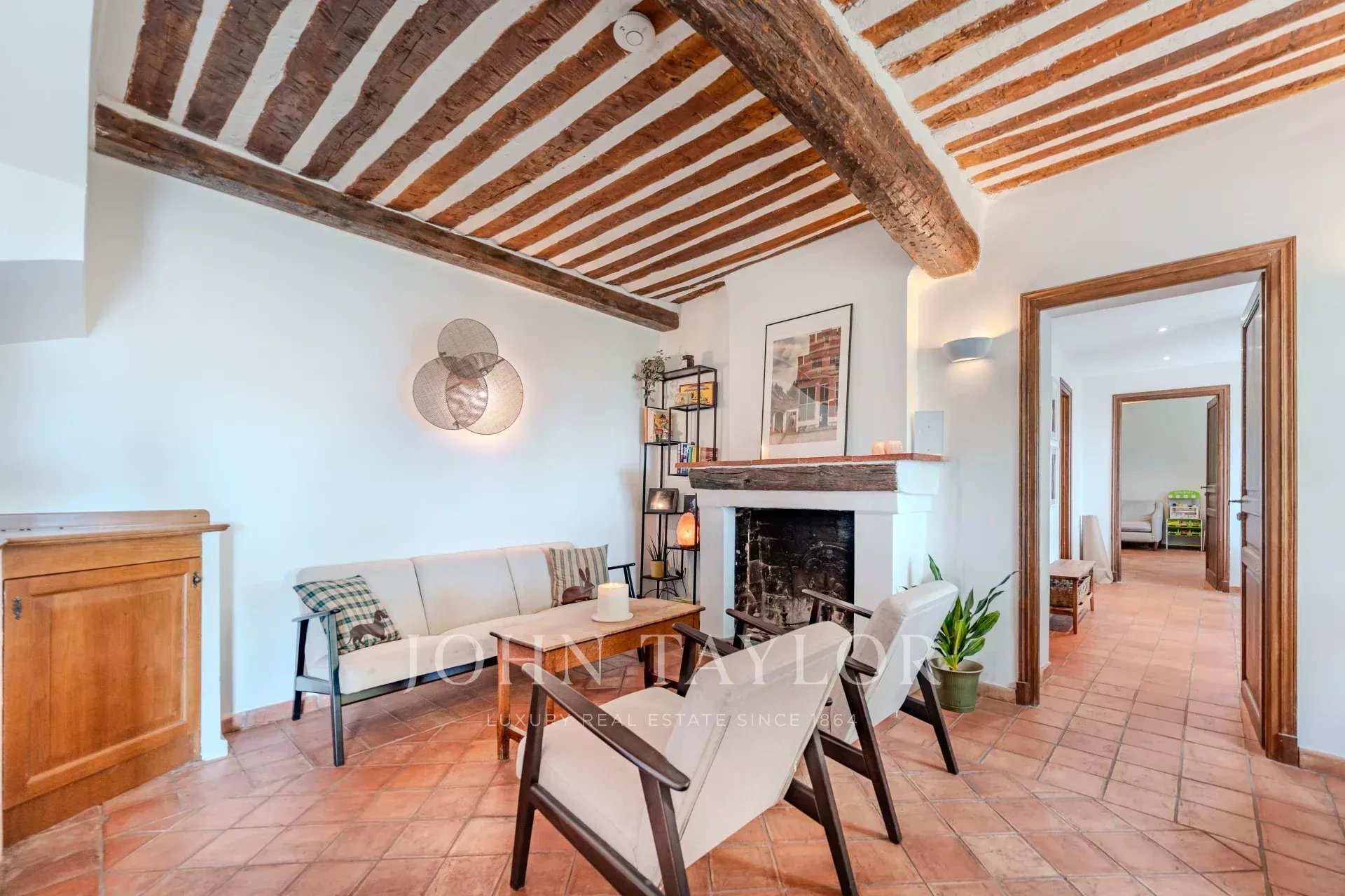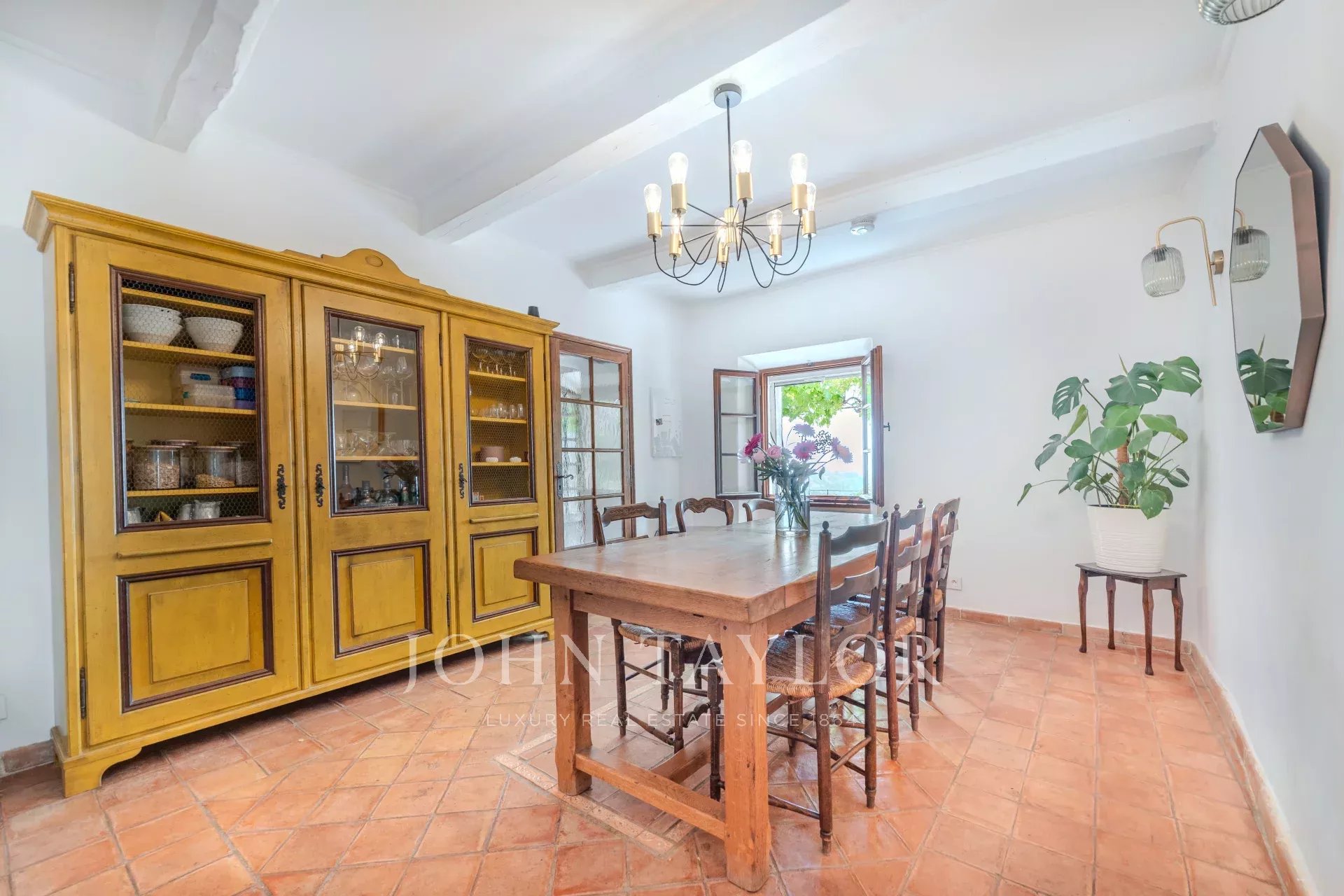 На первом этаже расположены небольшая гостиная с камином, столовая, примыкающая к кухне в провансальском стиле, большая светлая гостиная также с камином, кабинет, спальня или телевизионная комната, а также гостевой туалет.