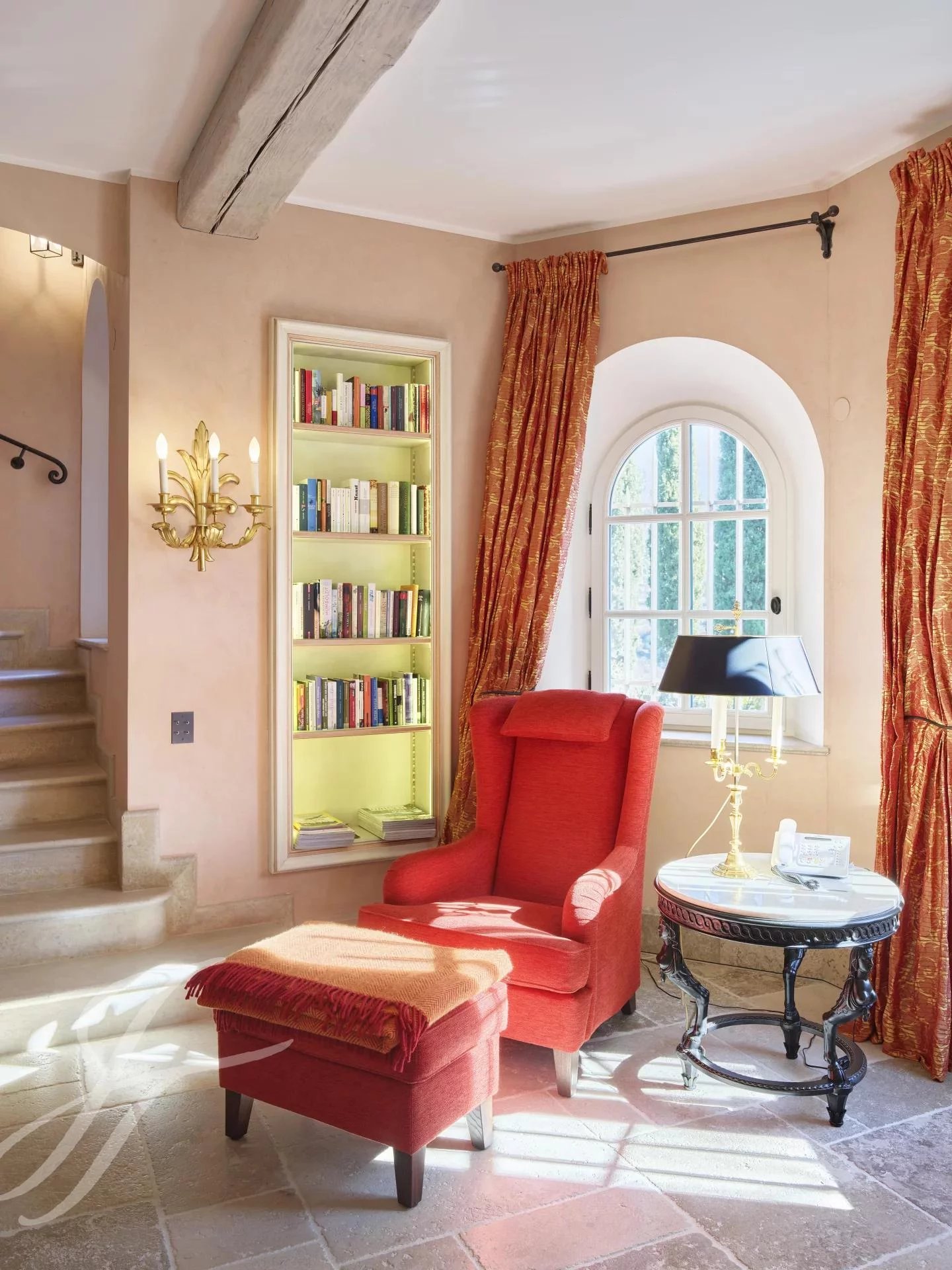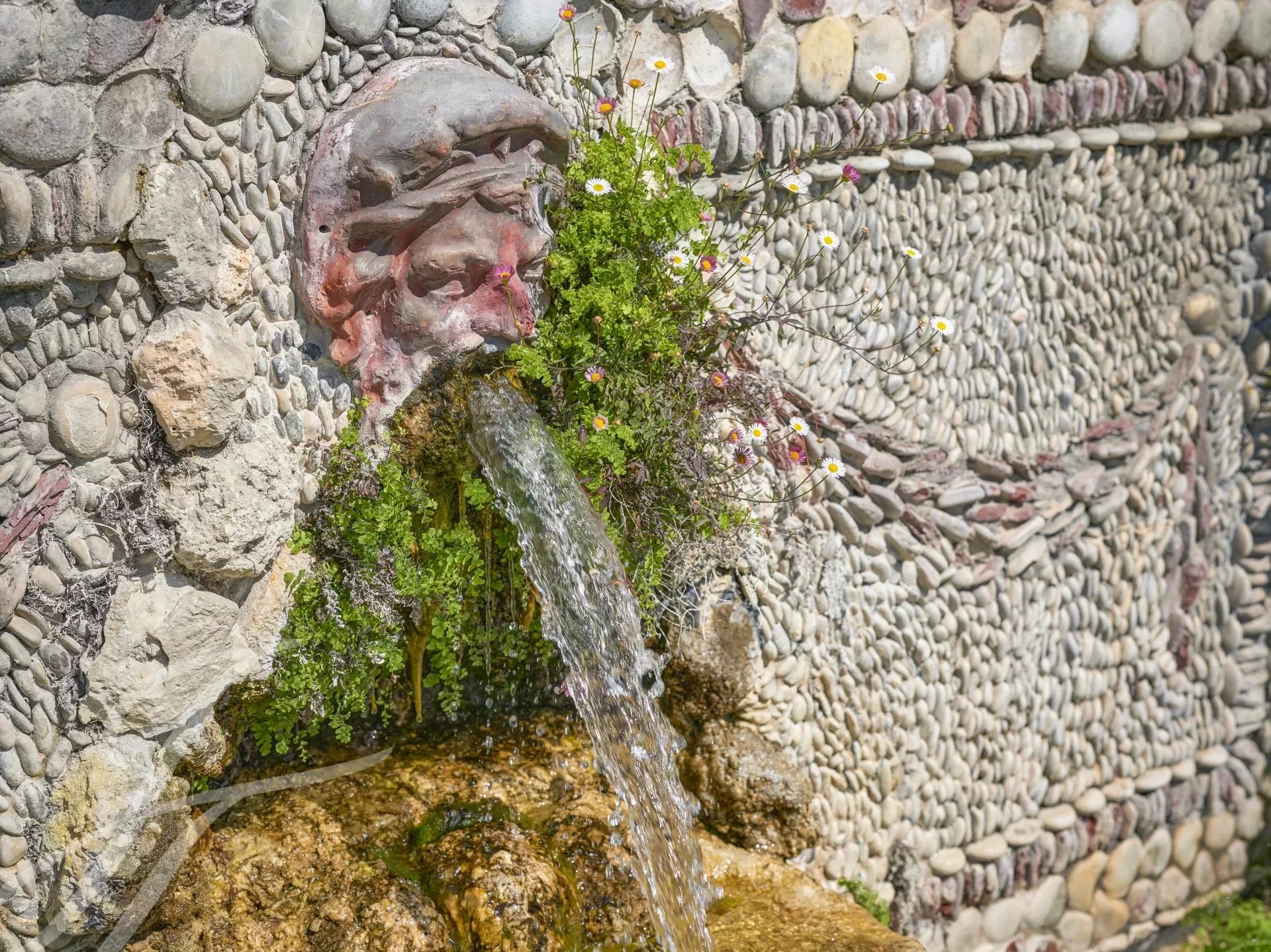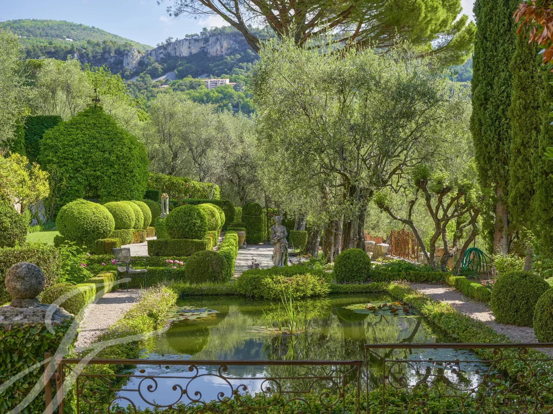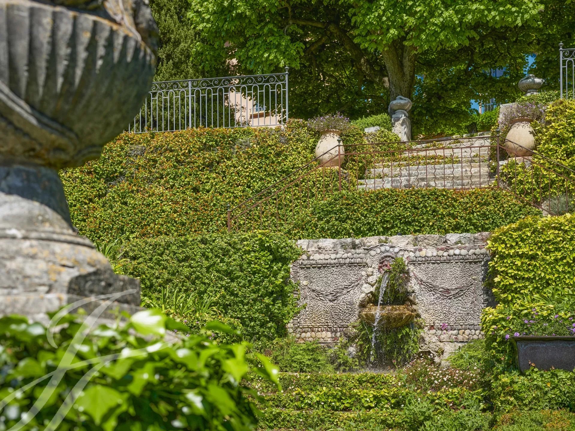 С великолепных террас, затененных 180-летними липами, можно попасть в романтический пруд с карпами кои, окруженный самшитами, кипарисами и соснами. В прекрасном парке есть также бесчисленные фонтаны, очаровательный розовый сад, идиллическая беседка, "Этанж любви", редкие и экзотические породы деревьев и обширная оливковая роща.