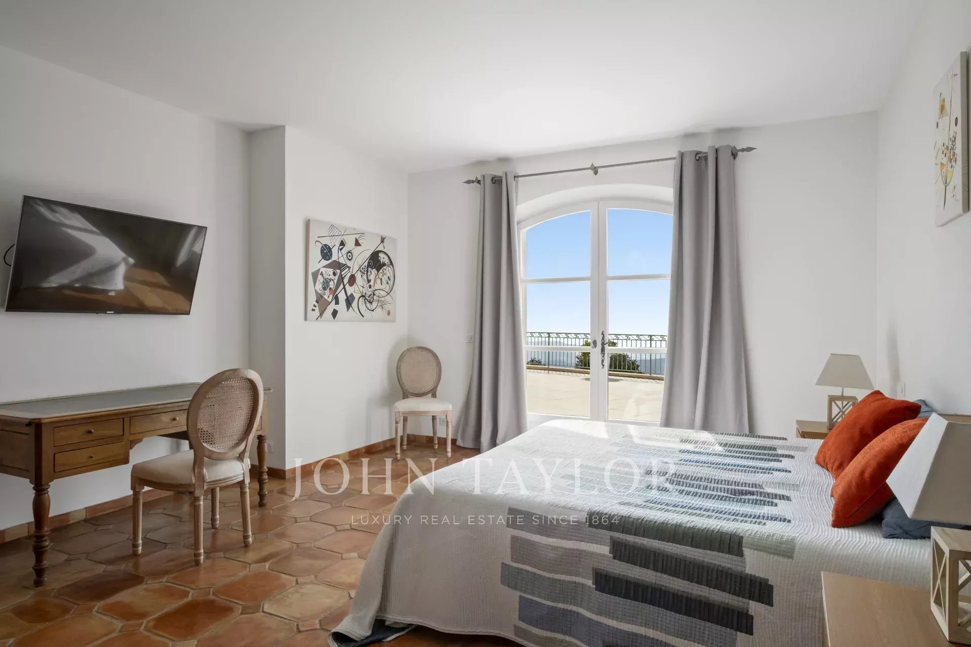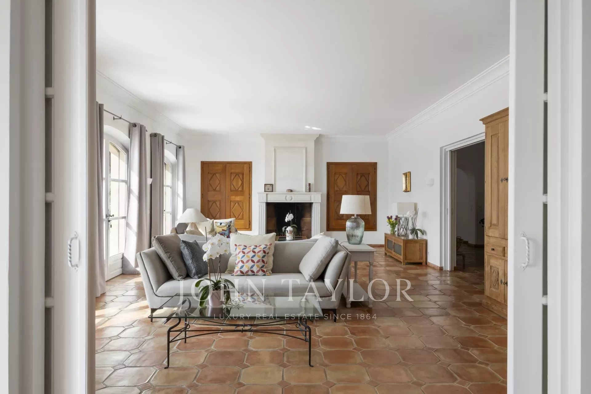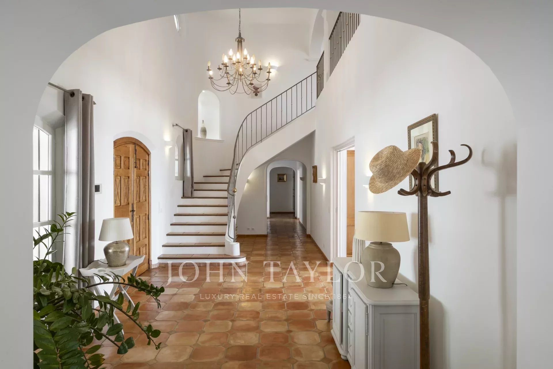 Великолепная прихожая с потолком двойной высоты ведет в просторную гостиную/столовую с элегантным камином и большими окнами-витражами, выходящими на огромную террасу. Очаровательная кухня в провансальском стиле с большим камином располагает к семейным обедам. На этом же уровне вы найдете кабинет, две спальни, включая главную спальню с привлекательной ванной комнатой, гардеробной и собственной террасой, а также прачечную, кладовую и гардеробную.