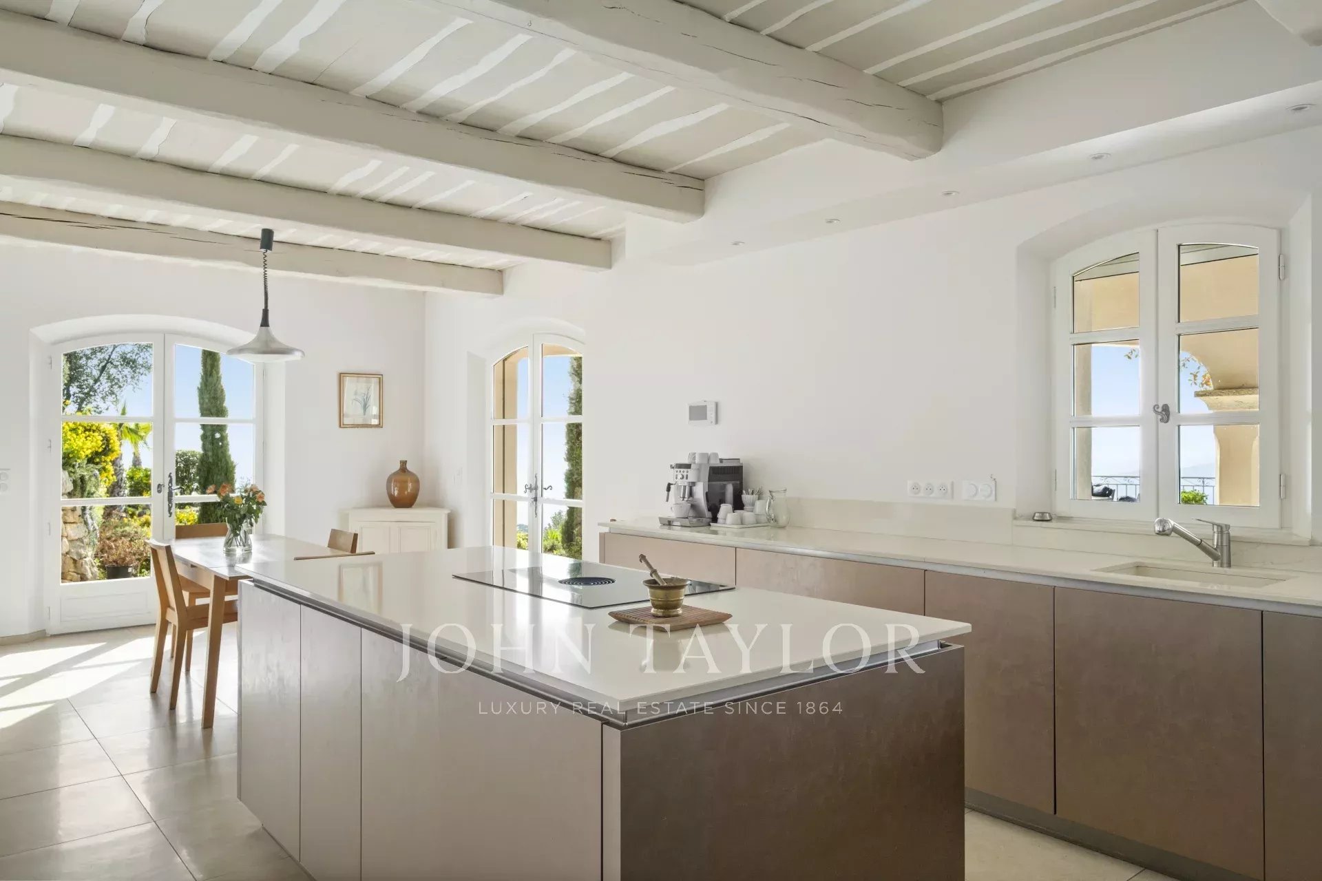 На уровне сада расположены еще две спальни с ванными комнатами, отдельная квартира, винный погреб, фитнес-зал, очаровательный домик у бассейна с оборудованной кухней, душевая/туалет и двойной гараж.