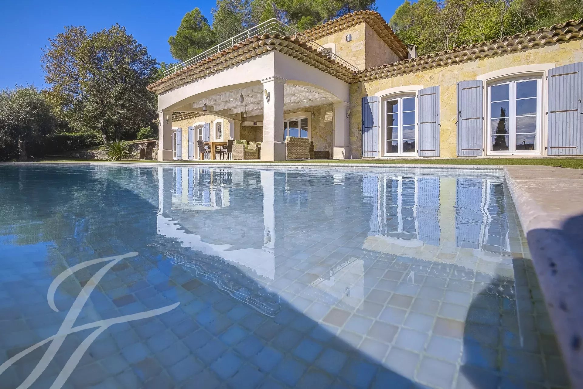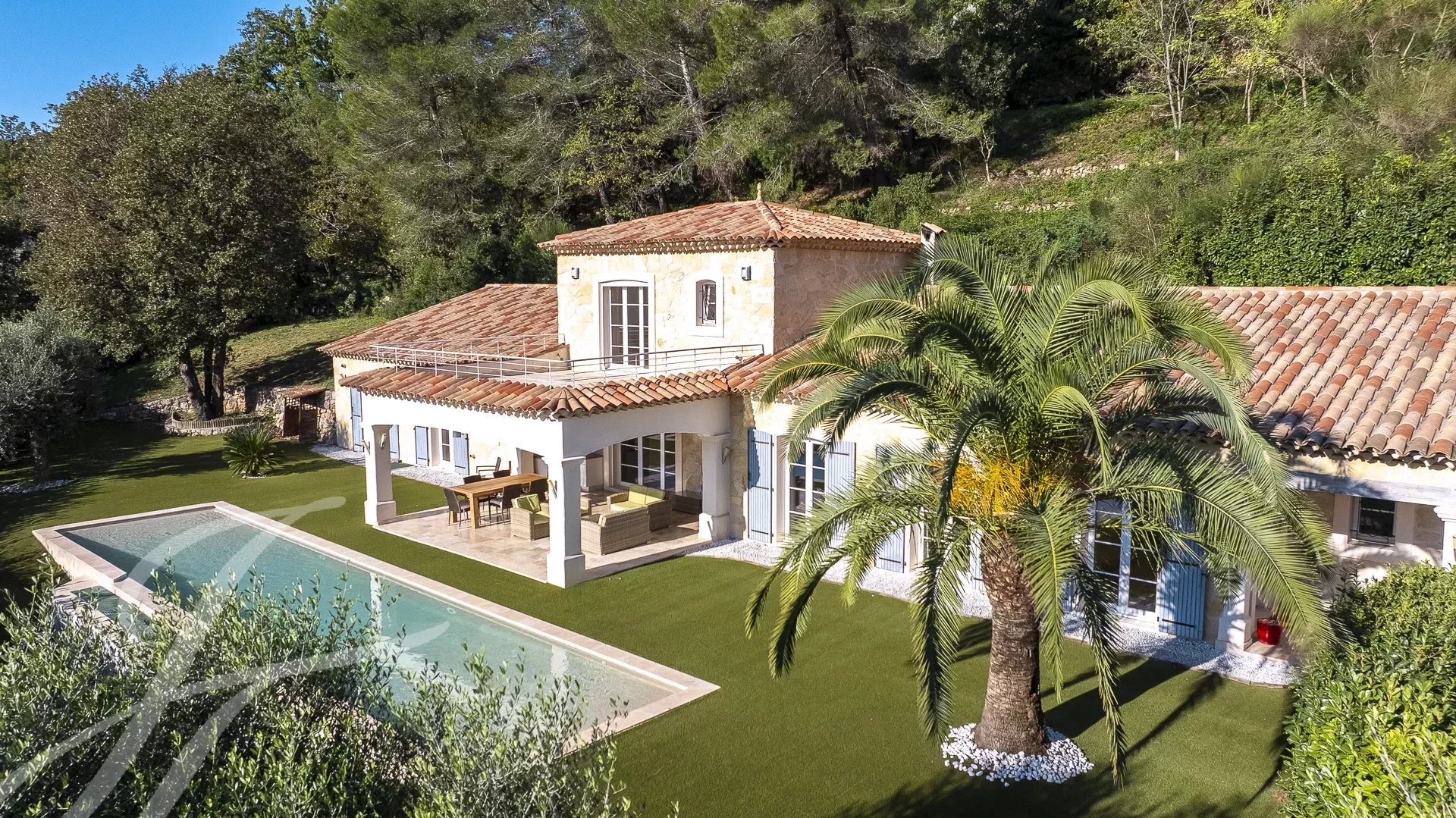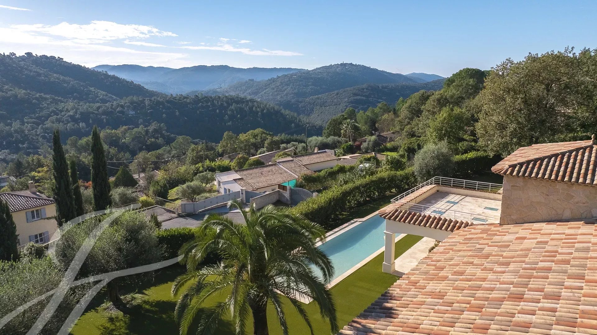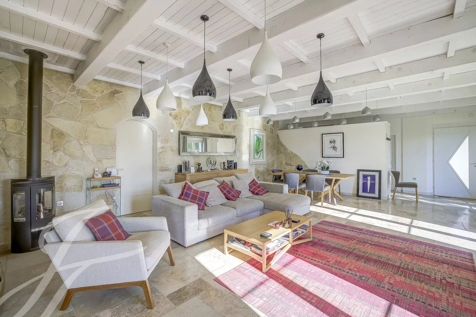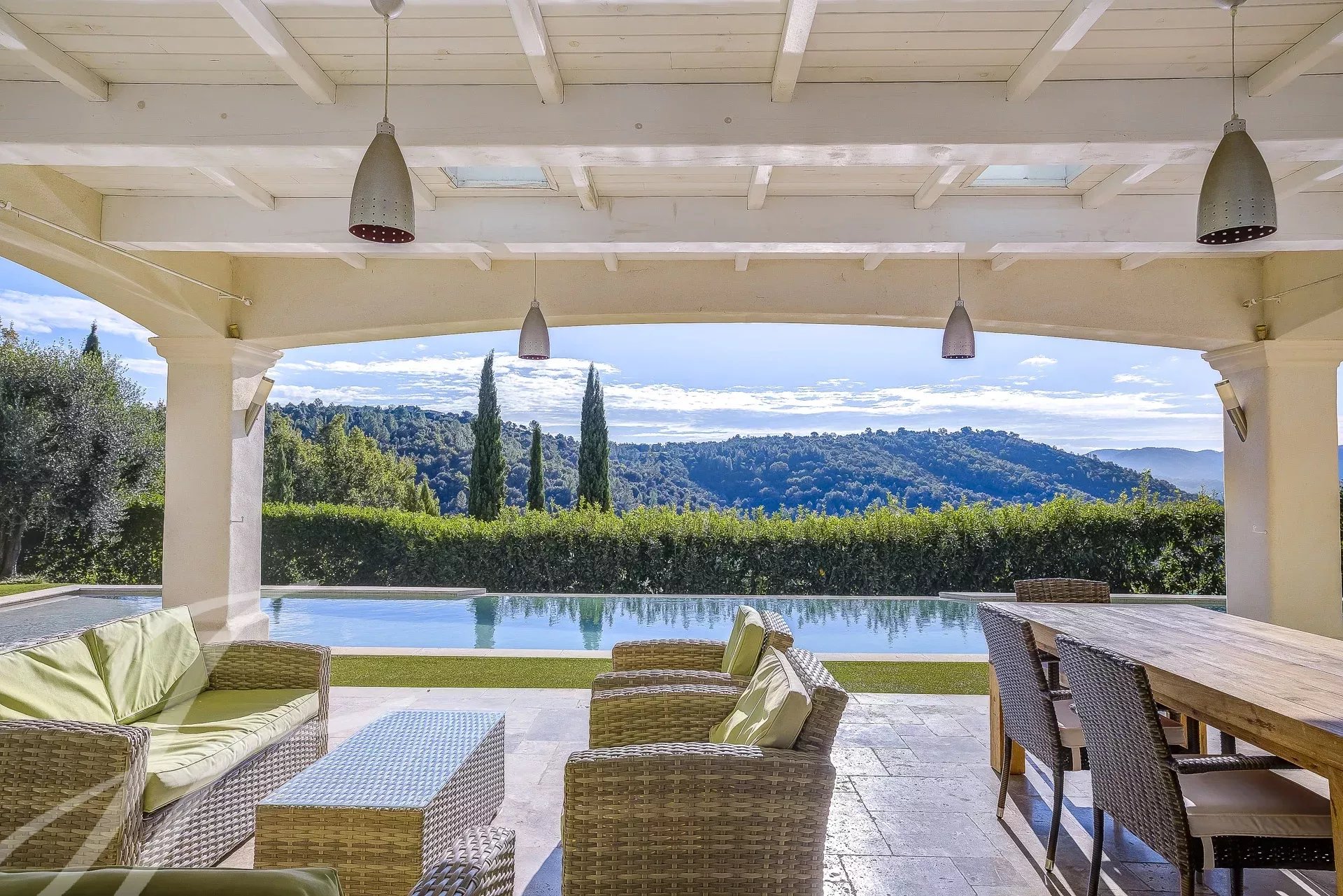 Просторная гостиная открытой планировки выходит прямо на открытую площадку и бассейн, откуда можно любоваться великолепными пейзажами региона.
