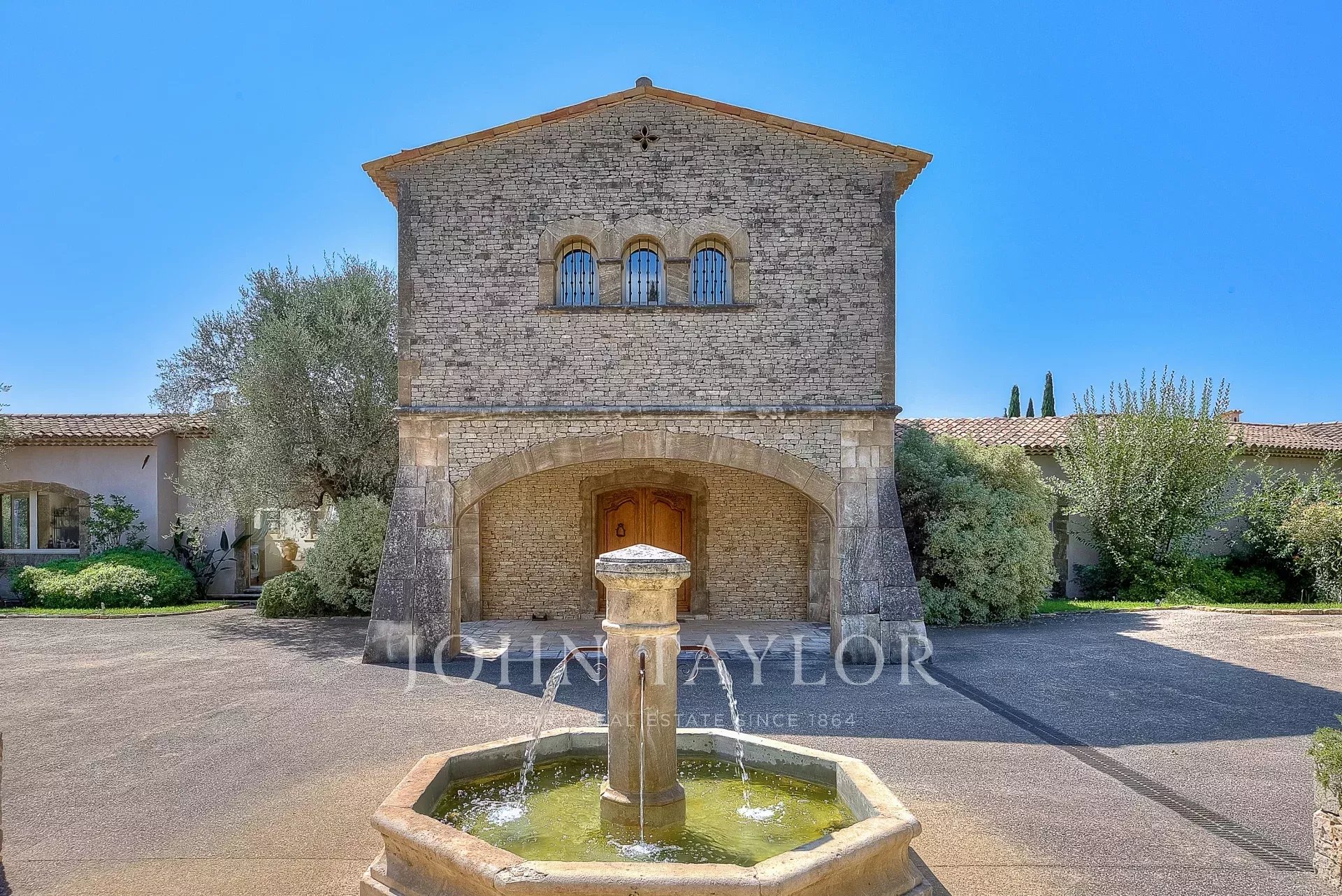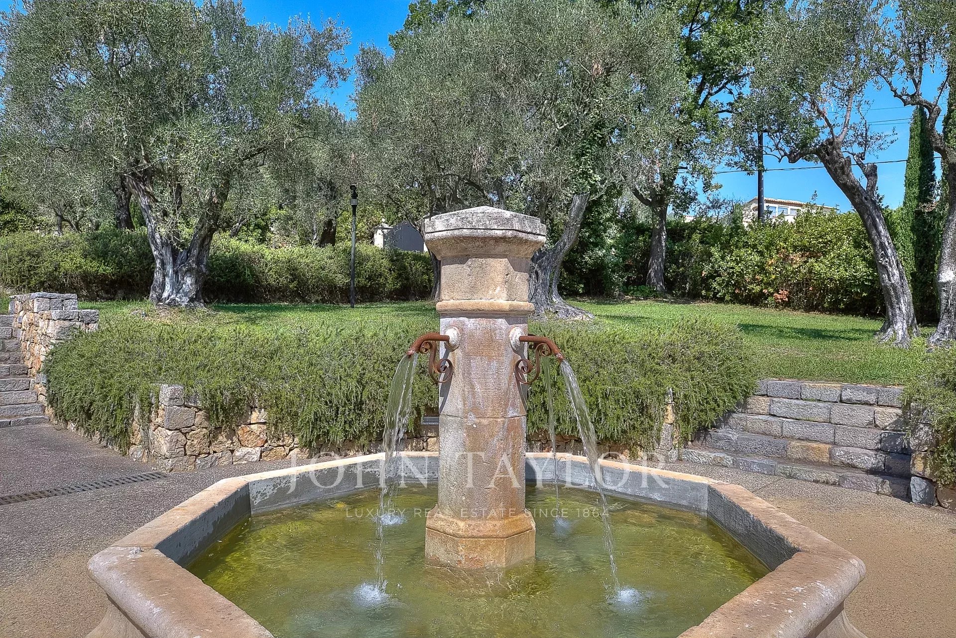 На территории площадью 10 000 м², оформленной по проекту Жана Муса, расположены пологие террасы, каменные стены и 160 оливковых деревьев.