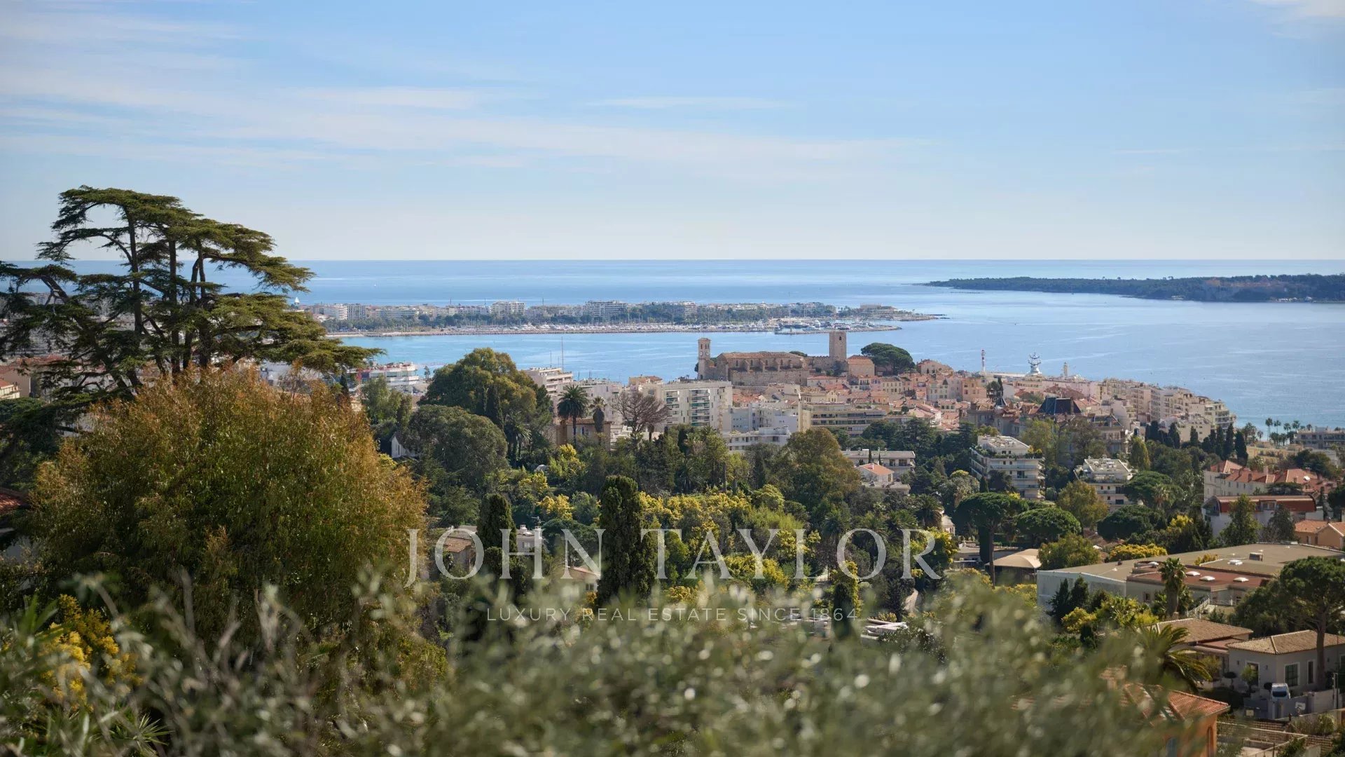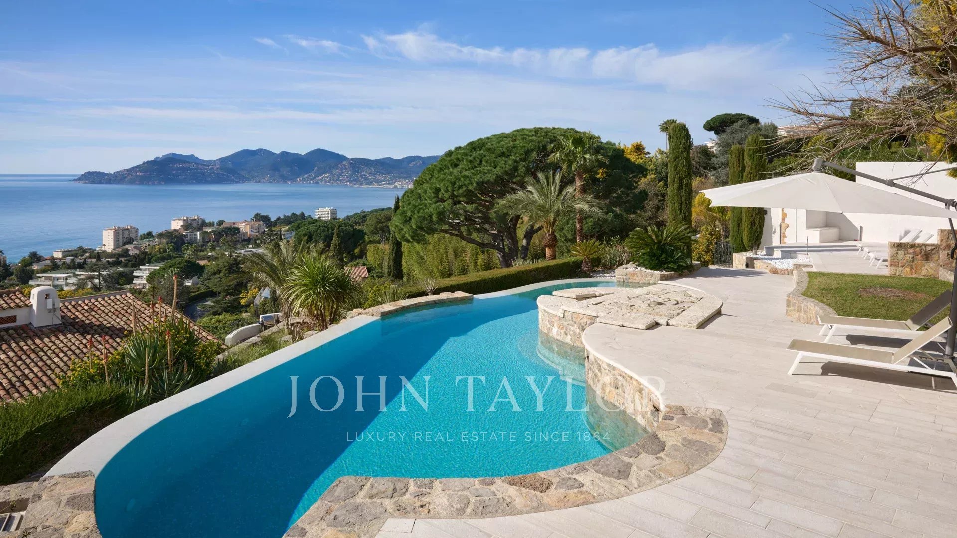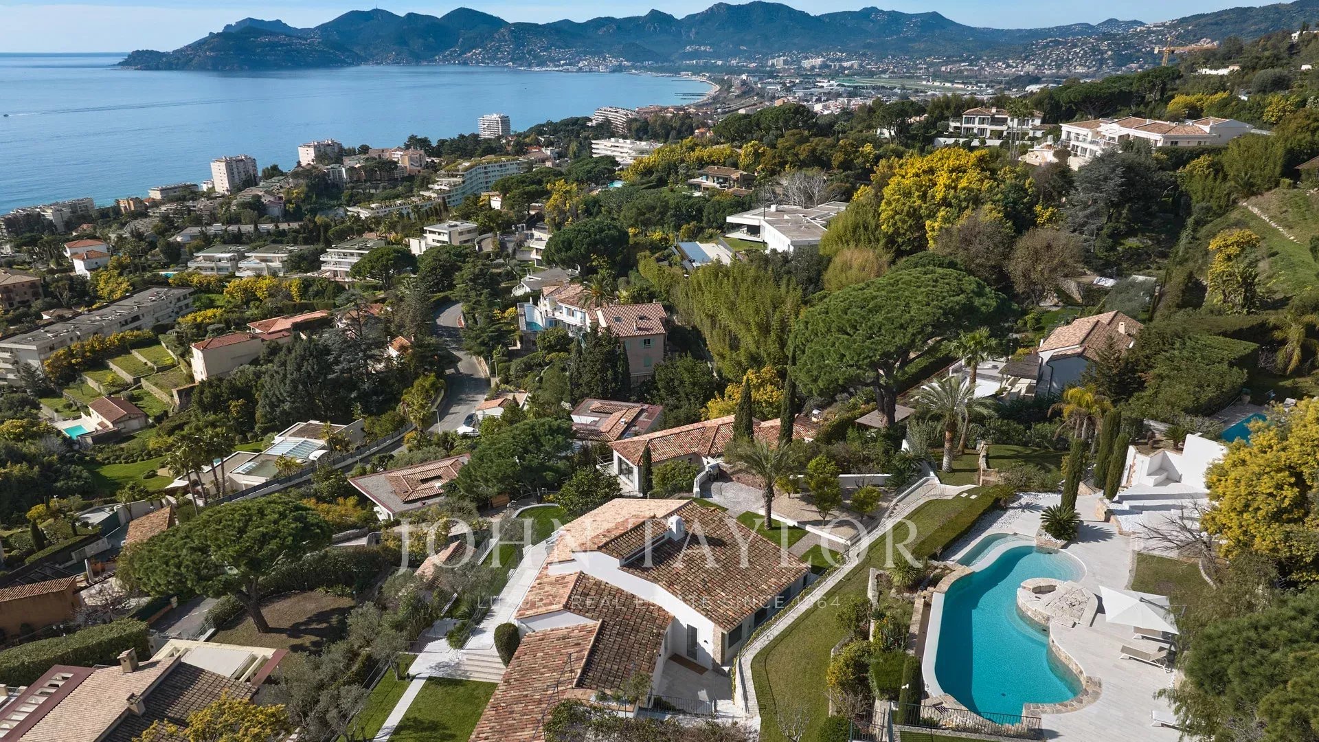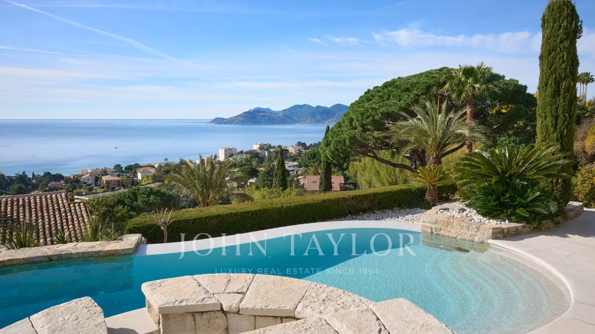 Великолепная вилла расположена на участке около 2400 кв.м с бассейном. Красивый вид на море, Сюке, каннский залив и на Кап д'Антиб.
