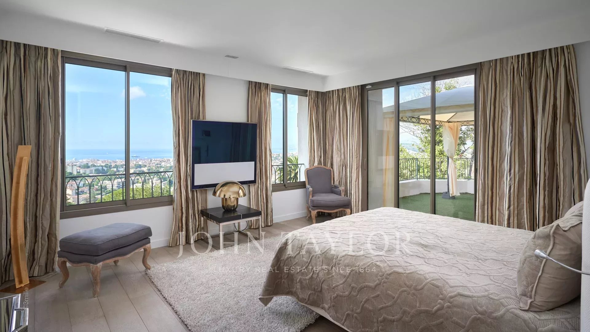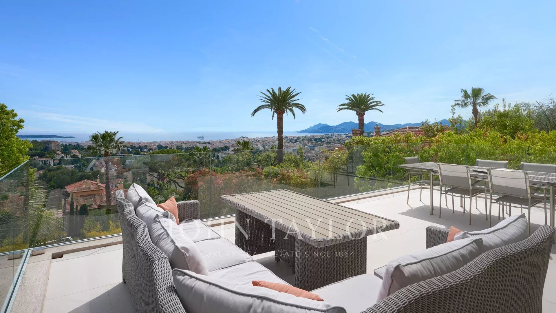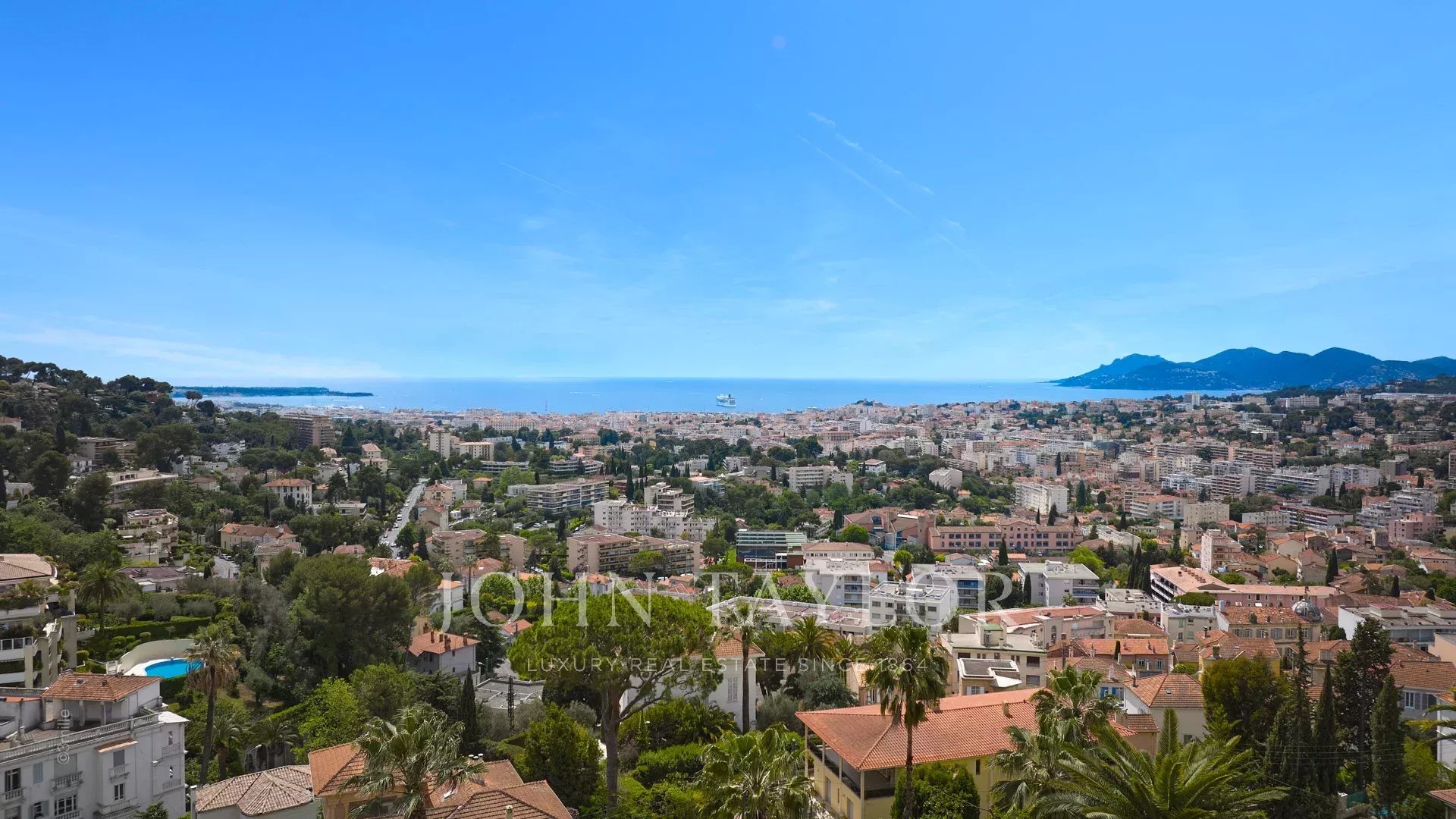 Из окон виллы, выходящих на южную сторону Каннского залива, открывается вид на море от Леринских островов до горного массива Эстерель.