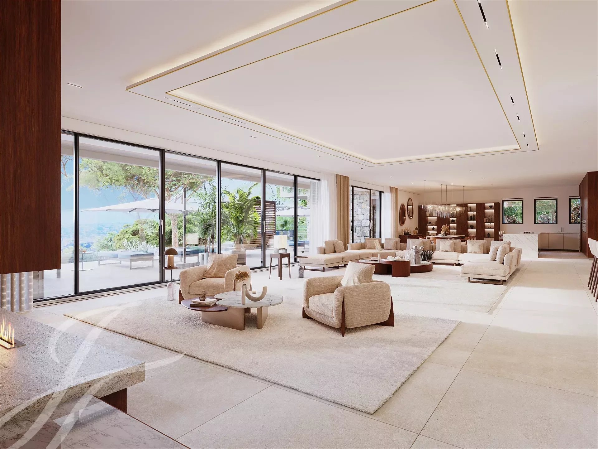 Жилая площадь около 327 м² включает в себя большую гостиную, столовую, кухню, подсобное помещение, холодильную камеру, бар и винный погреб, гардеробную и туалет. Терраса с подогреваемым бассейном 15 м x 5 м, домик у бассейна с кухней и душем + туалет.