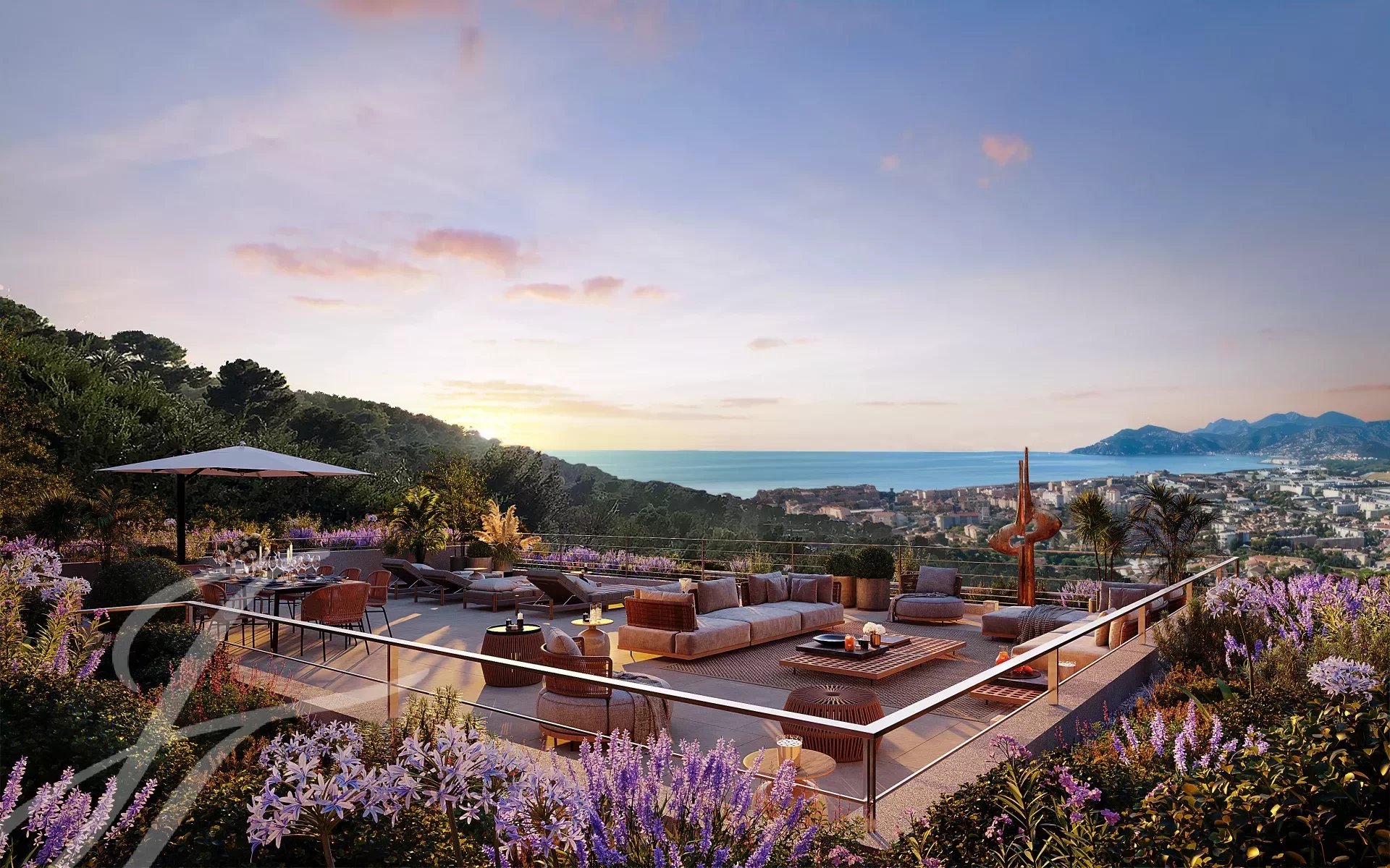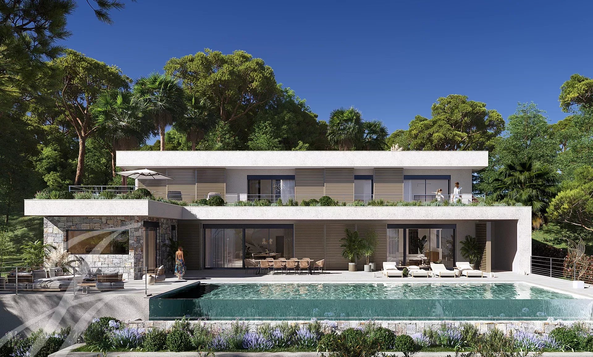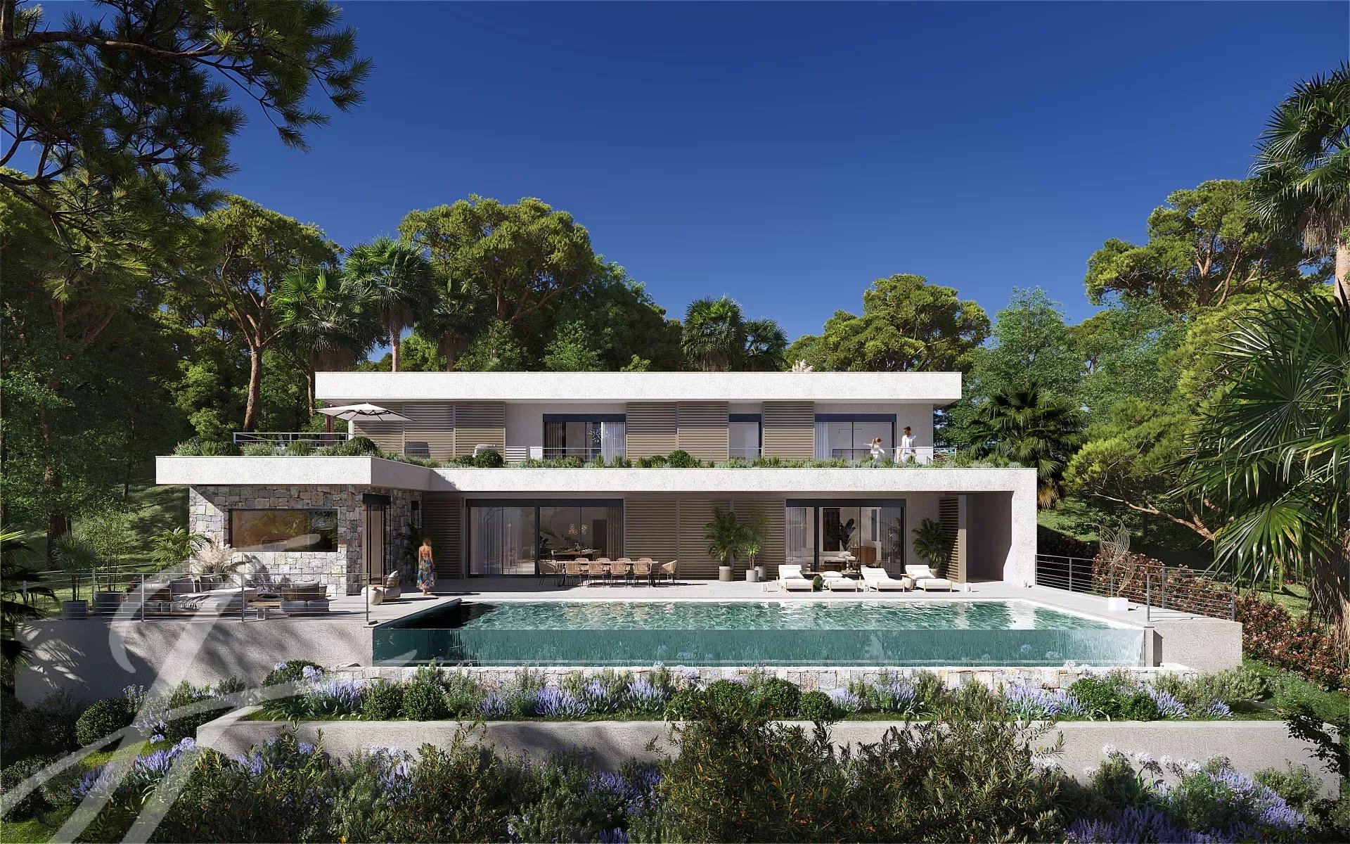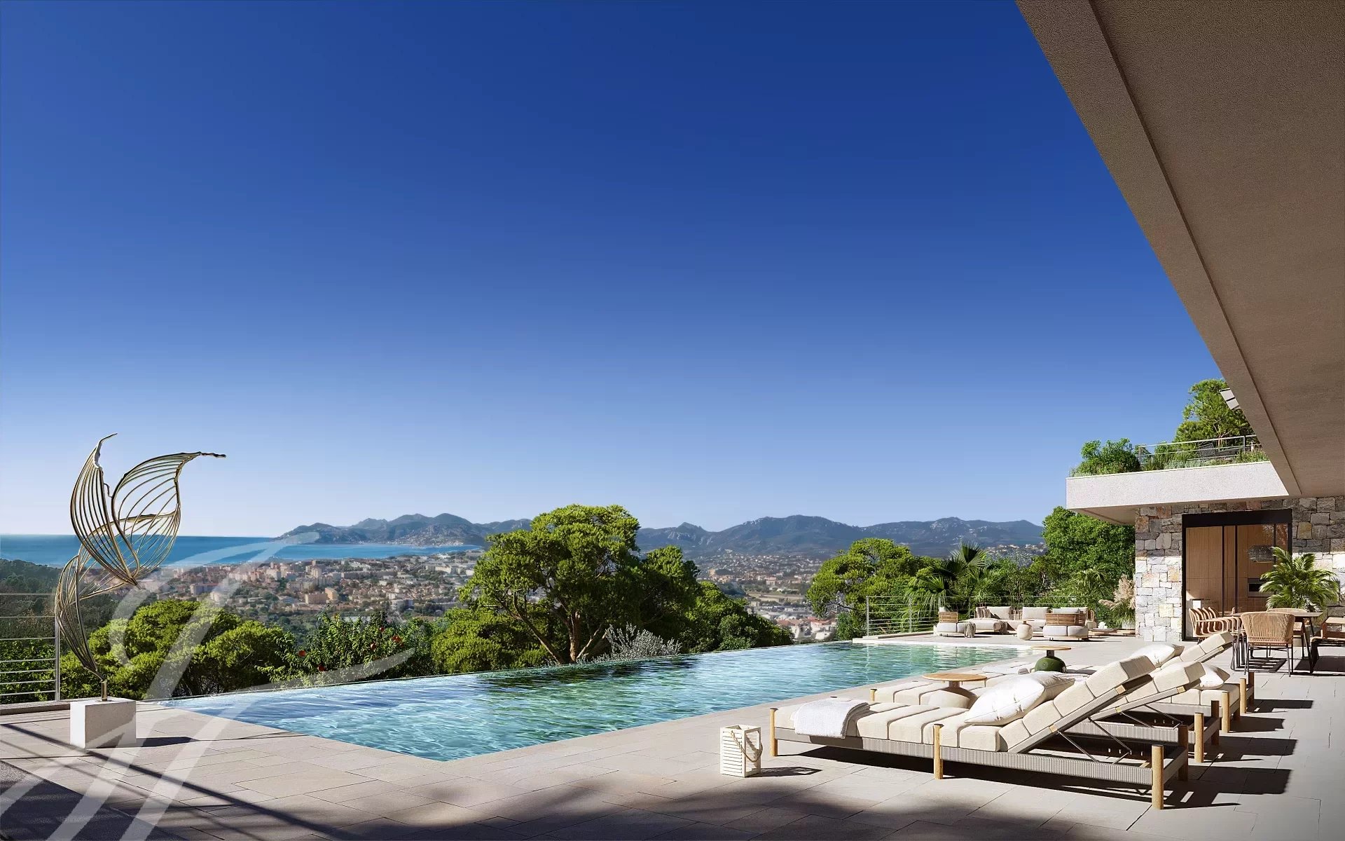 Расположенная в частном тупике, эта роскошная современная вилла выходит на холмы над Каннами, откуда открывается захватывающий вид на море и холмы Эстерель.