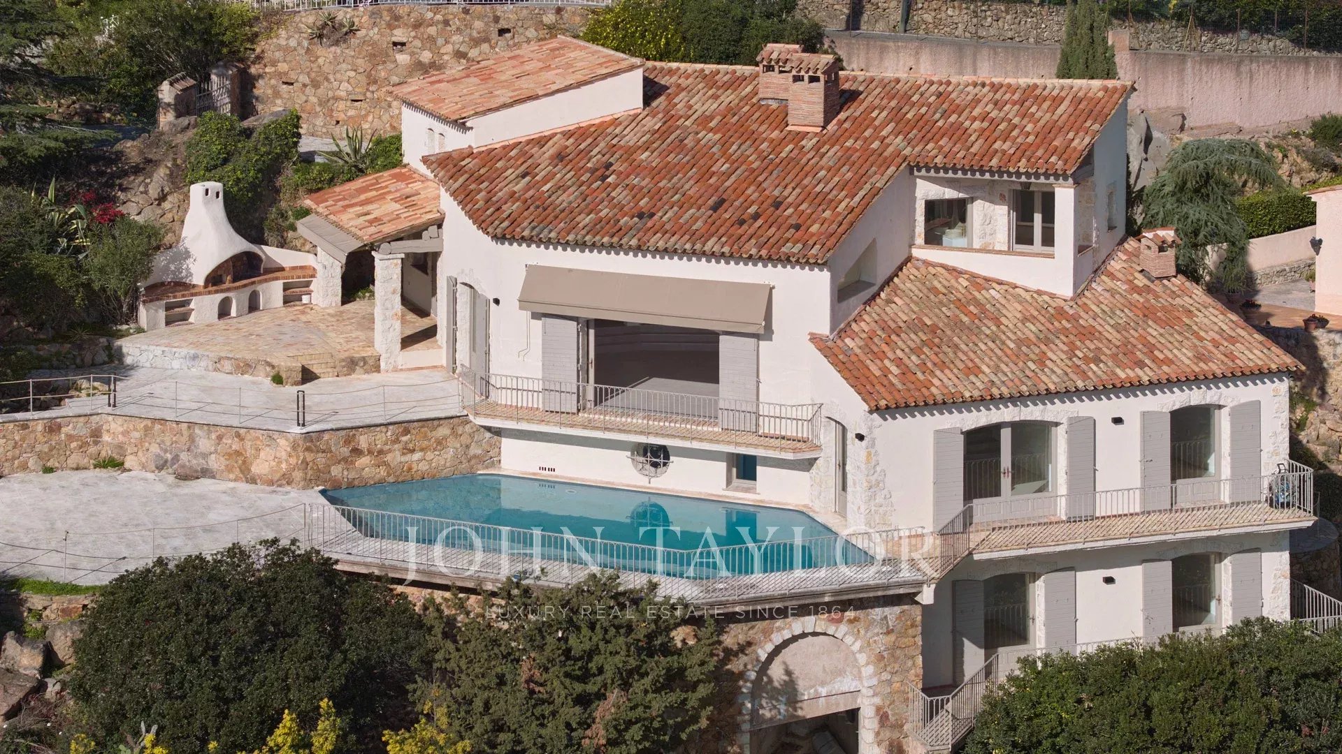 Бассейн, окруженный большими террасами и зоной барбекю.