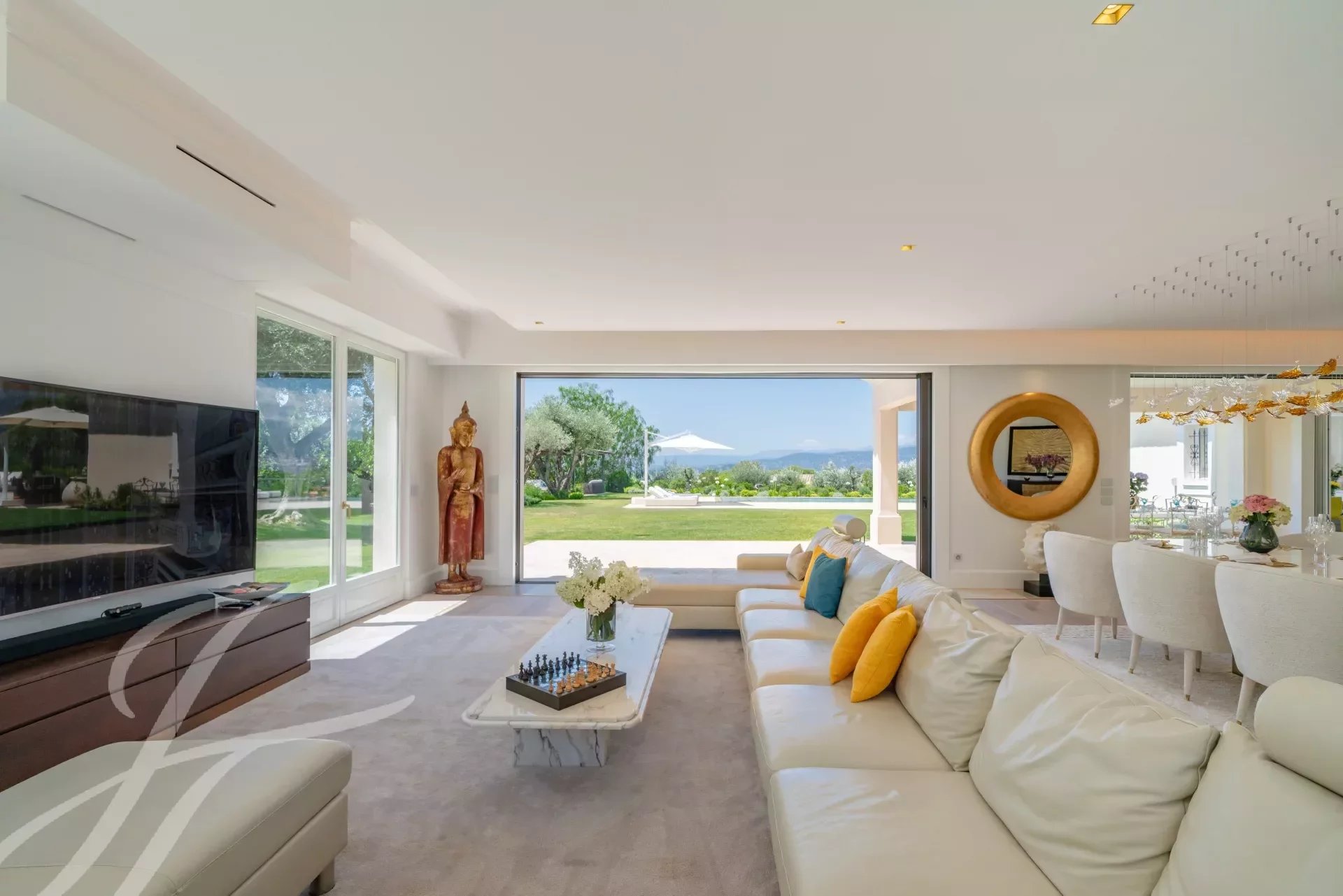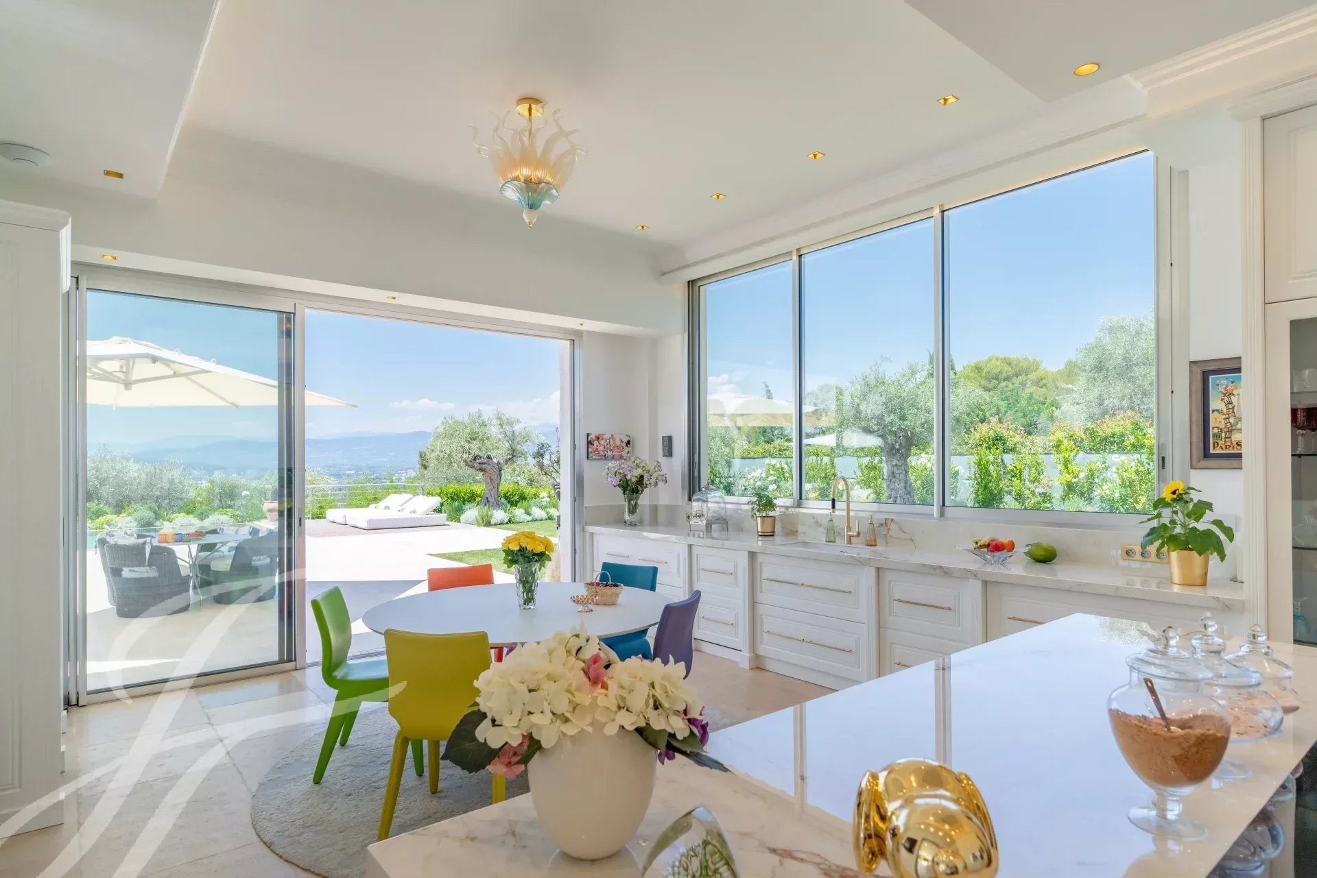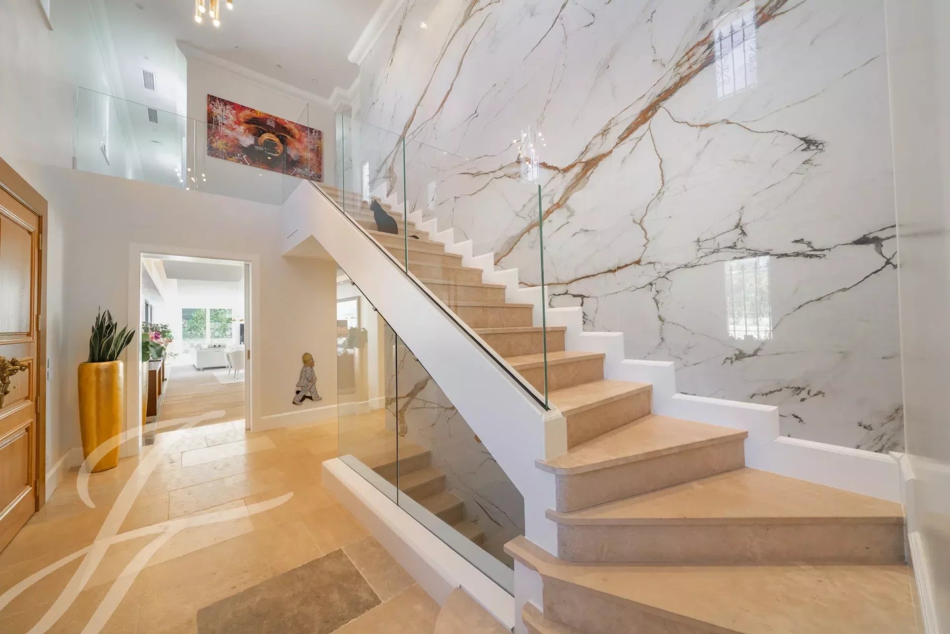 Главный вход в дом включает в себя двойные двери из массива дуба ручной работы, открывающие великолепный вестибюль двойной высоты, подчеркнутый 6-метровой мраморной стеной Calacatta. Из гостиной и столовой открытой планировки площадью 108 м2 открывается великолепный панорамный вид на холмы и горы Приморских Альп с углом обзора 270 градусов.