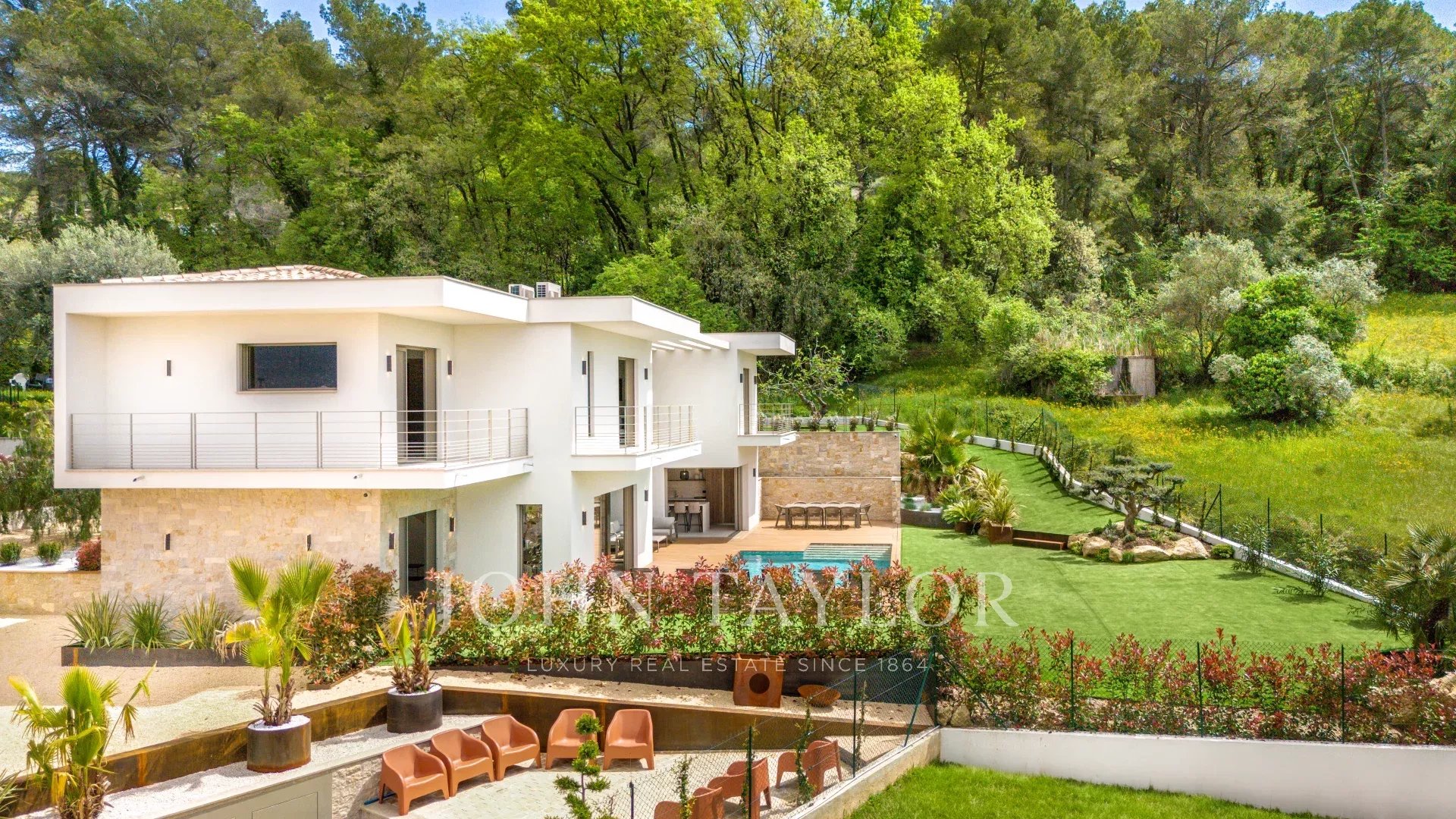 На участке площадью 1 572 м² с элегантным бассейном и парковкой установлены кондиционеры для полного комфорта в любое время года. Гостевой дом площадью 85 м² завершает ансамбль, идеально подходящий для уединенных развлечений.