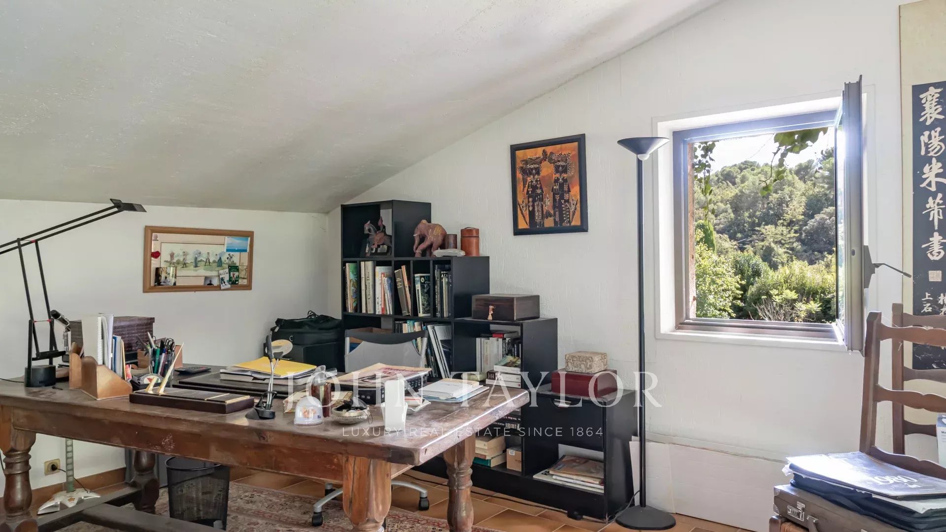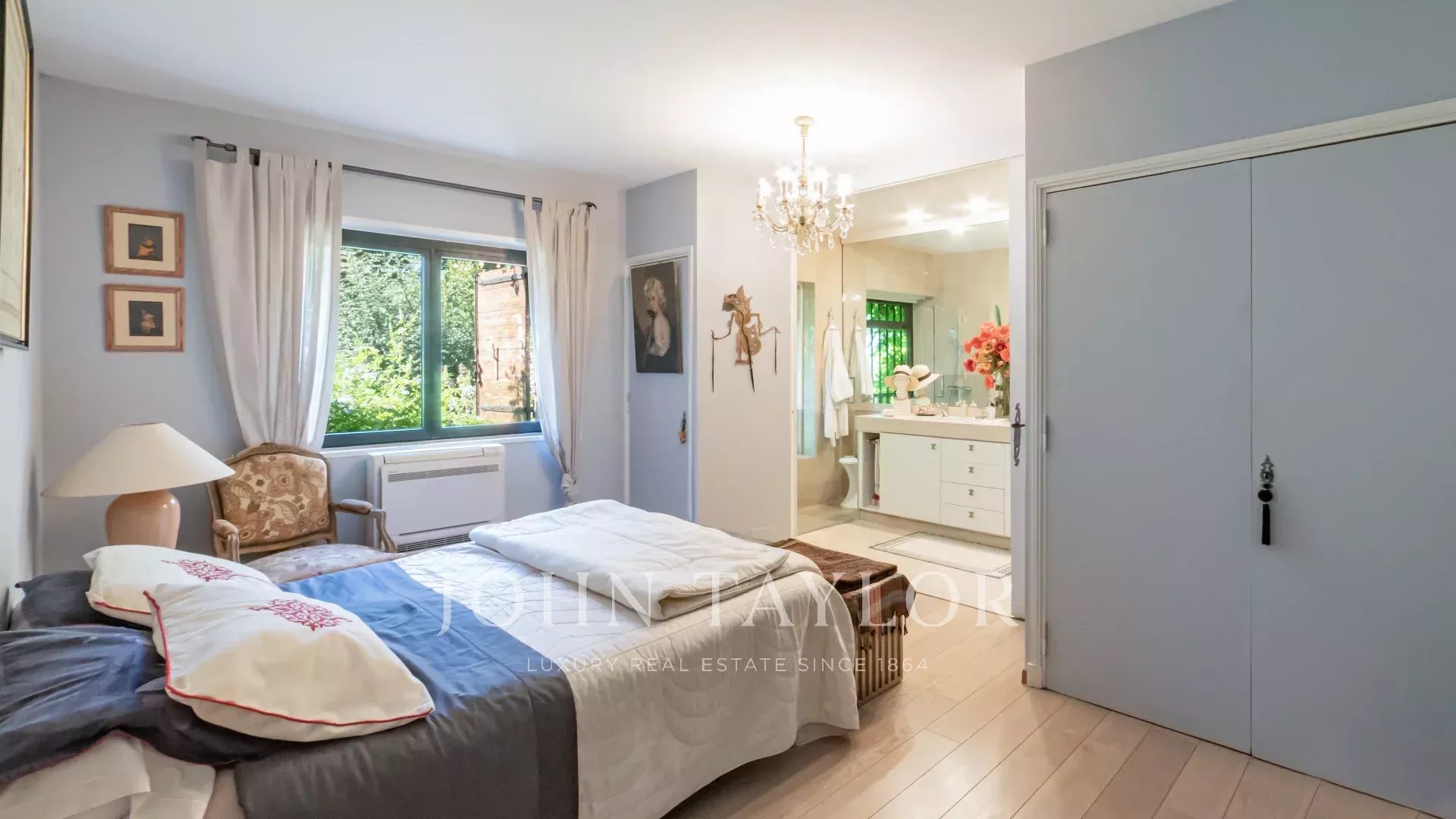 Из просторной прихожей со встроенными шкафами можно попасть в светлую кафедральную гостиную с камином и прекрасным видом на старую деревню Мужен. Гостиная переходит в уютную столовую и полностью оборудованную отдельную кухню. Гостевой туалет и первая спальня со встроенными шкафами и собственной душевой комнатой завершают этот уровень.