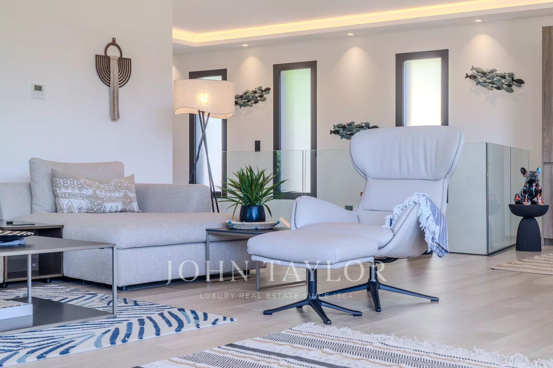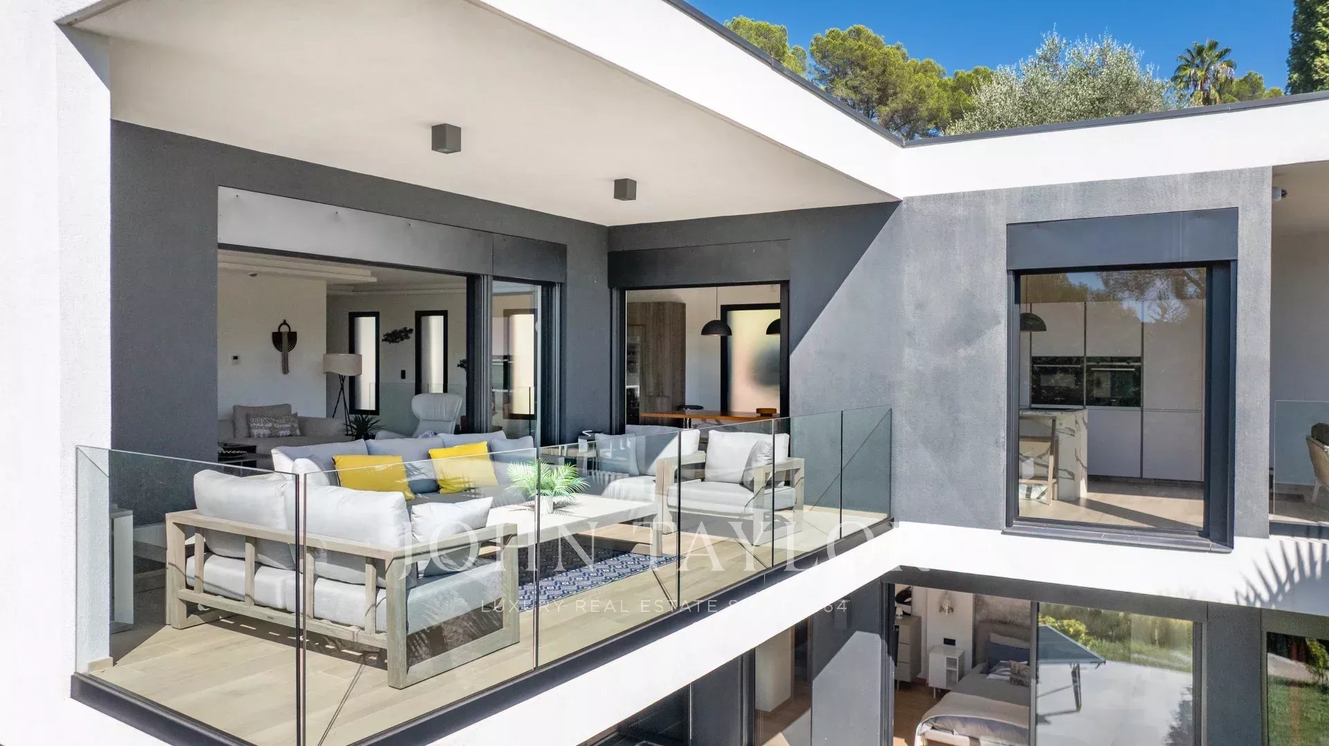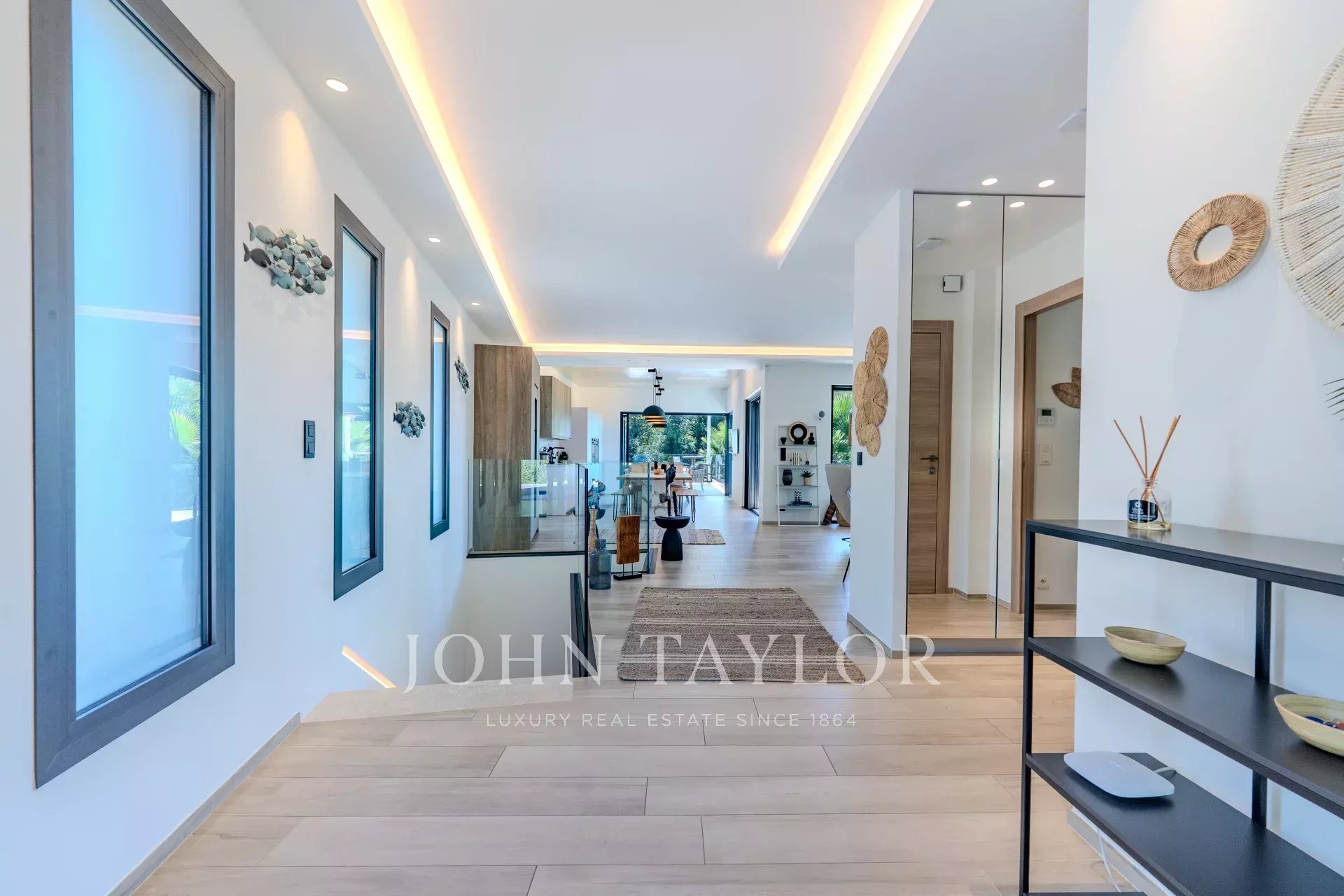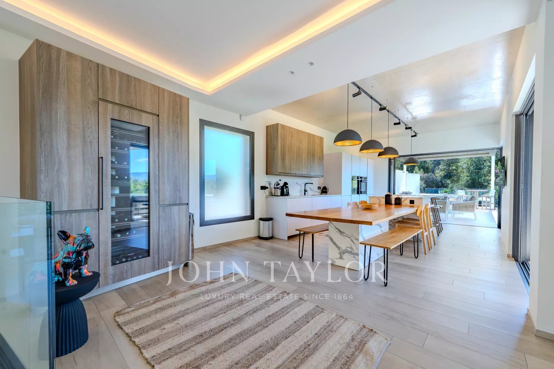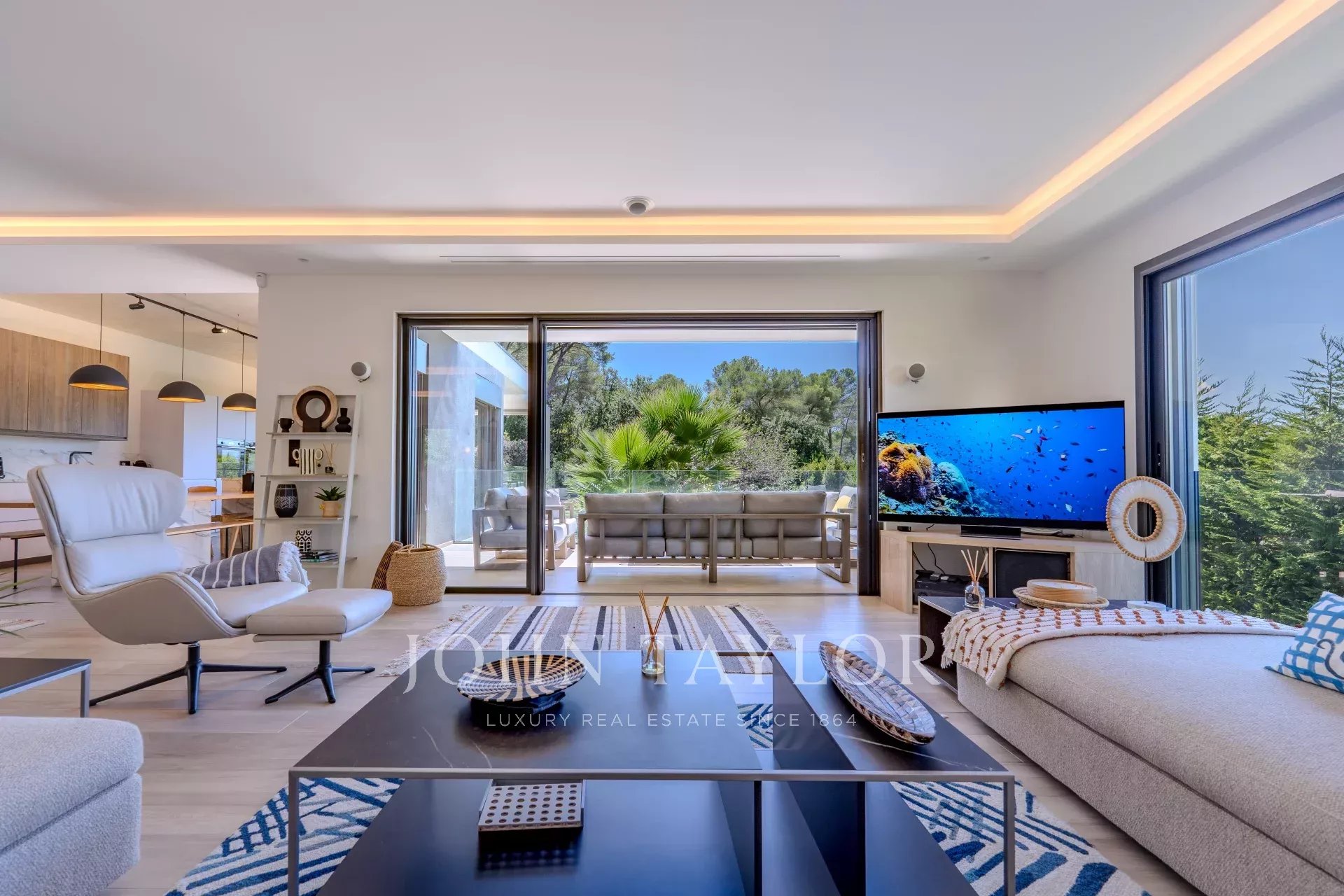 Внутри вилла предлагает великолепную, наполненную светом гостиную, открытую на улицу благодаря большим эркерам, которые естественным образом расширяют пространство, выходящее на террасу и бассейн.