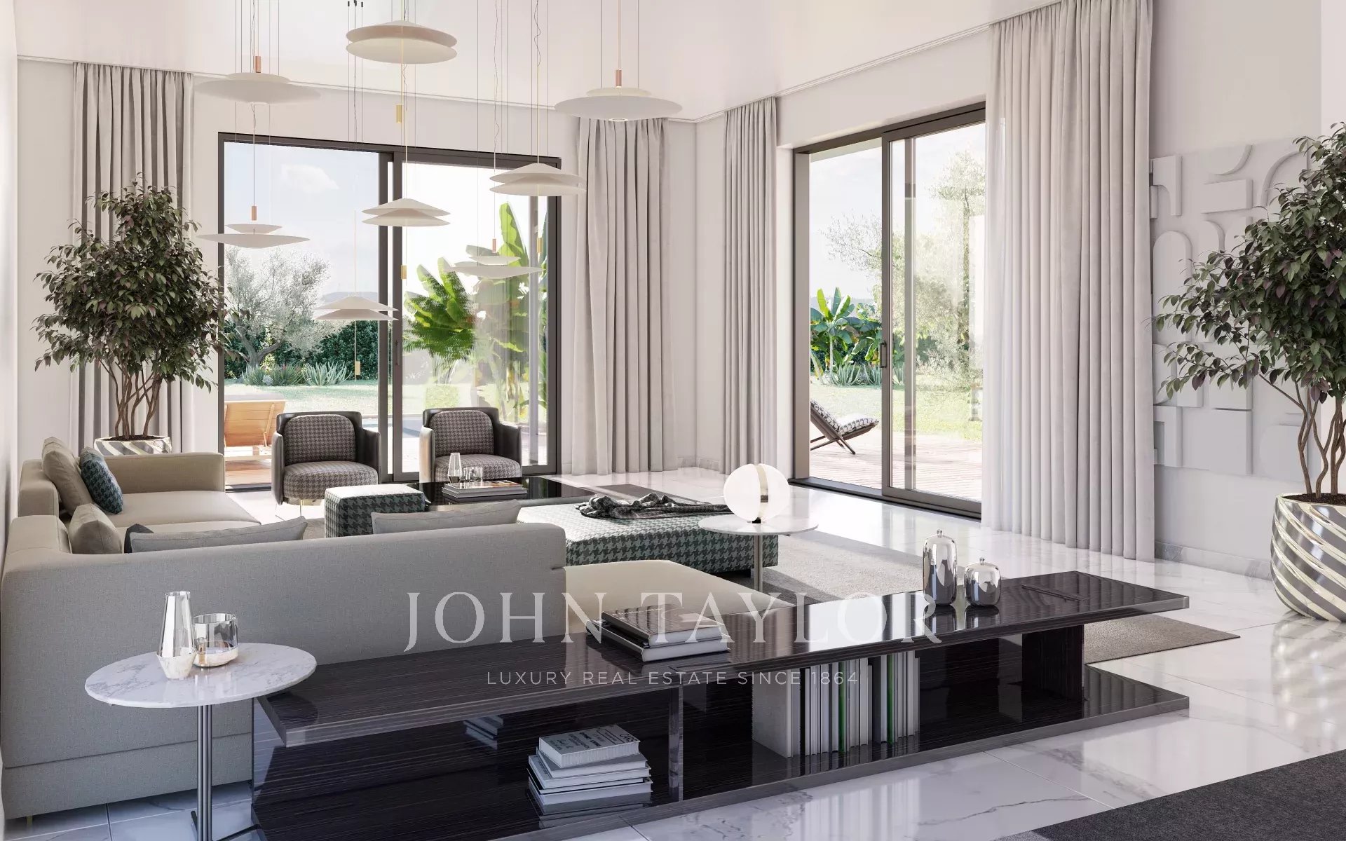 Двойной гараж с прямым доступом к вилле, бассейн и ландшафтные сады завершают ансамбль.