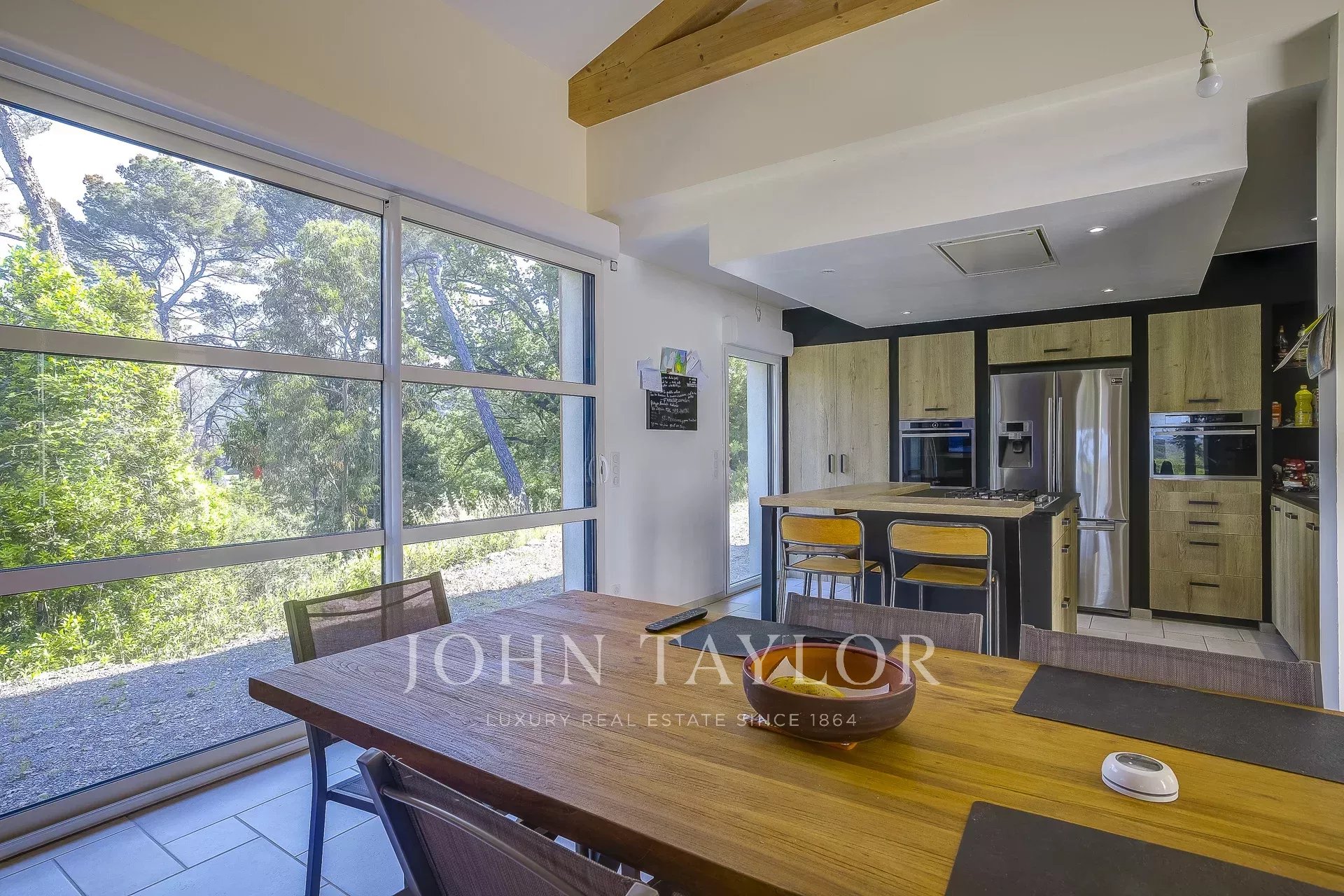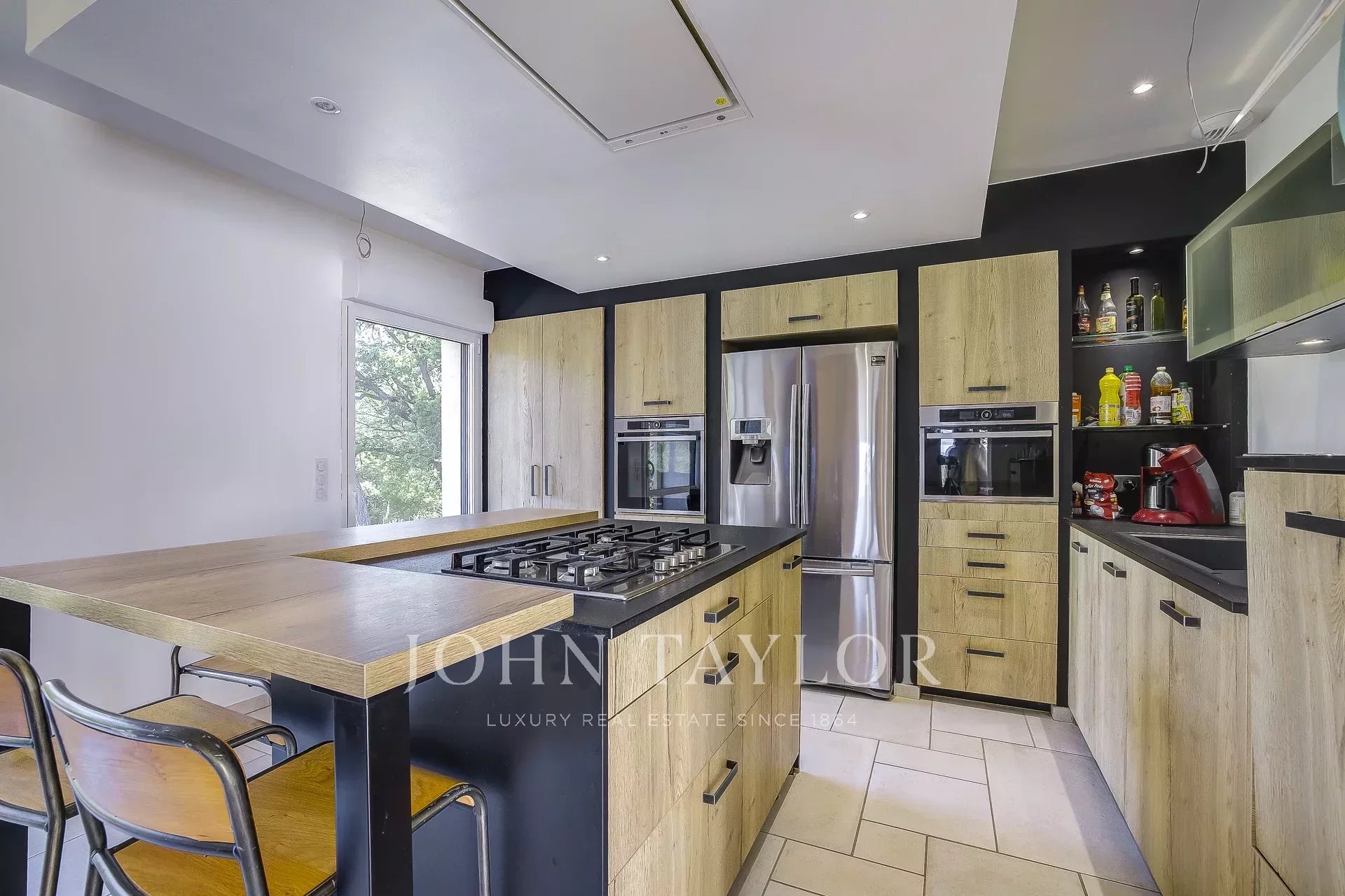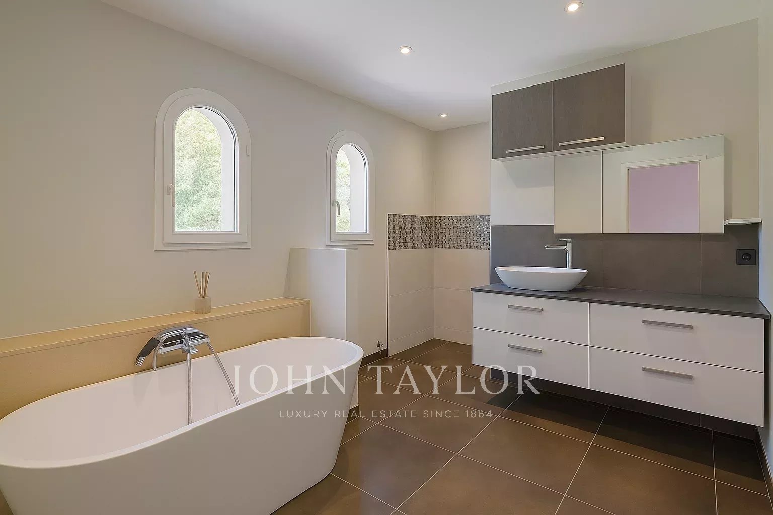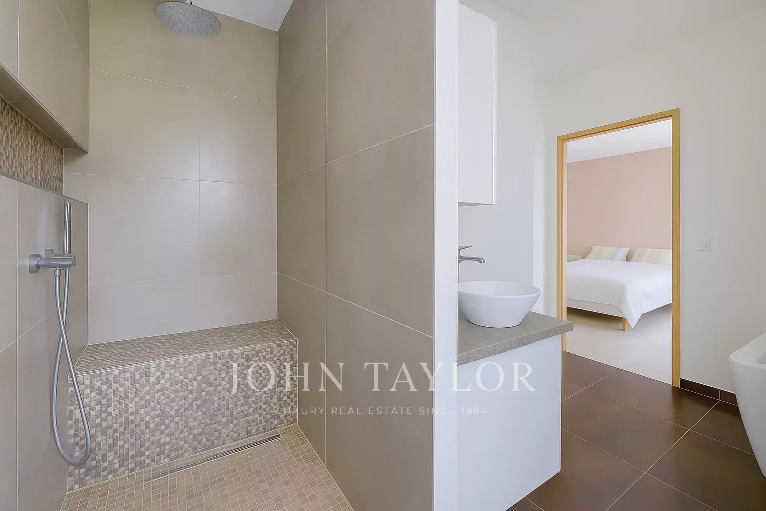 С момента входа в виллу вы будете очарованы ее огромными объемами. Зона для приема гостей площадью 70 м² построена вокруг соборной гостиной и элегантной кухни открытой планировки, приглашая вас собраться вместе. Это пространство гармонично выходит во внешний мир.