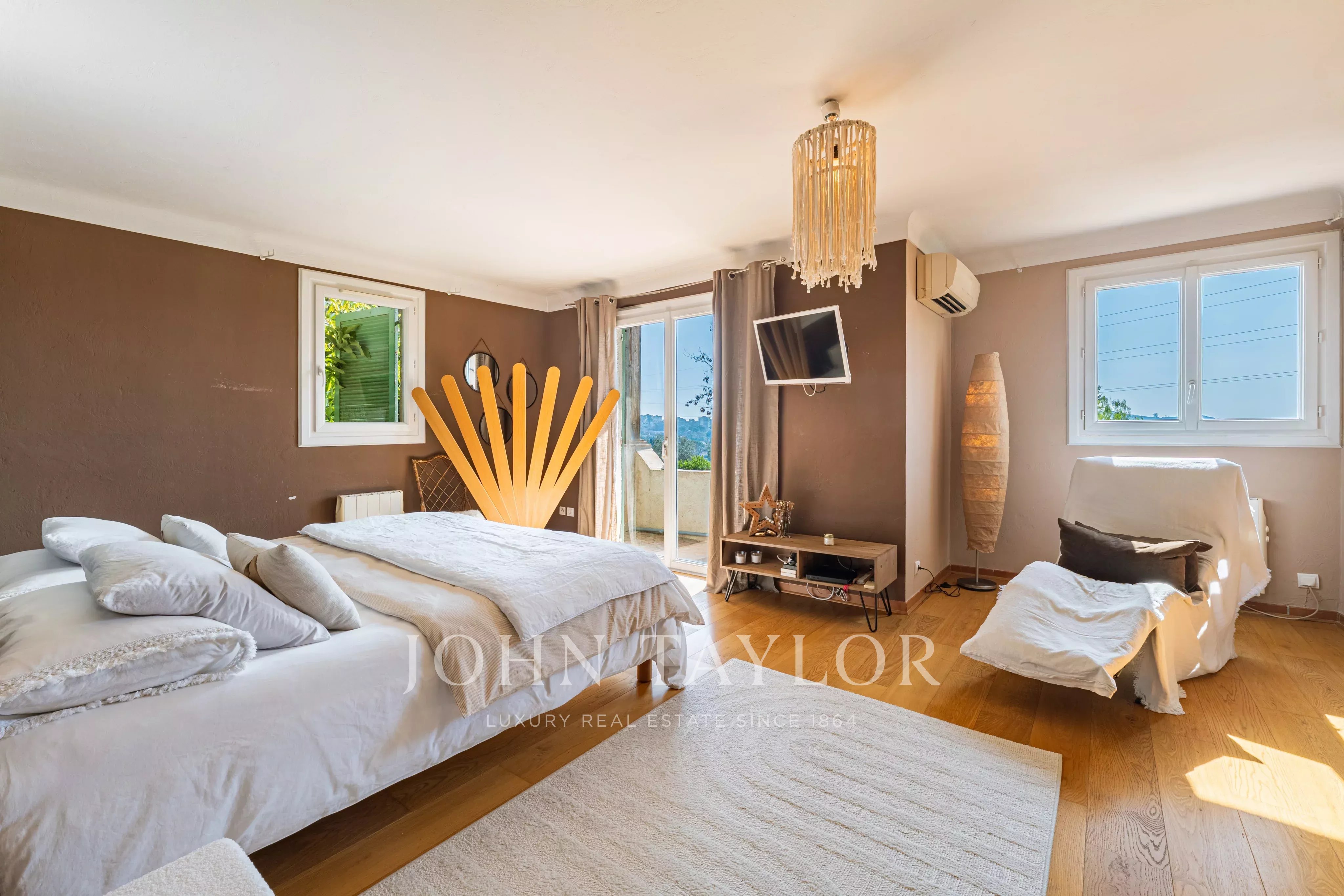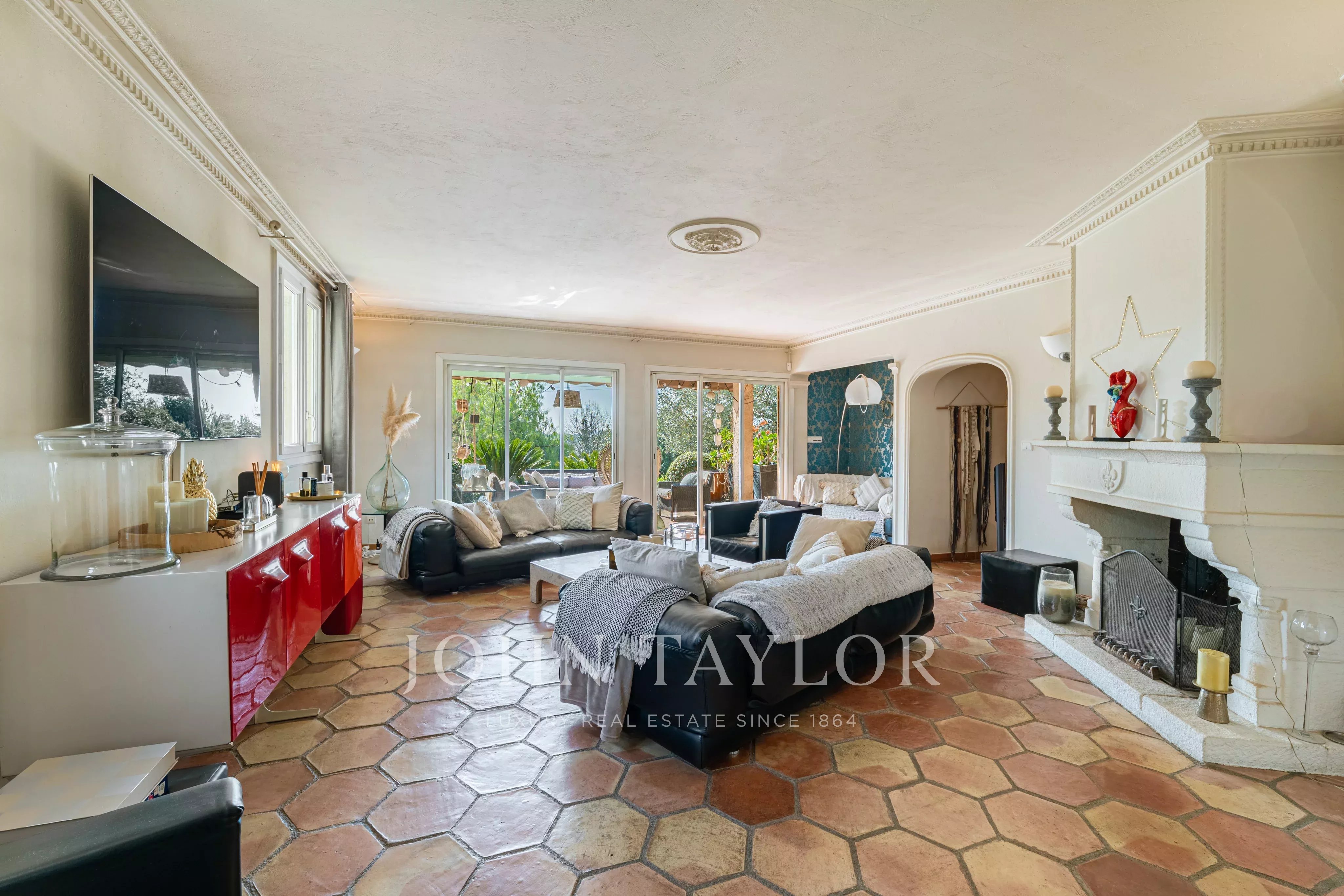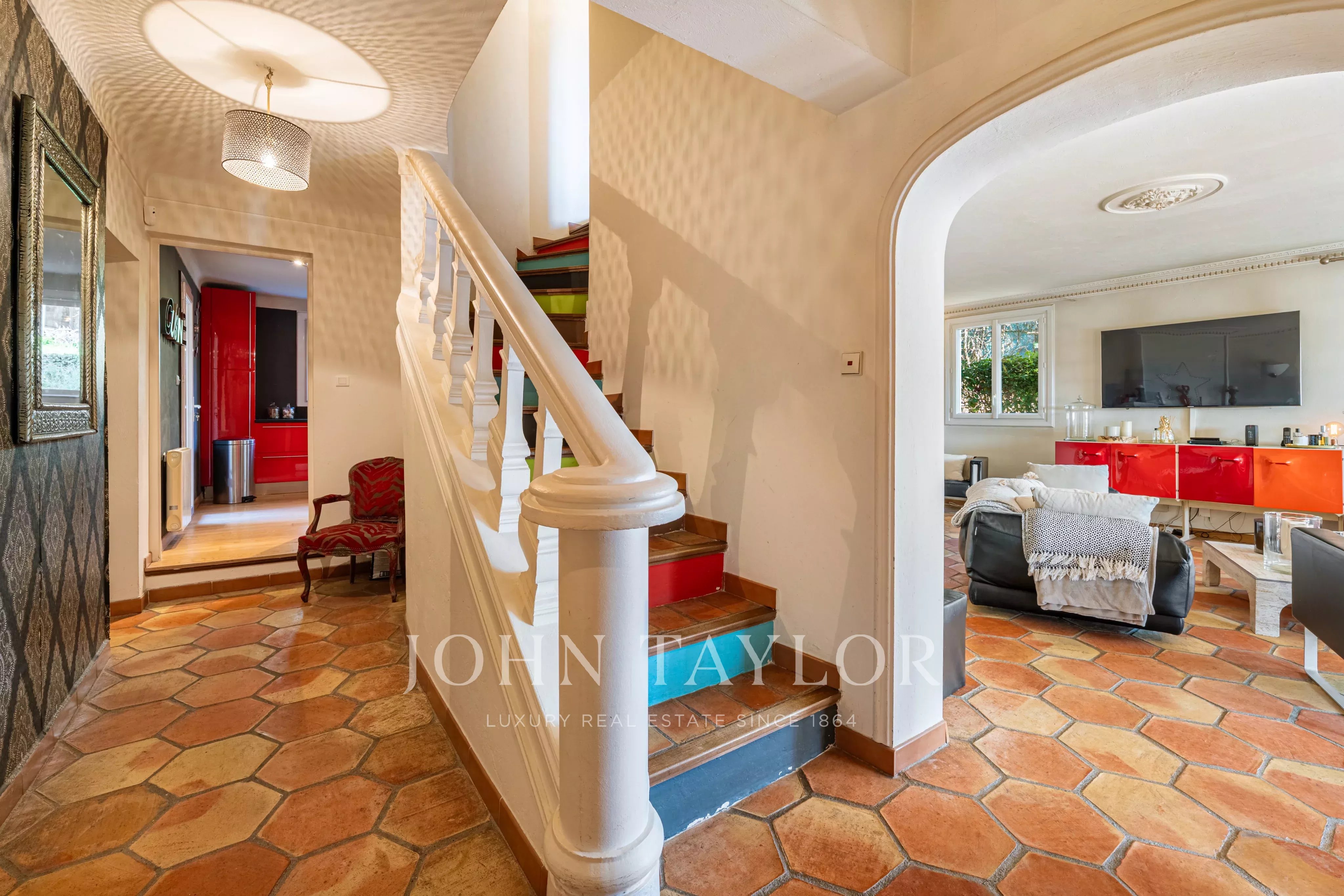 Эта элегантная вилла площадью около 220 м² расположена в конце тупика в престижном жилом районе и имеет южную ориентацию, доминирующее положение и быстрый доступ к Каннам.