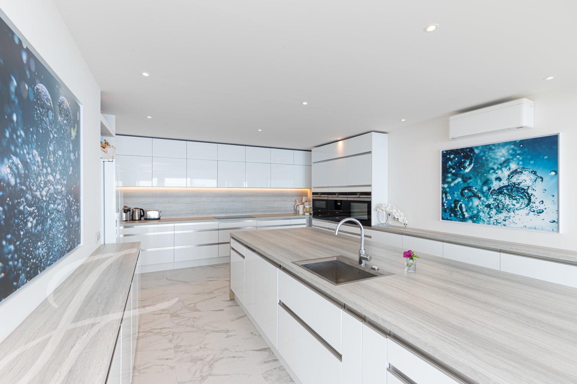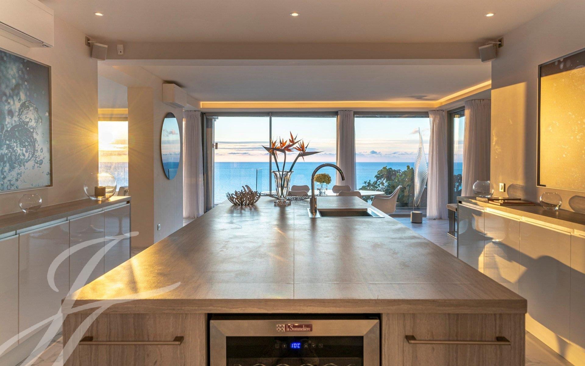 Вход в тройную гостиную, включающую телевизионную комнату с камином (двусторонняя вставка), вторую гостиную, столовую, полностью оборудованную кухню открытой планировки, выходящую на террасу с видом на море.