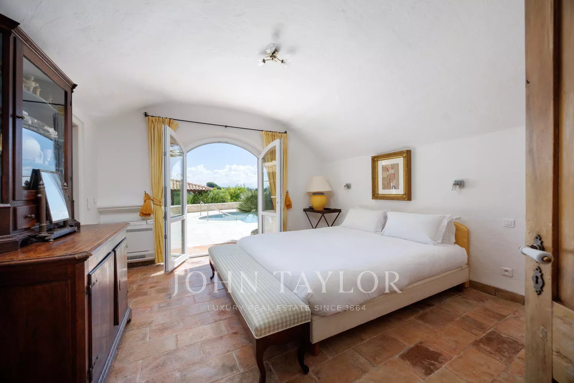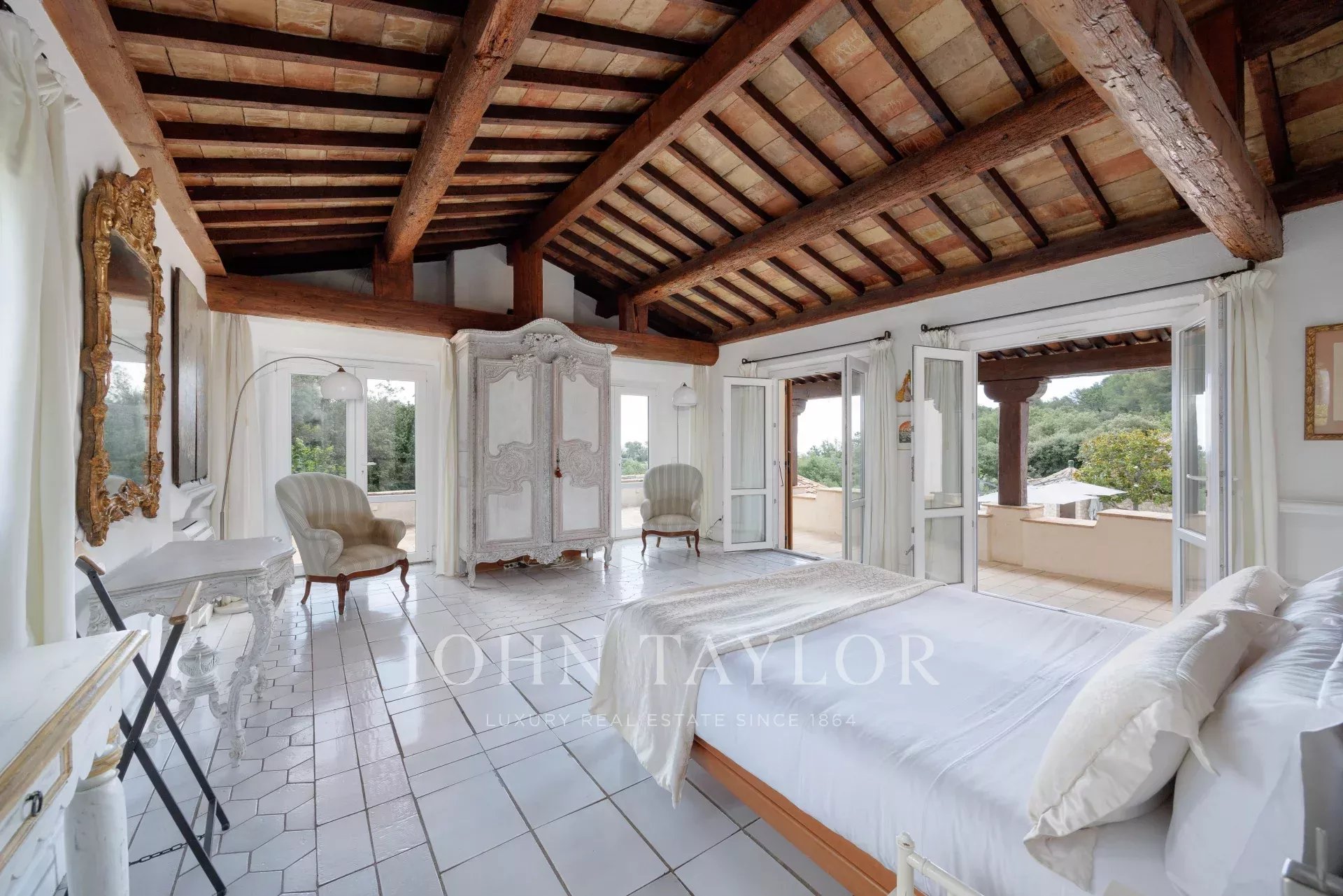 Вилла включает в себя элегантную прихожую, просторную кухню-столовую с камином, выходящую на крытую террасу и к бассейну, двойную гостиную с баром и бильярдным столом, кабинет и вторую светлую гостиную с камином. Ночью жилое пространство дополняют главная спальня и четыре спальни, каждая с собственной душевой комнатой. Холодильная комната, прачечная, несколько подвалов и навес для 4-6 автомобилей с мастерской завершают усадьбу.