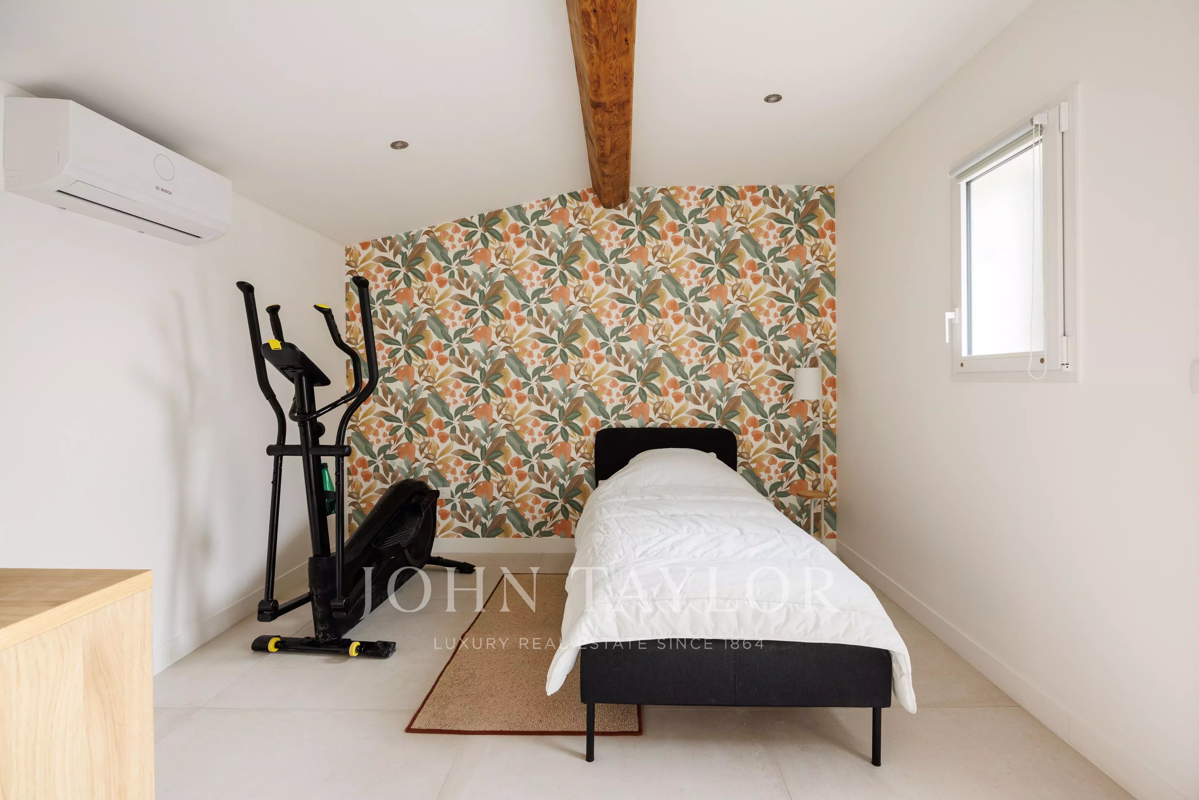 Полностью отремонтированный одноэтажный дом, расположенный в тихом жилом районе с панорамным видом на деревню Сен-Поль-де-Ванс, занимает площадь 281 м² на участке площадью около 2 120 м². В доме шесть спален, включая отдельную квартиру с 3 спальнями, бассейн и гараж.
