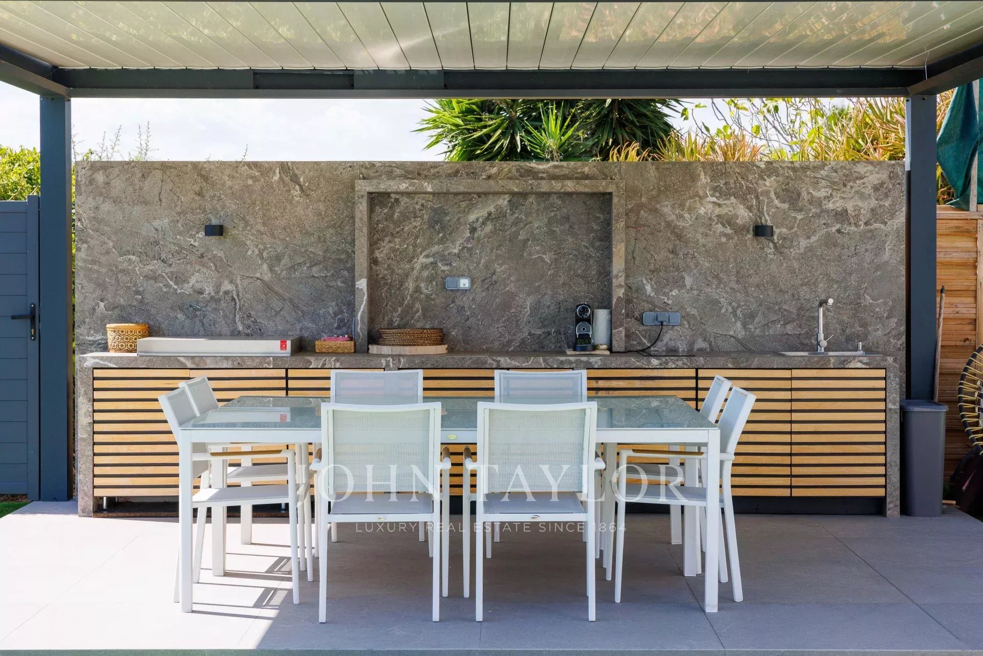 Сад идеально ровный и предлагает зеленое пространство вокруг бассейна и джакузи, полностью оборудованную и крытую летнюю кухню и площадку для настольного тенниса, идеальную для самых маленьких членов семьи!