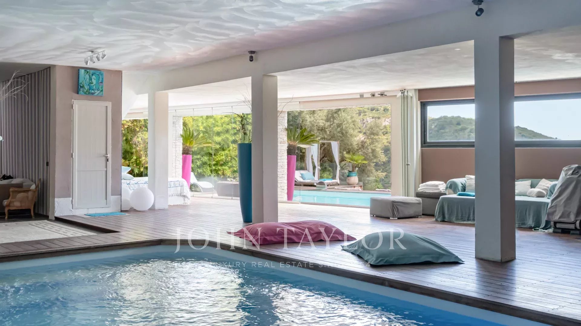 Вилла отличается огромными объемами, обилием света и этажом, полностью посвященным благополучию: крытый и открытый бассейны, соединенные большими эркерами, джакузи, зона отдыха, фитнес-зал, открытый снаружи, и хаммам площадью 45 м², который можно превратить в частный средиземноморский спа-центр.
